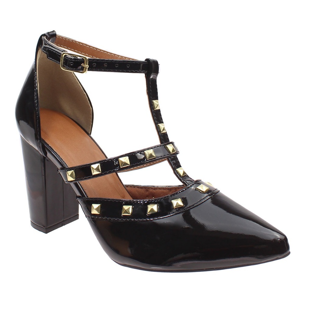 Calçados Flor de Romã Scarpin Pirâmide Verniz Preto Bloco