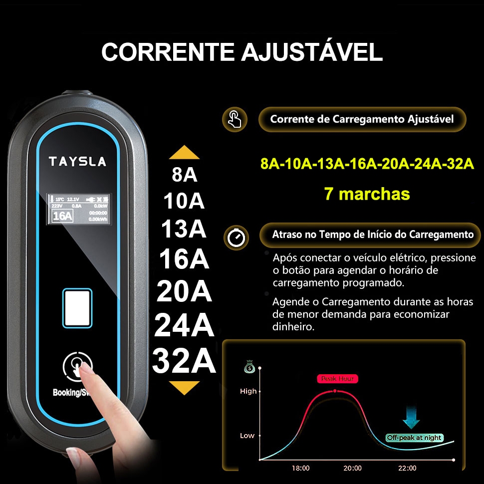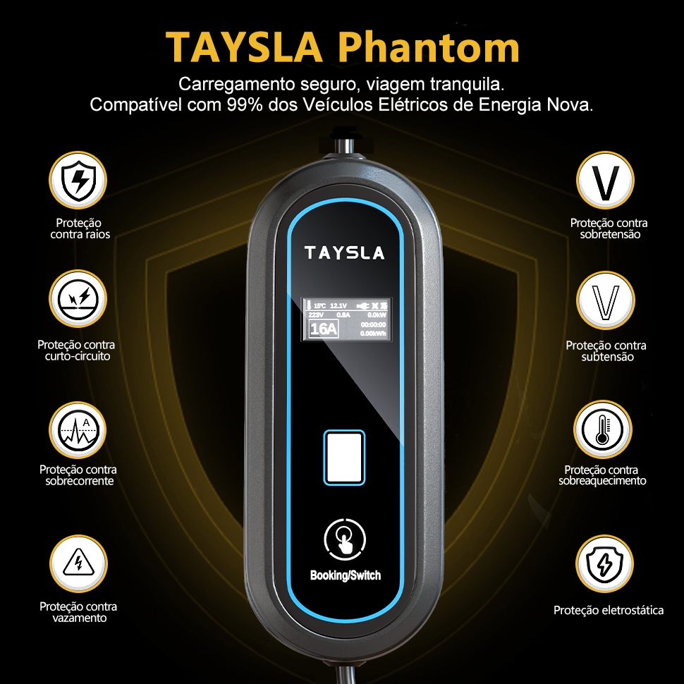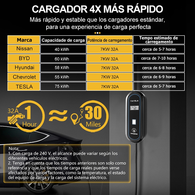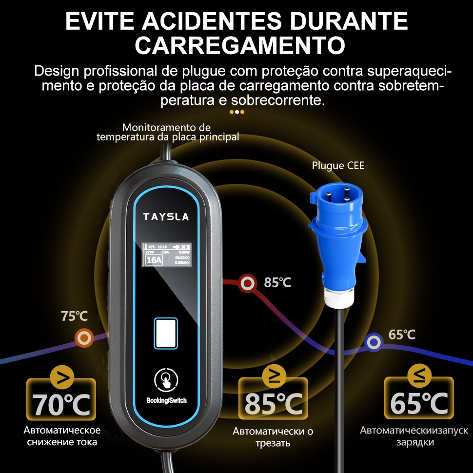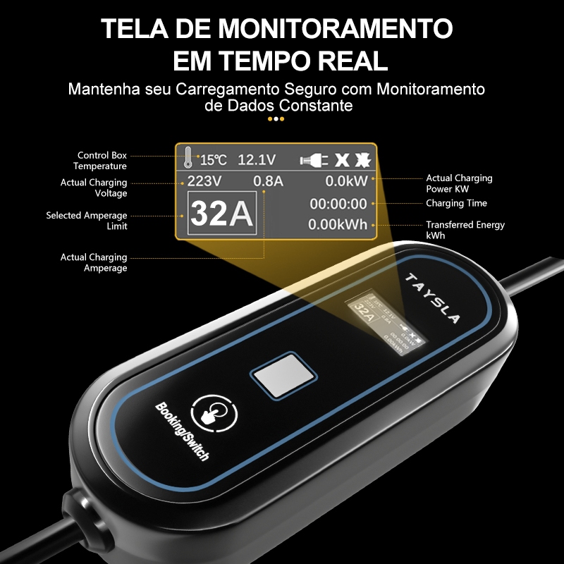 Carregador Portátil para Carro Elétrico 7KW 32A Taysla BYD, Volvo e Todas Marcas com Tipo 2 Voltagem 80-260V (110V/220V)