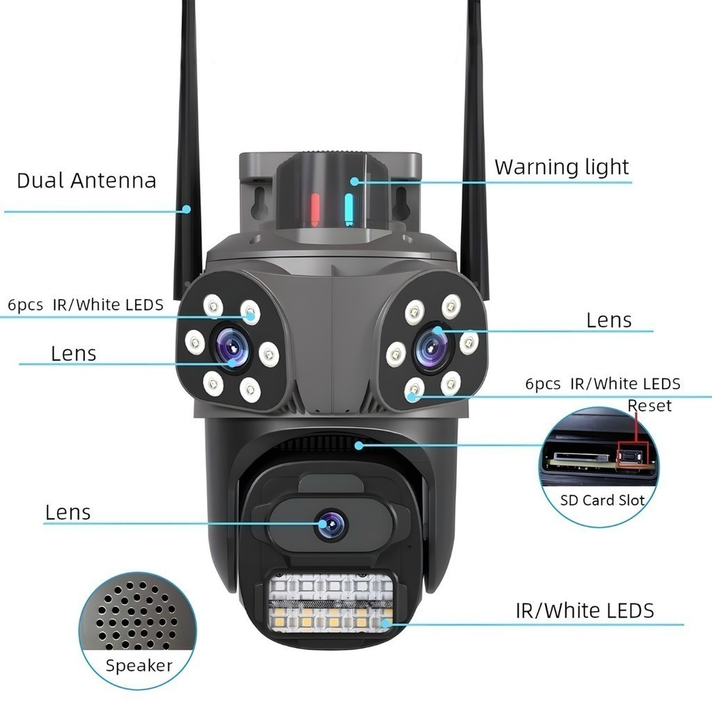 Câmera de Segurança Tripla Lente IP66 Wi-Fi 24GHz Alarme Luz Rastreamento Pessoas 360° Voz Bidirecional Visão Noturna