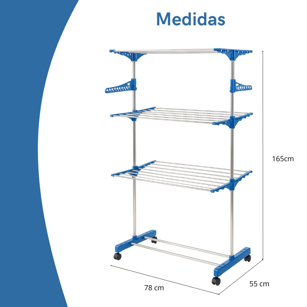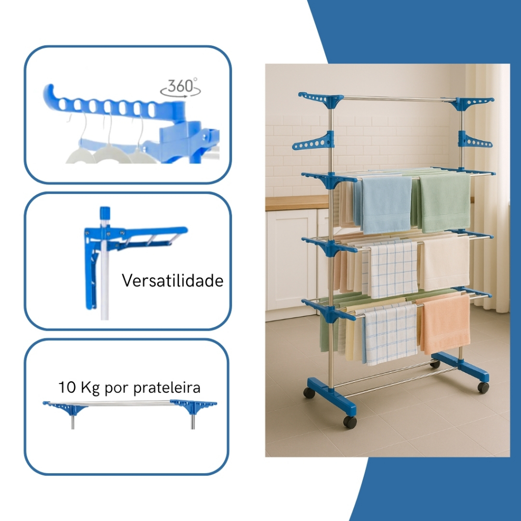Varal de Chão Dobrável 3 Andares com Rodinhas, Reforçado Retrátil, Capacidade 30 Kg Apartamento Casa Premium