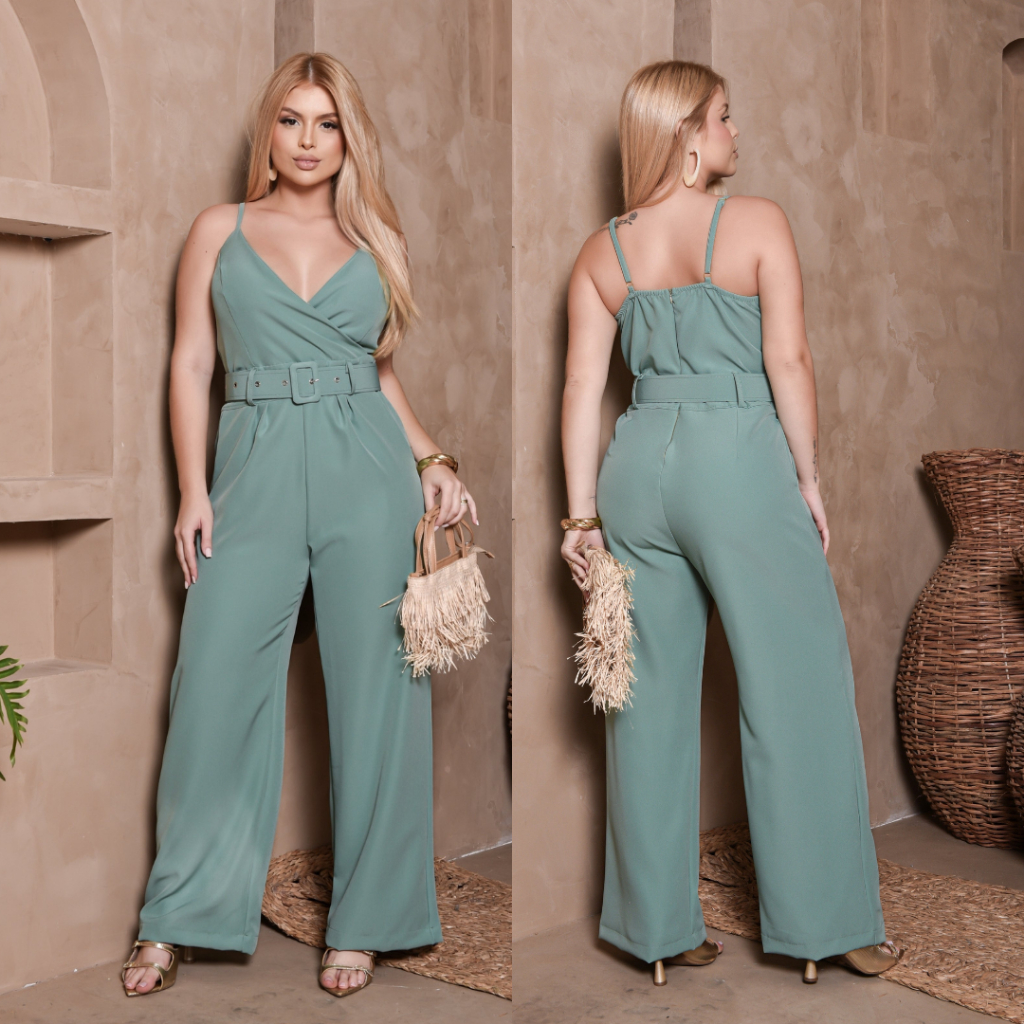 Macacão Alfaiataria Longo Feminino Pantalona com Cinto e Bolso | Alcinha Decote V Social Festa Moda Blogueira