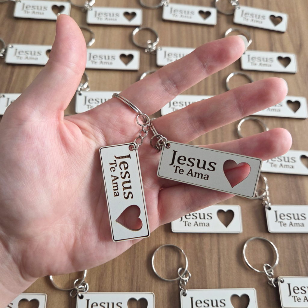 100 Chaveiros Jesus te Ama com Coração Vazado em Mdf Branco Lembrancinha Religiosa Fé Igreja confraternizaçao seia