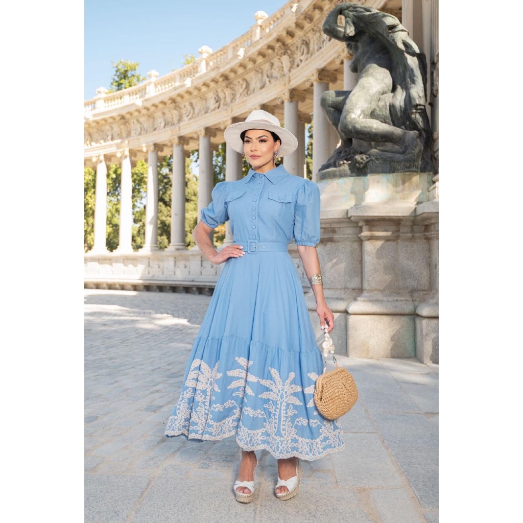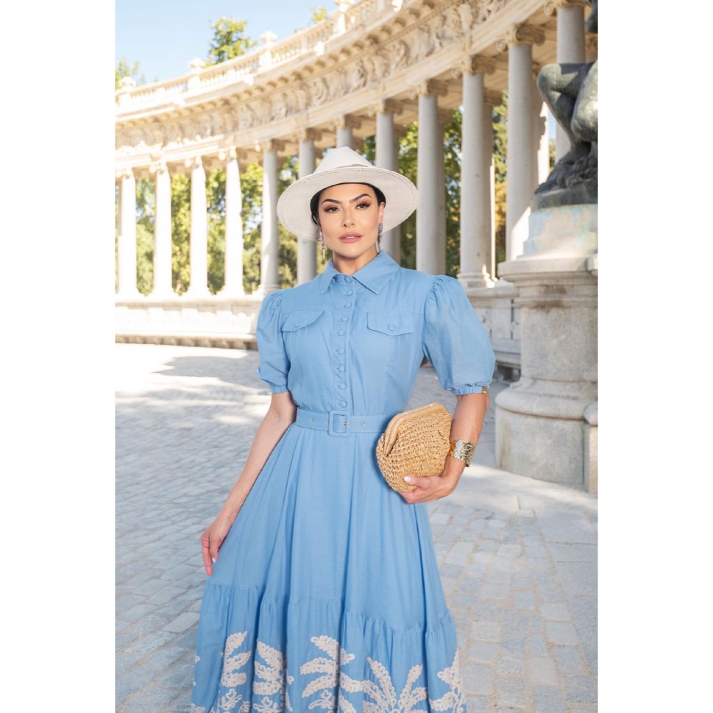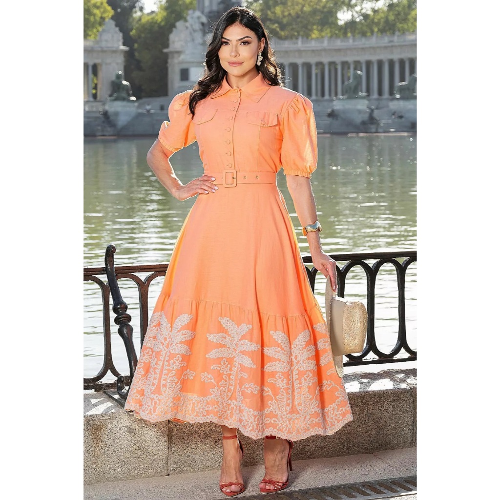 Vestido Midi Evangélico Eloá Verão Bordado c/ Cinto e Botões Gola Alfaiataria Festa Madrinha CN