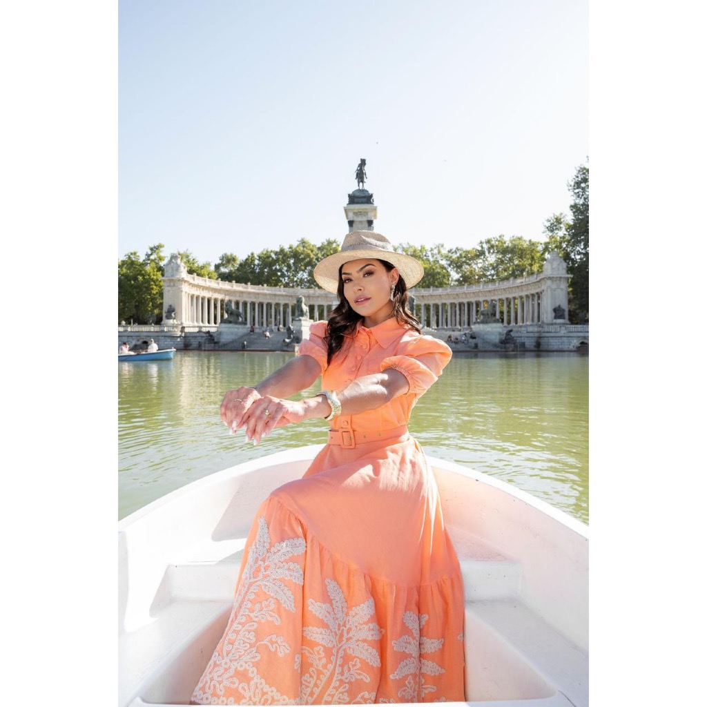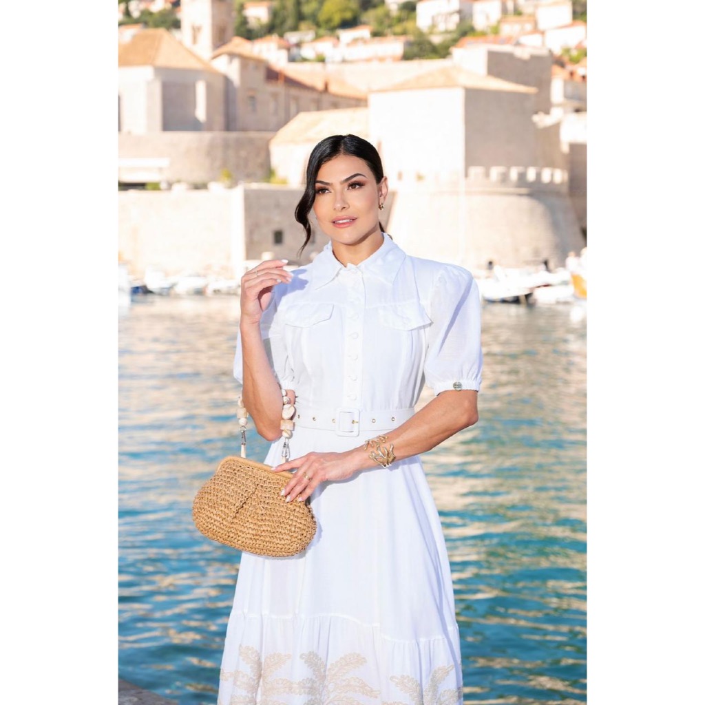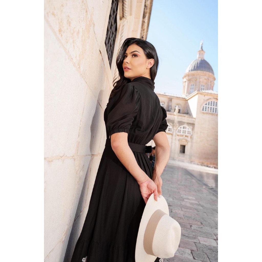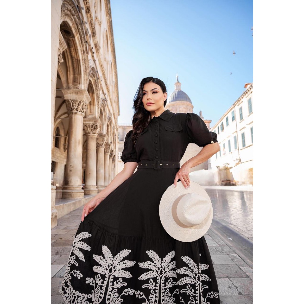 Vestido Midi Evangélico Eloá Verão Bordado c/ Cinto e Botões Gola Alfaiataria Festa Madrinha CN