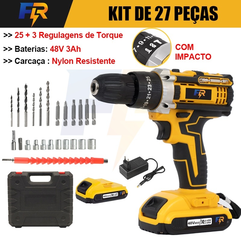 Parafusadeira Furadeira de Elétrica Sem Fio Impacto 48V Bateria 3 funções Kit Completo Acessórios