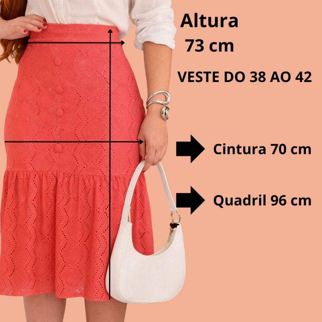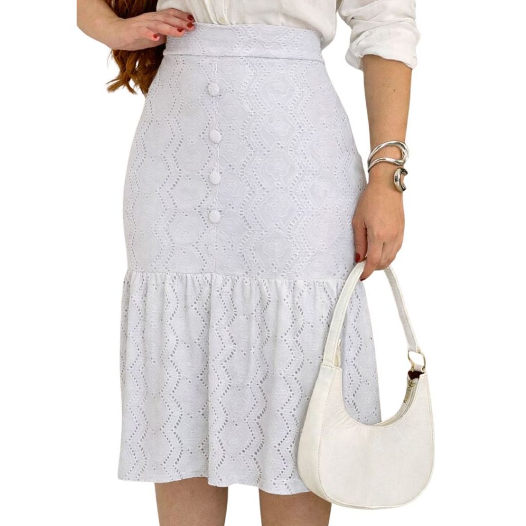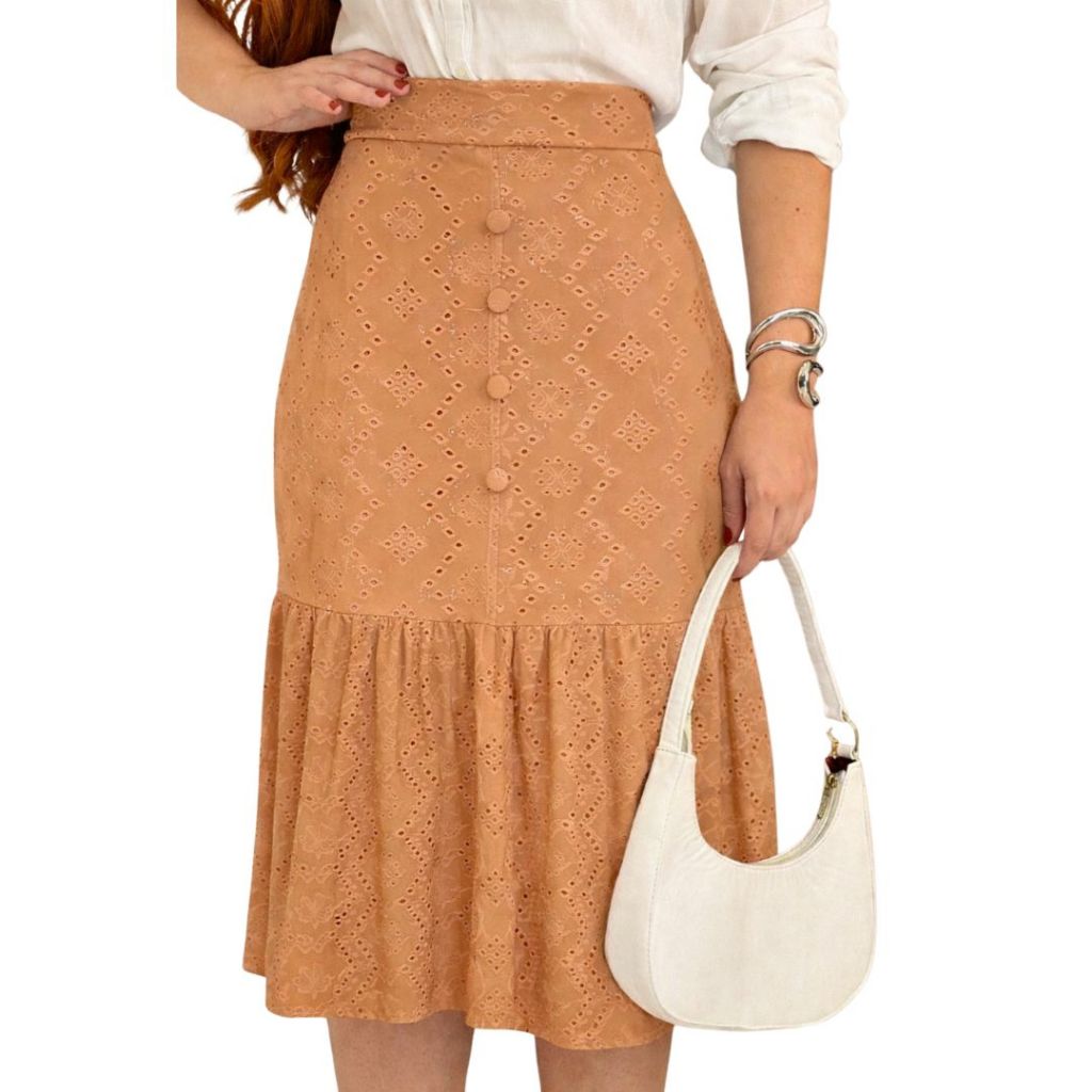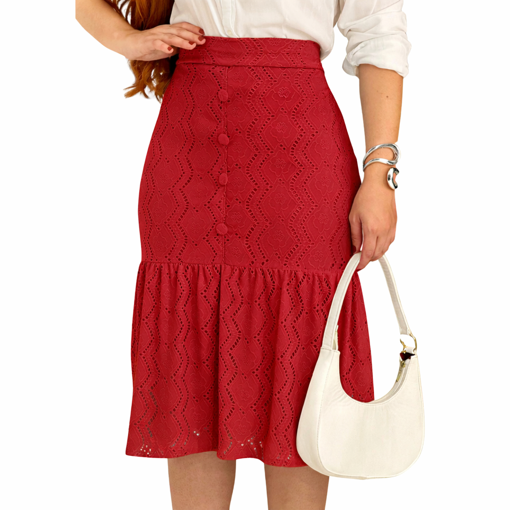 Saia Feminina Midi em Laise com Botões Frontais Forrada Casual Elegante