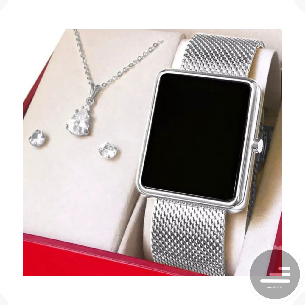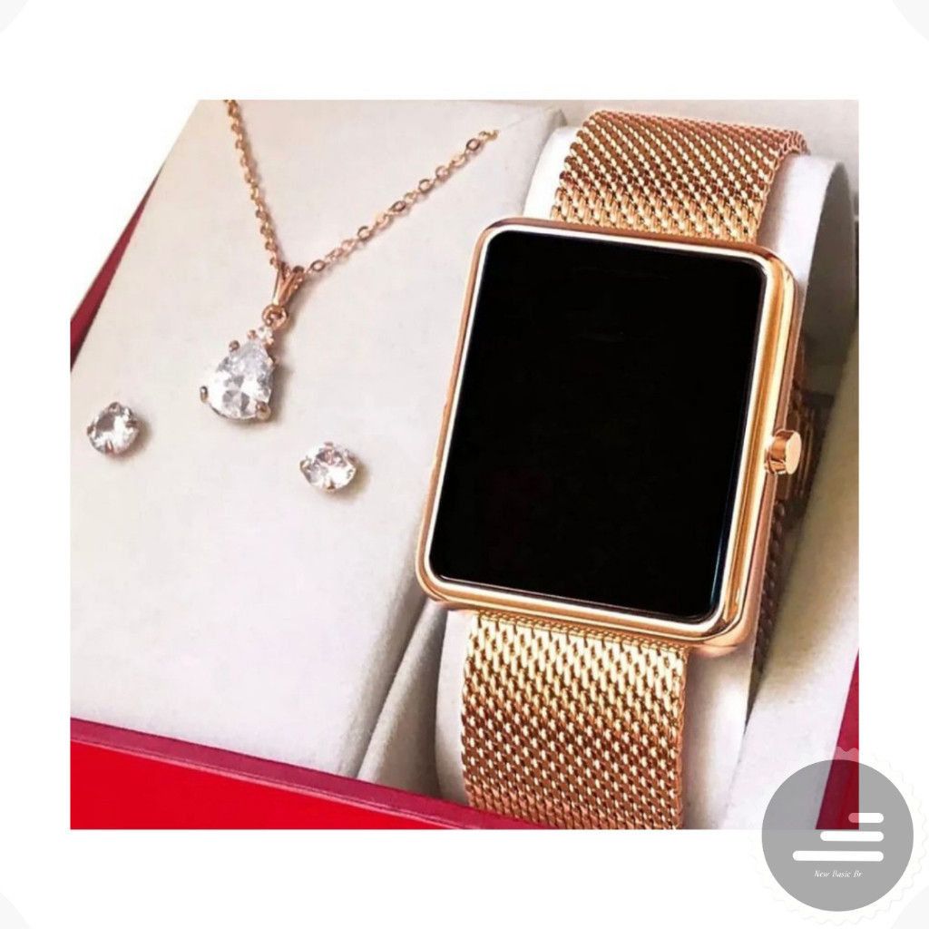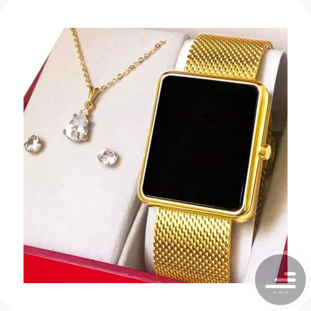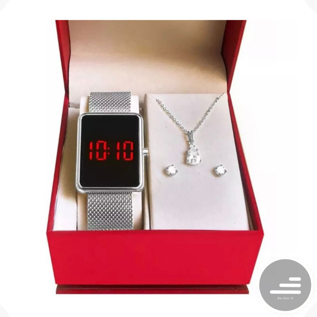 Relógio Feminino de Led Quadrado + Colar e Brinco