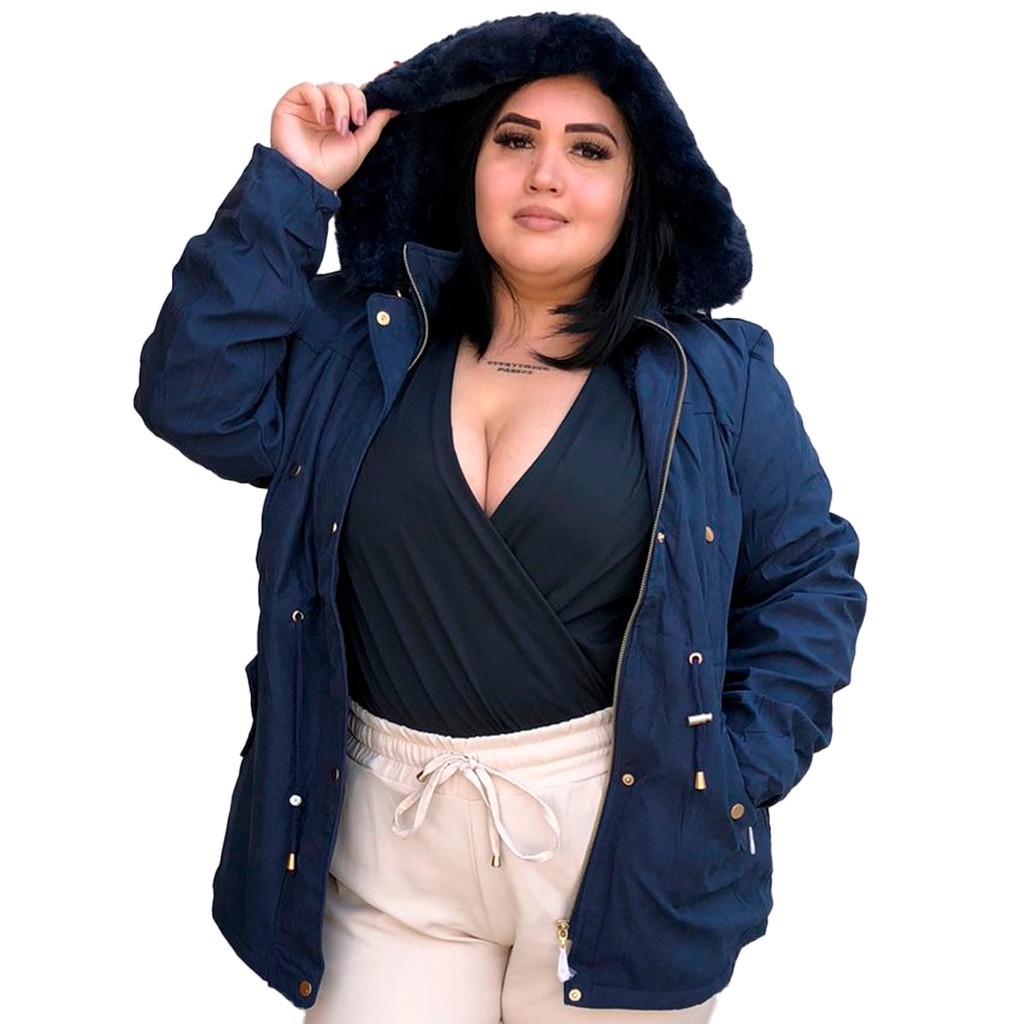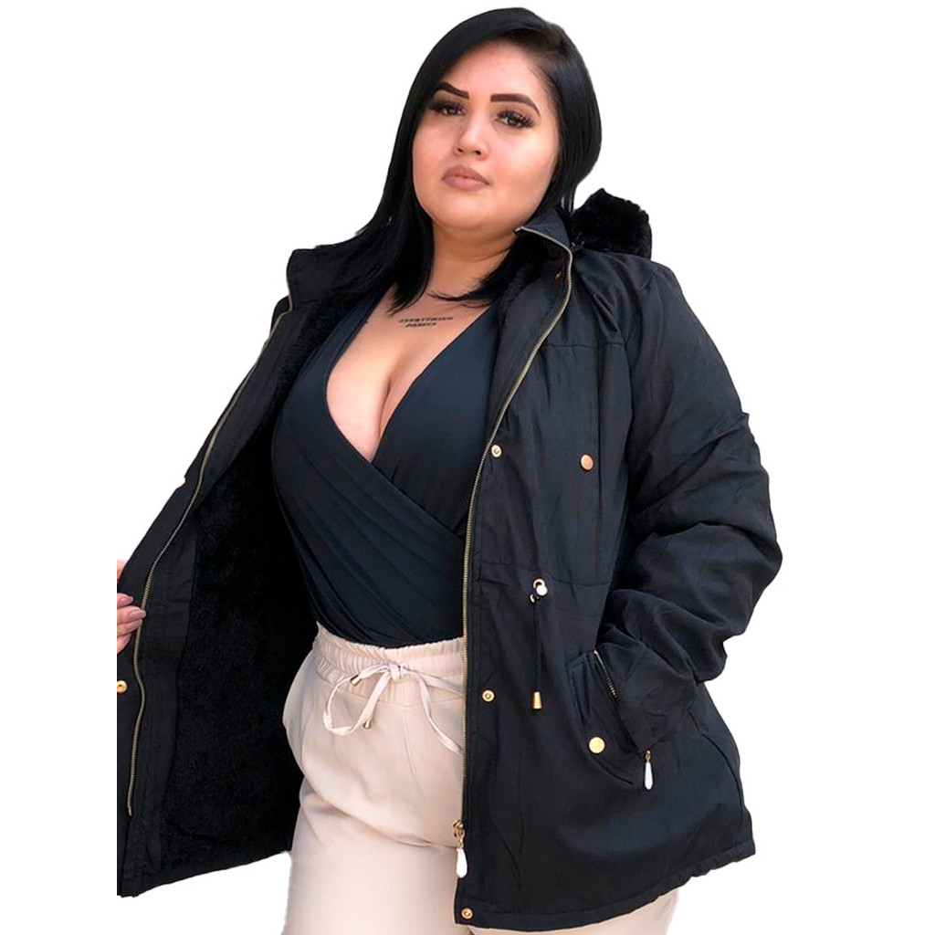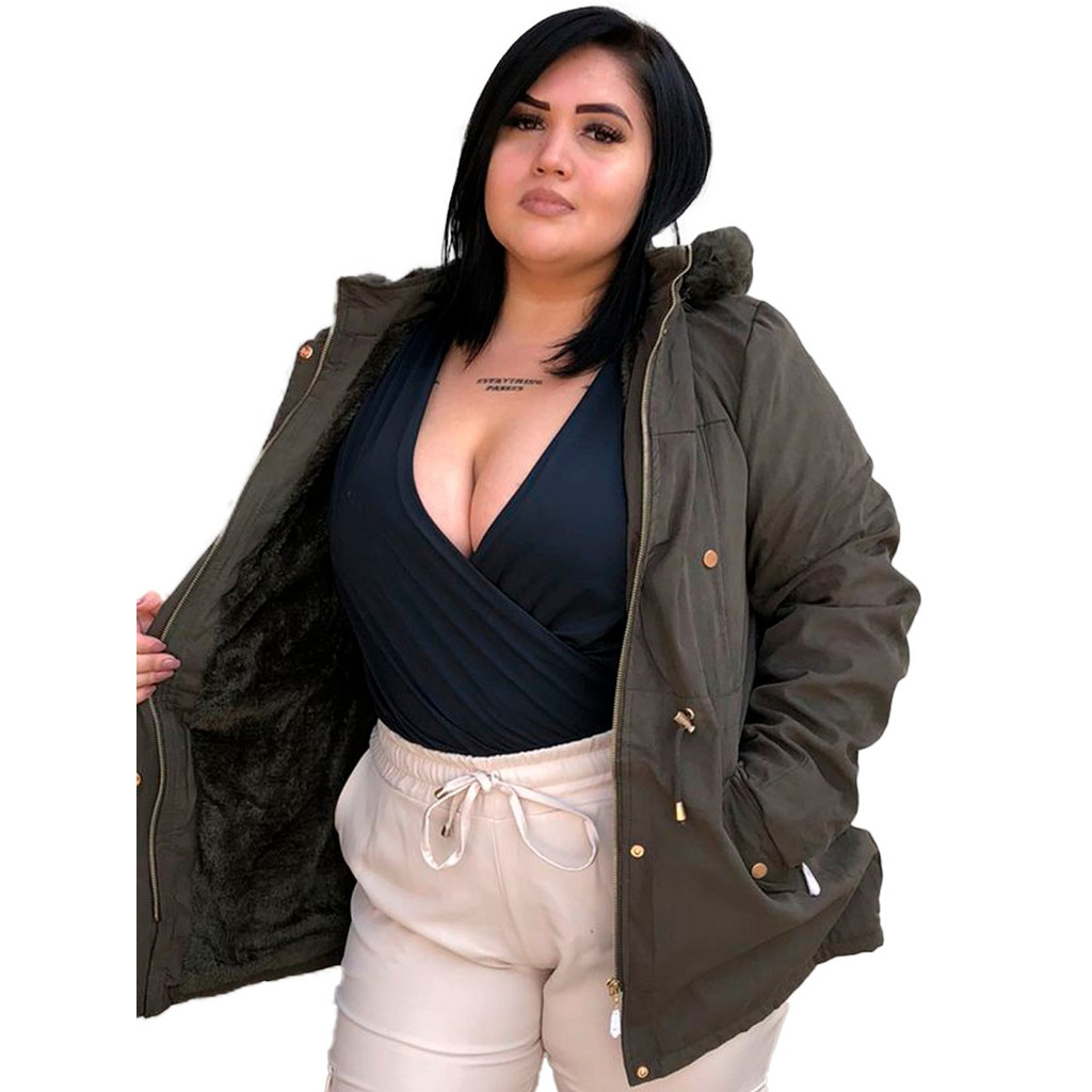 Parka Jaqueta Sarja Plus Size forrada pele dentro possui zíper botão bolsos inverno tamanho grande