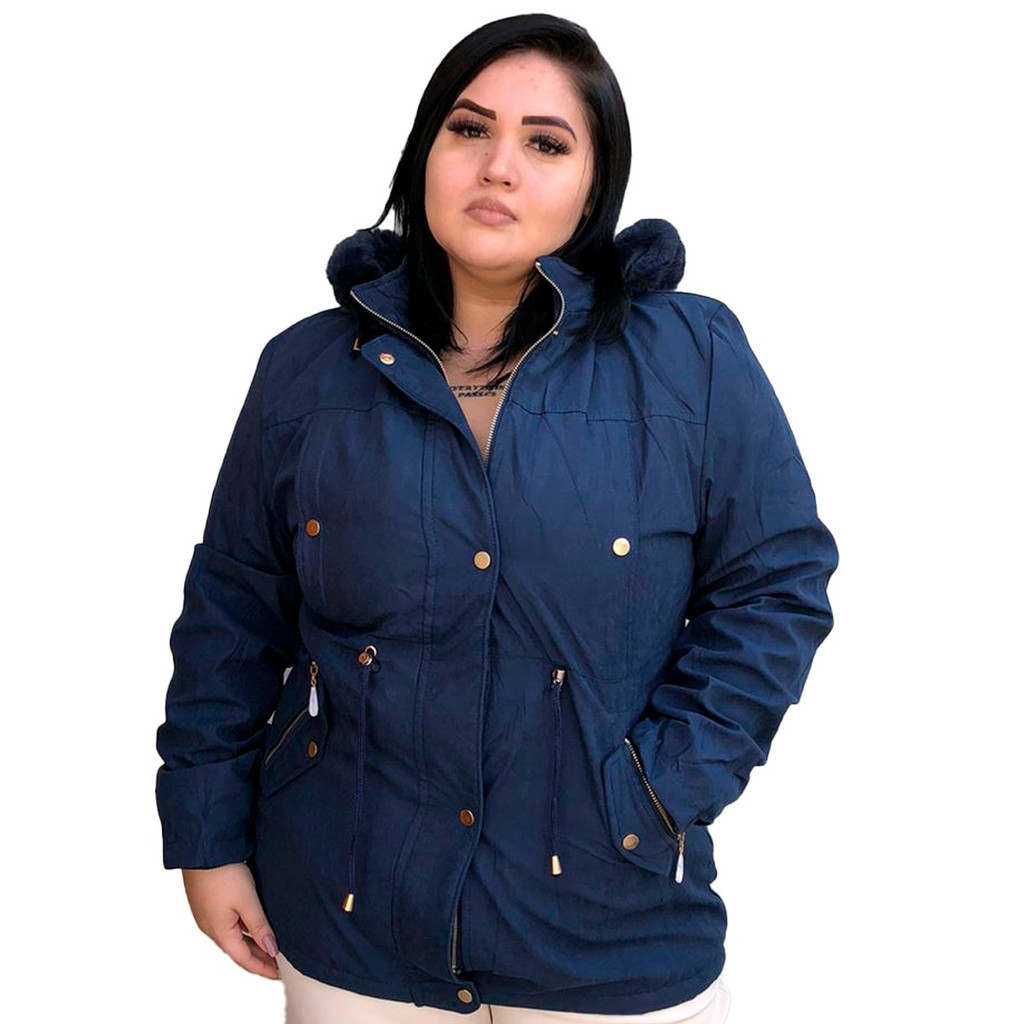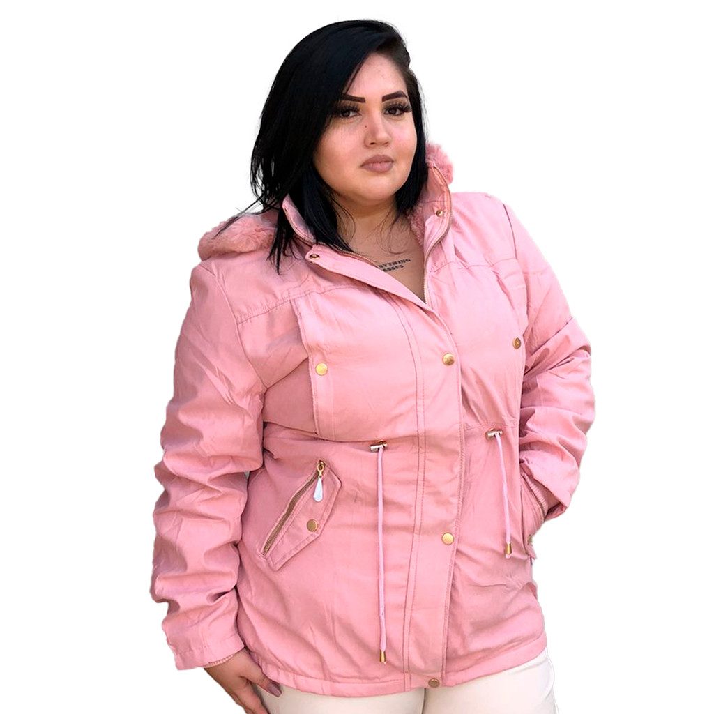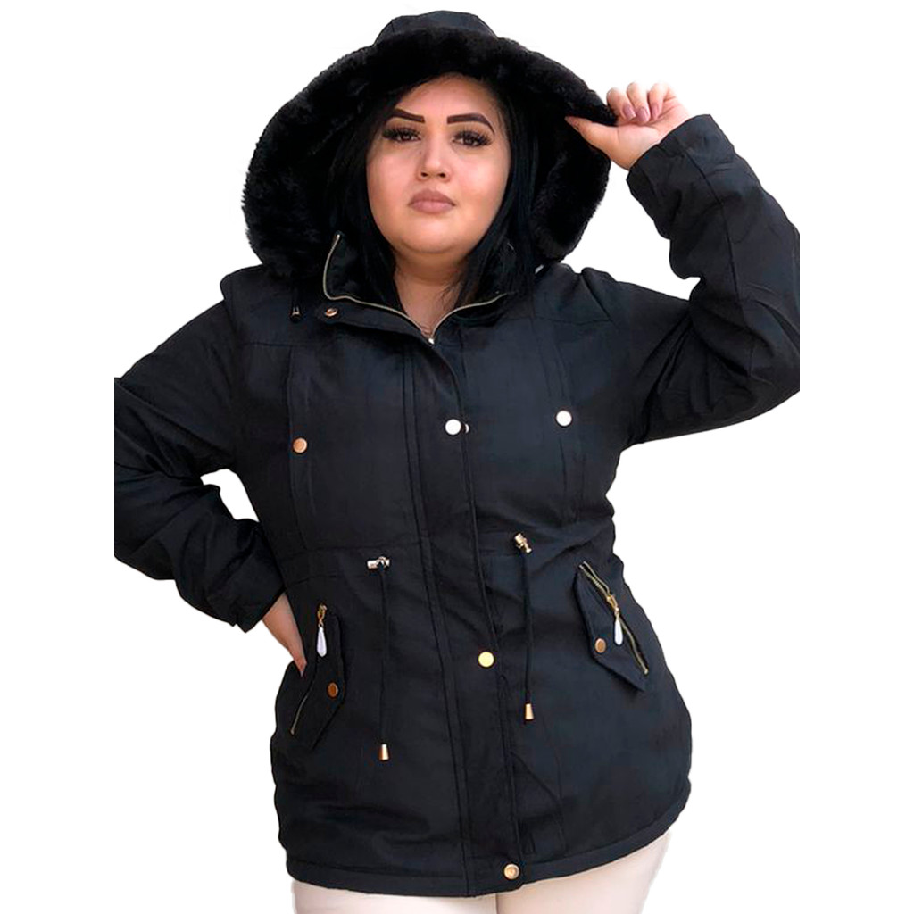 Parka Jaqueta Sarja Plus Size forrada pele dentro possui zíper botão bolsos inverno tamanho grande