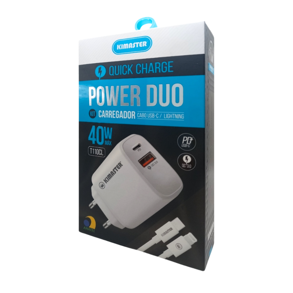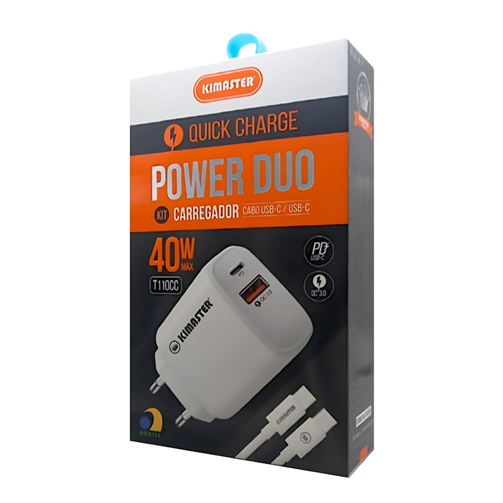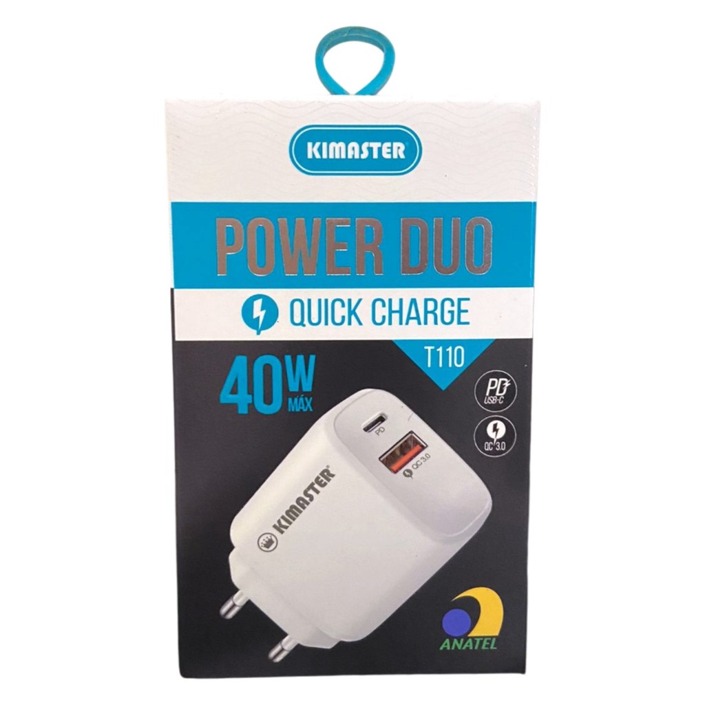 Kit Carregador Turbo 40W Kimaster T110/T110CL/T110CC – PD + QC 3.0 com Cabo Type-C ou Lightning