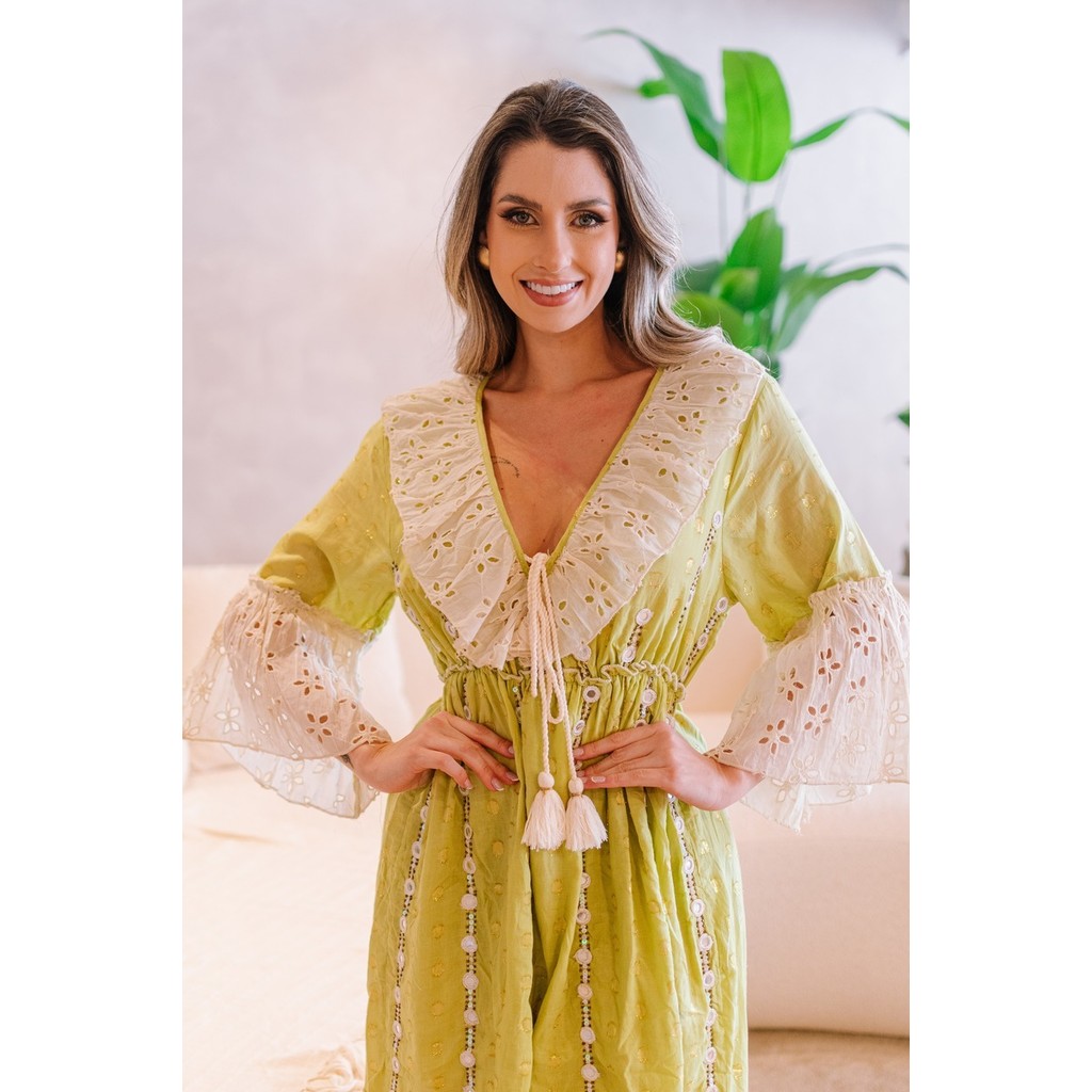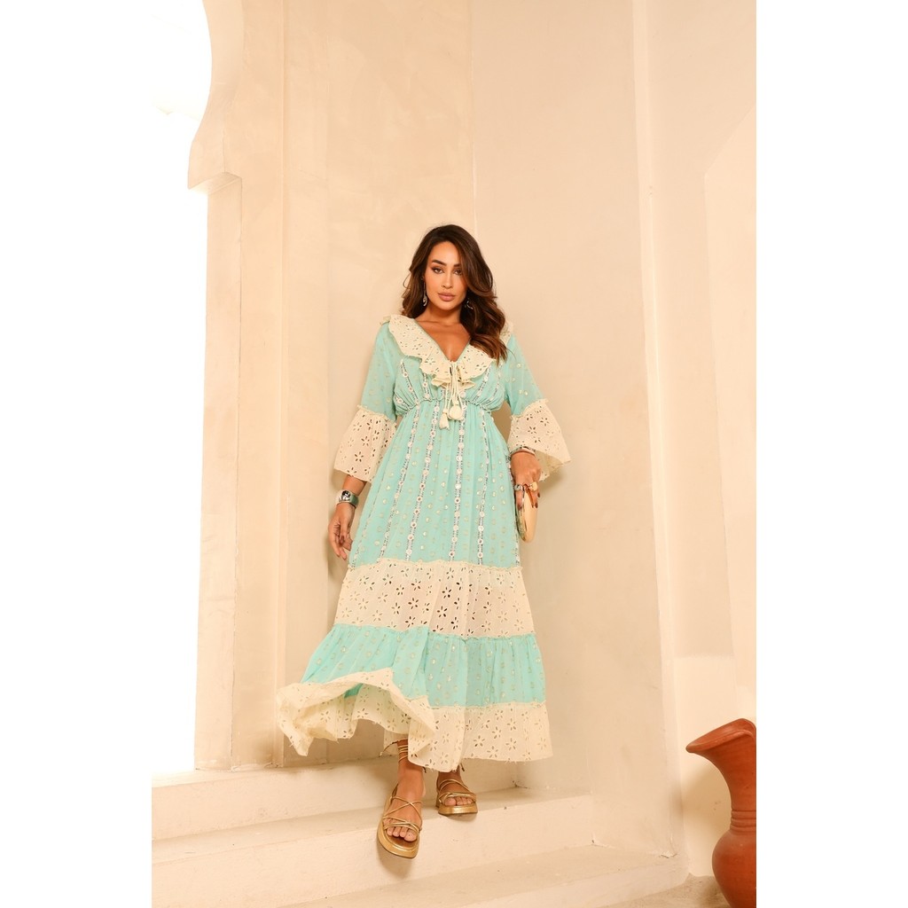 Vestido Longo Indiano Boho Chic Feminino com Babados, Renda Bordada, Decote V Ajustável com Tassel e Manga Flare-7005