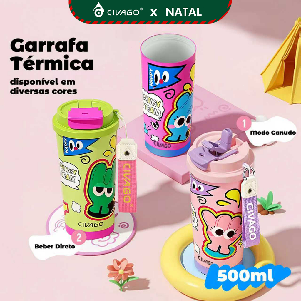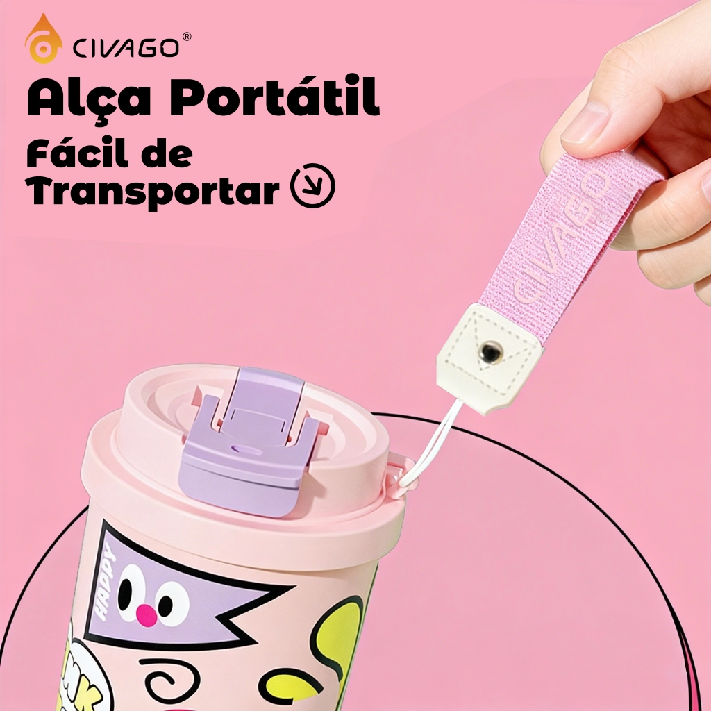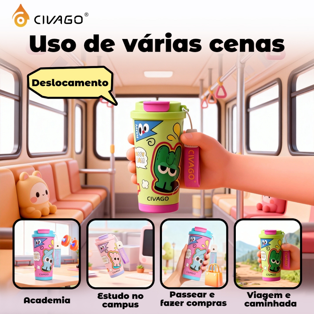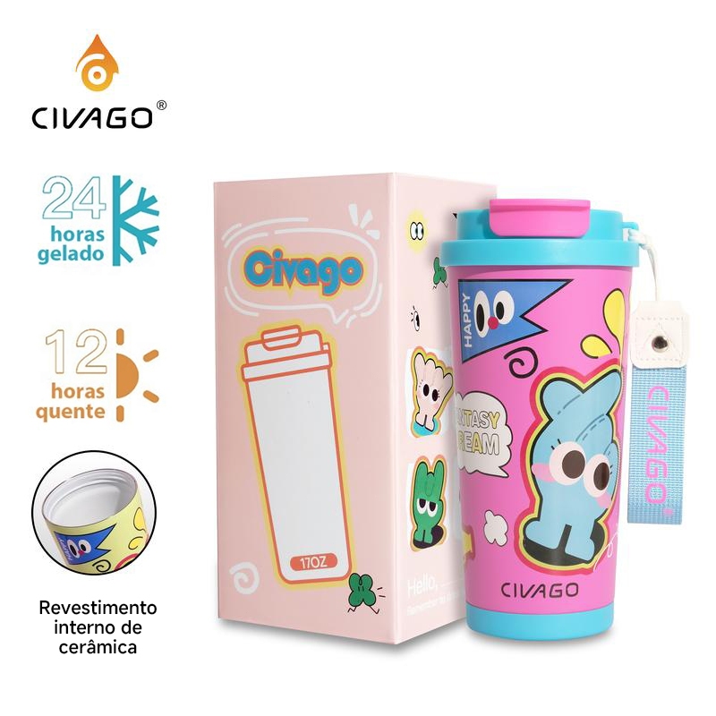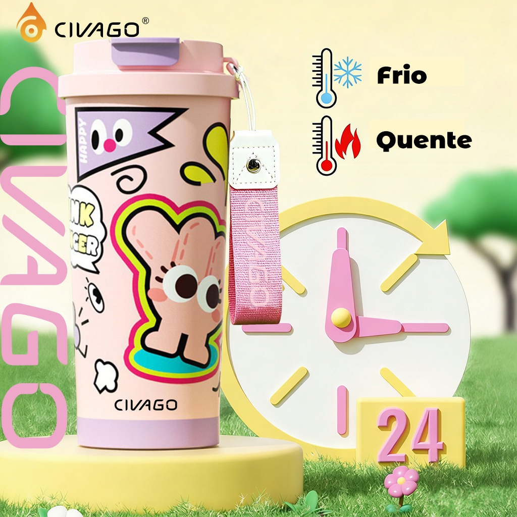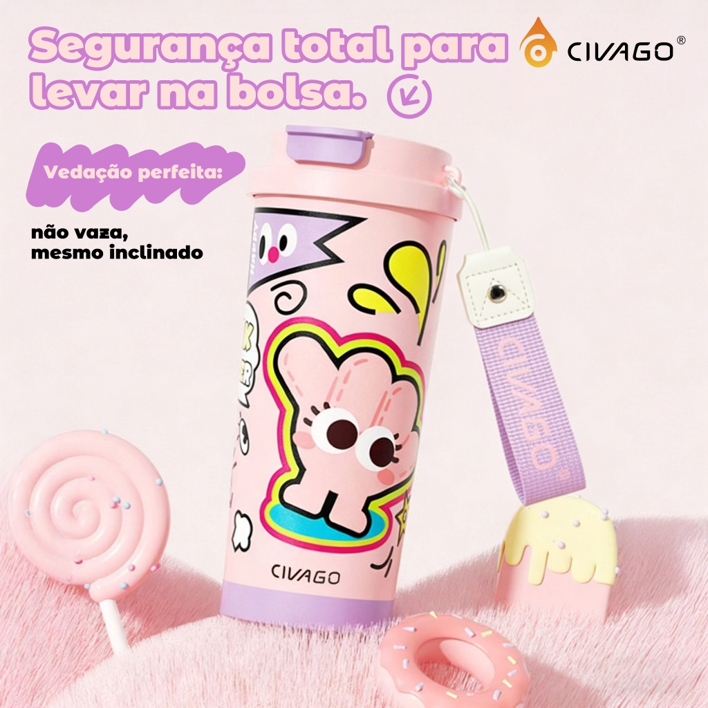 CIVAGO Copo Térmico 500ml com Alça de Tecido e Estampa Fofa Garrafa Térmica Fashion Antivazamento 12h Quente/24h Frio