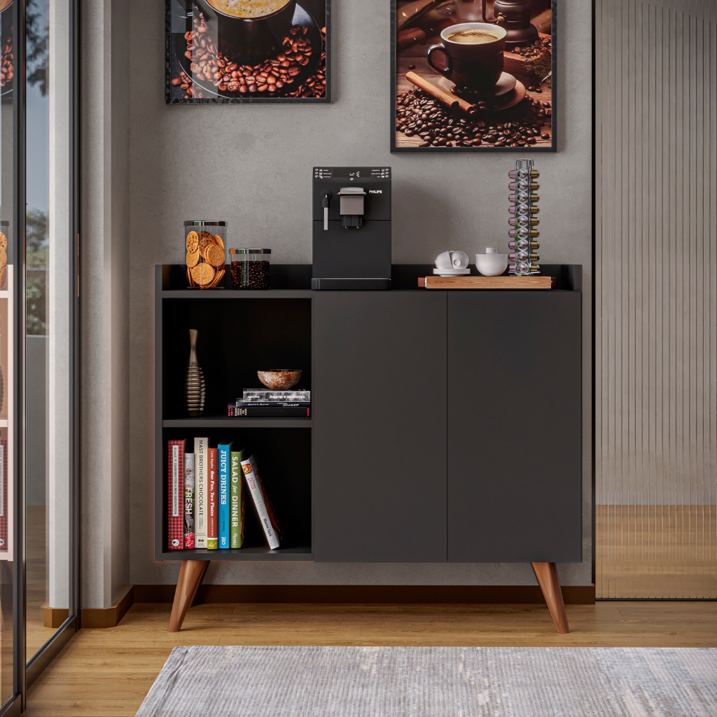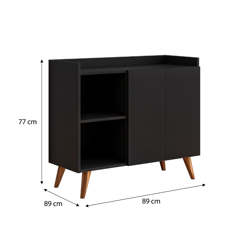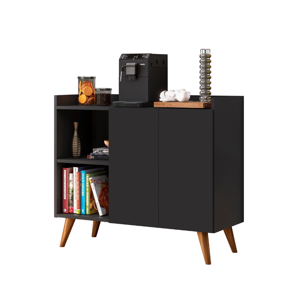 Balcão buffet aparador 2 portas para casa com pés de madeira divisórias na cor preto
