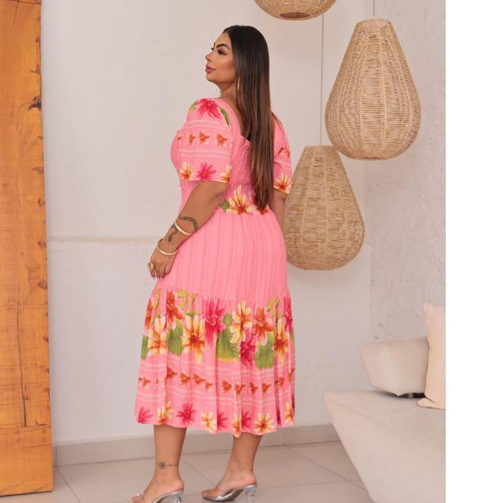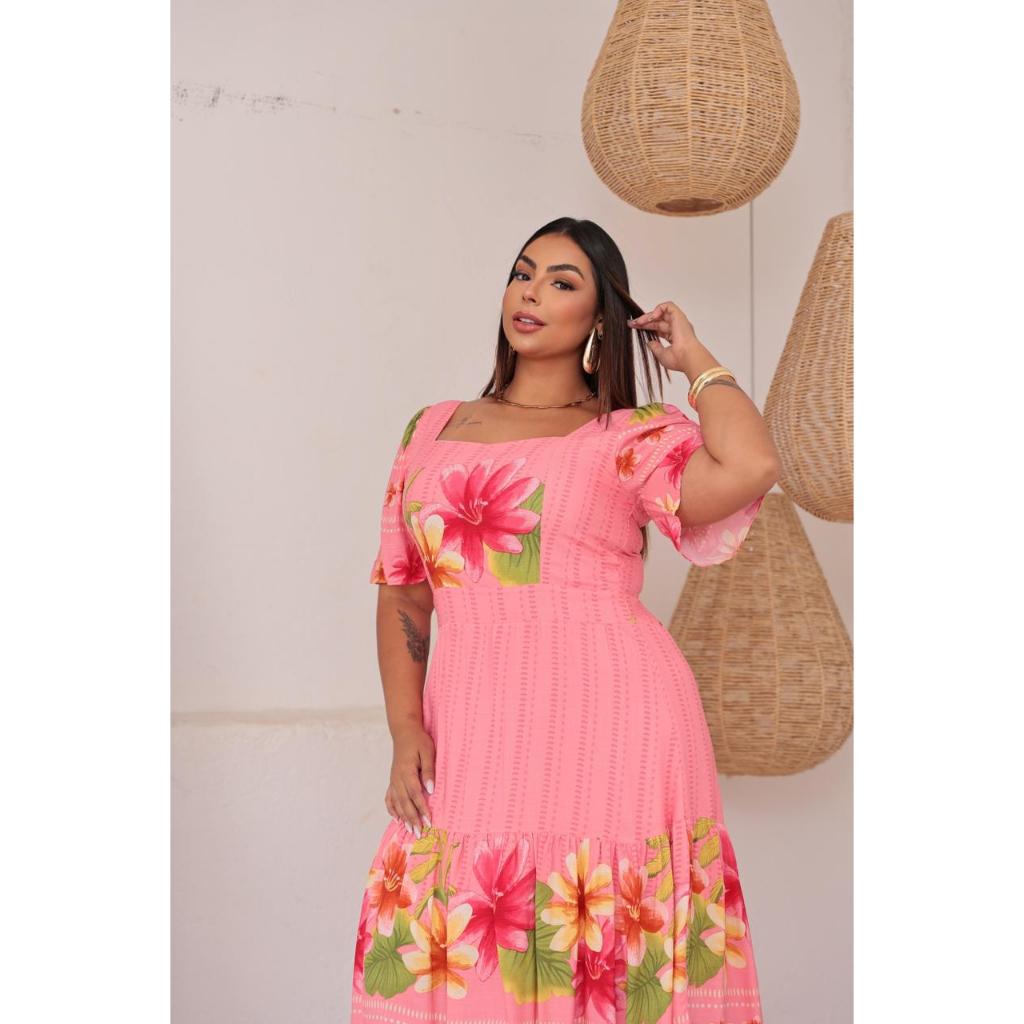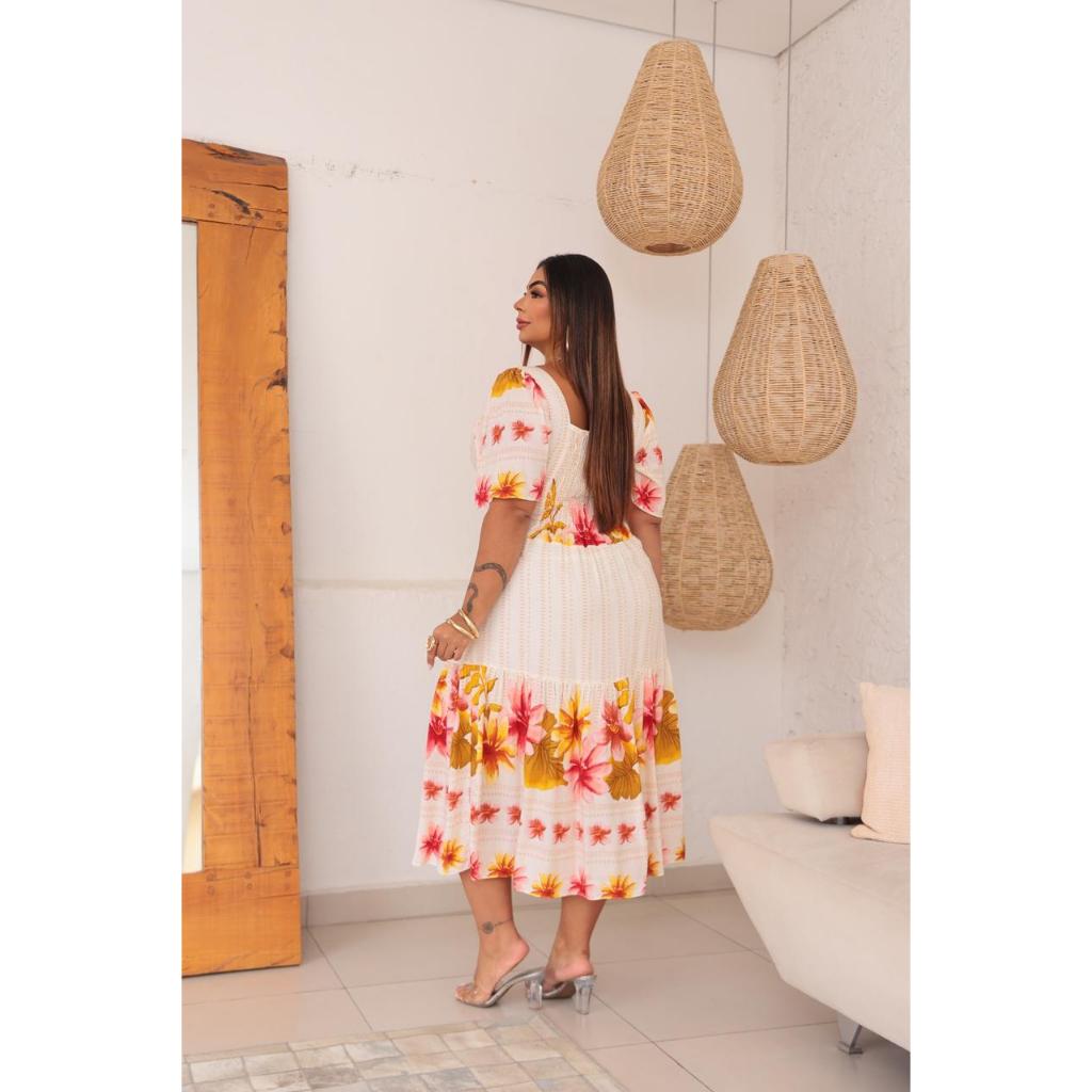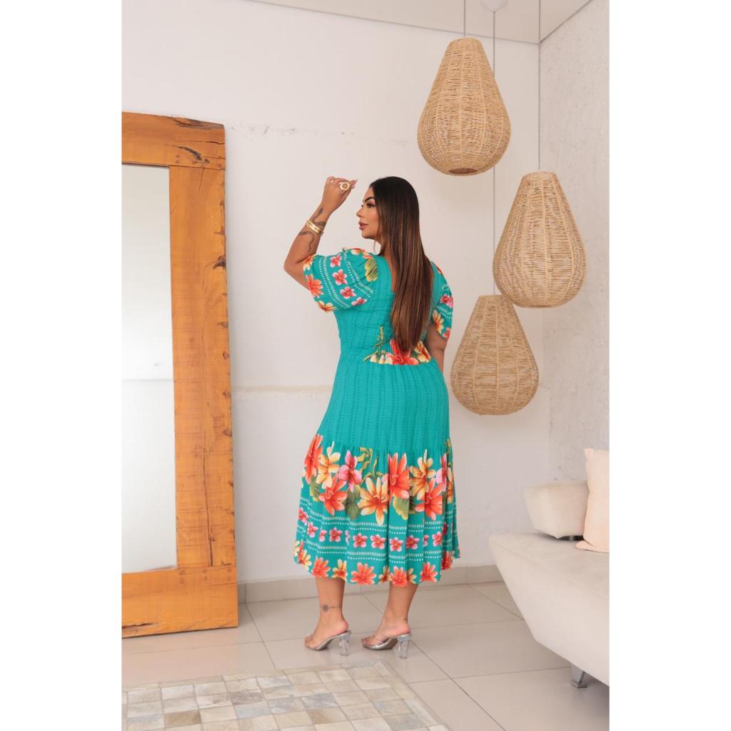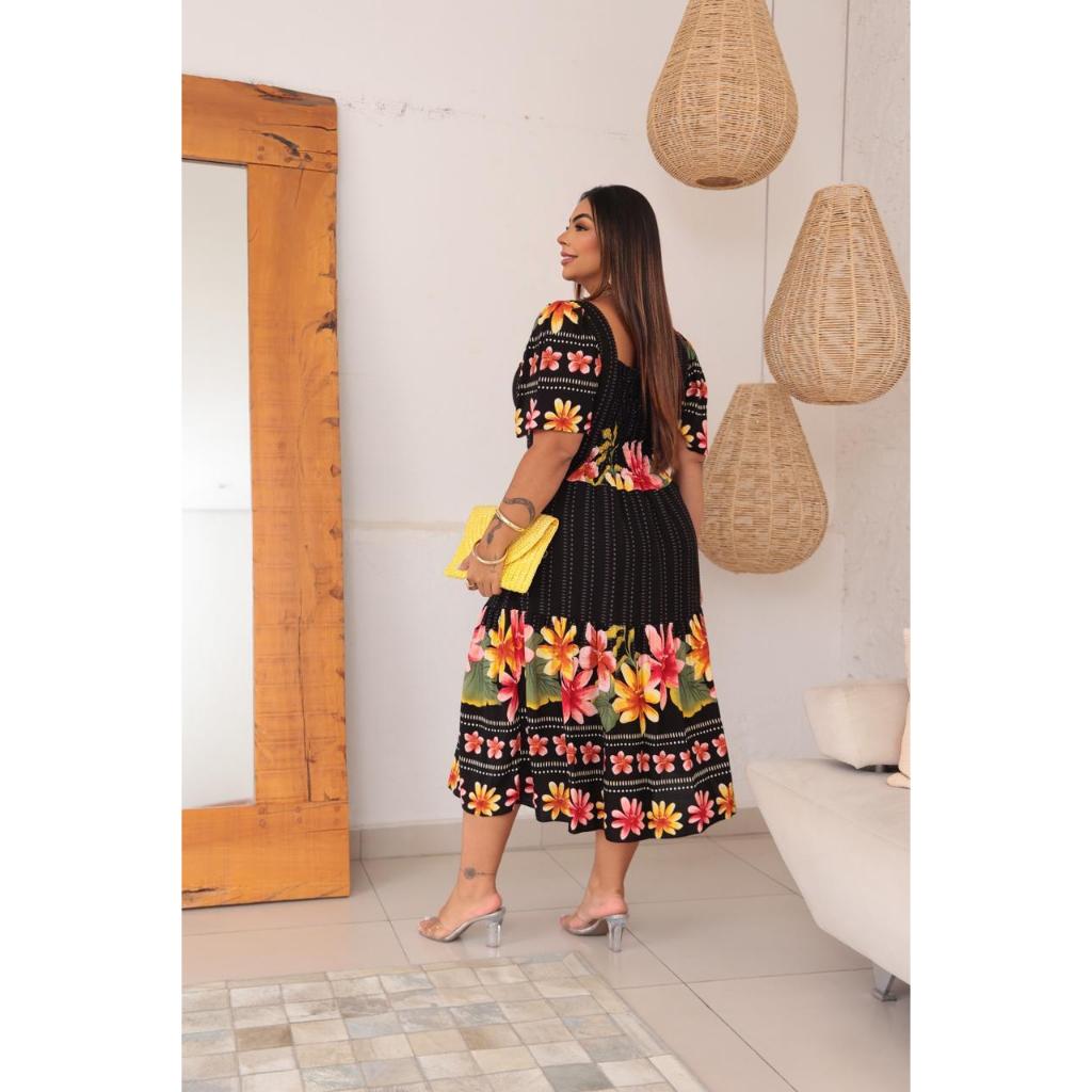 VESTIDO MIDI PLUS SIZE MODA FEMININO ESTILO ELEGANTE FORMAL EM VISCOLINHO FLORAL EM MANGA CURTA BUFANTE