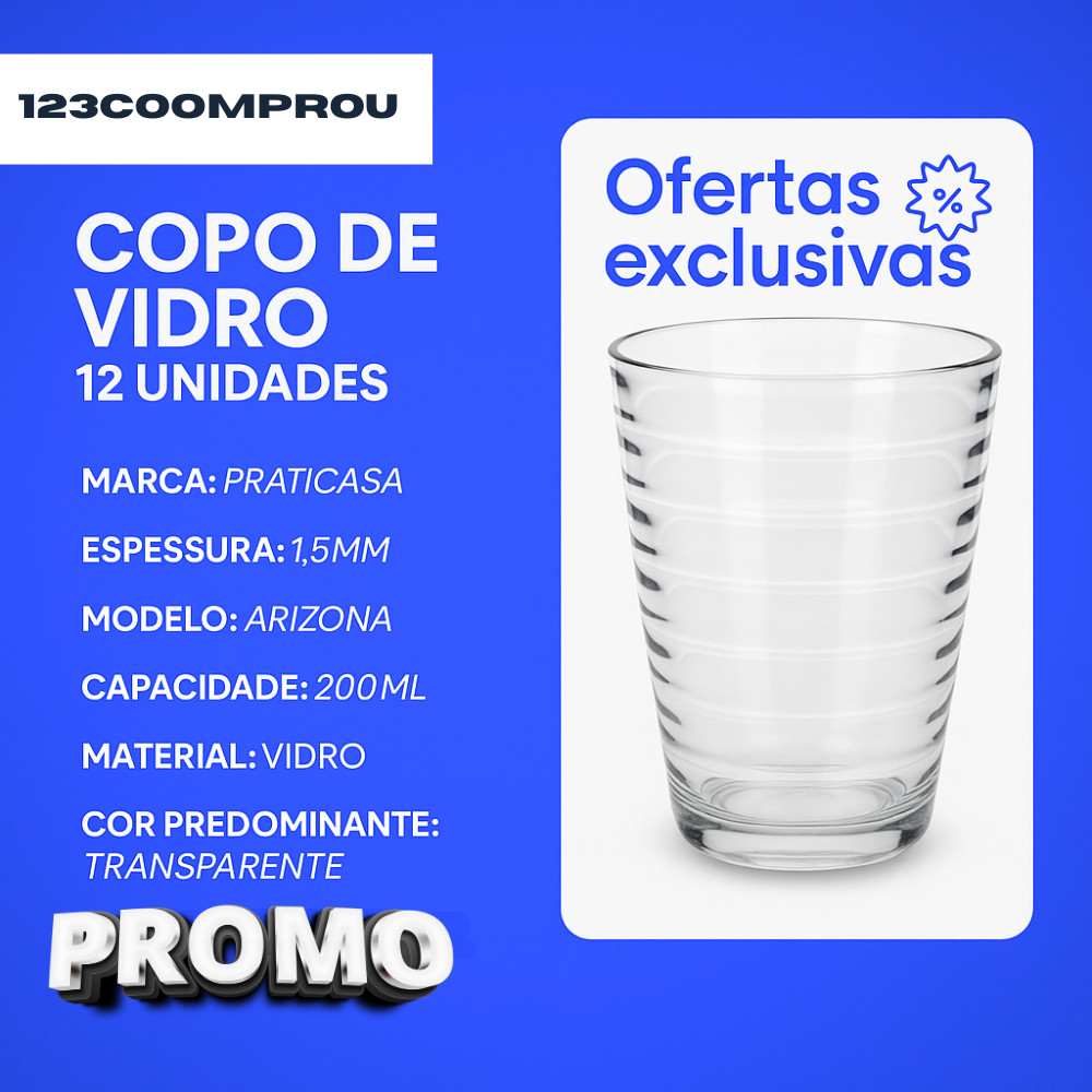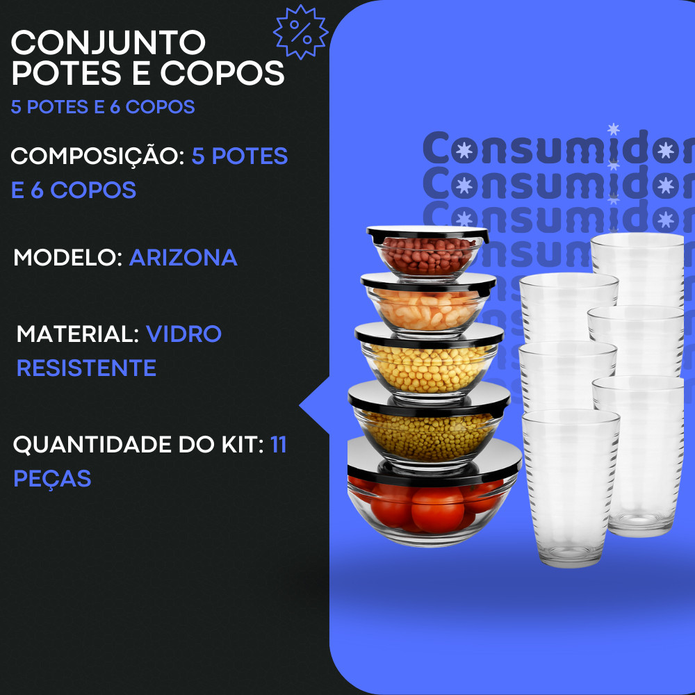 Kit Conjunto De Potes 5 Peças Vidro e 6 Copos Arizona 200ml Transparente
