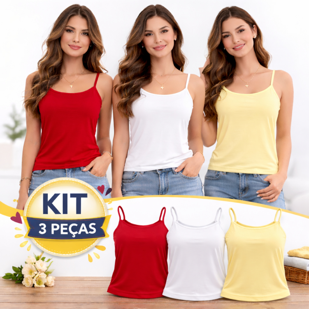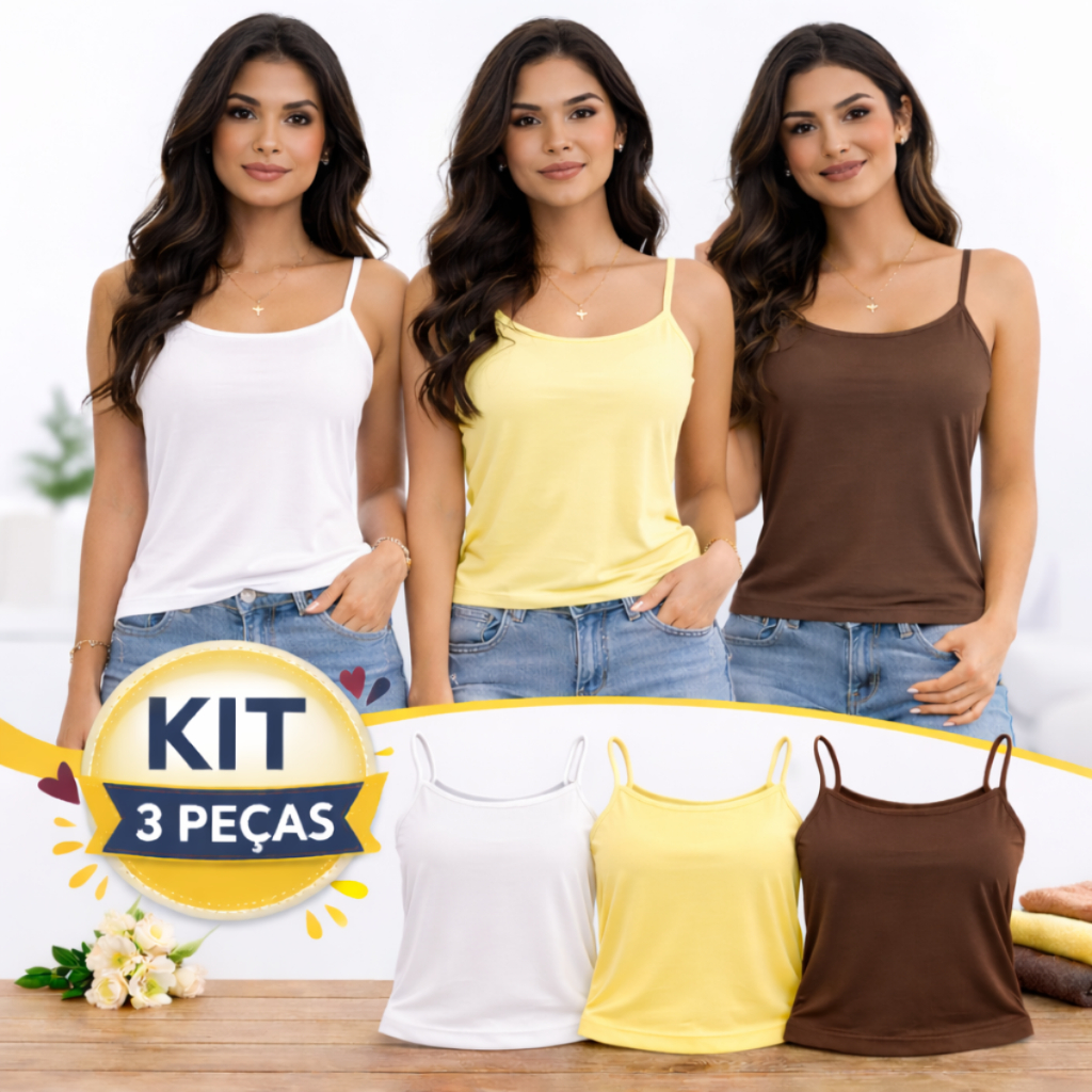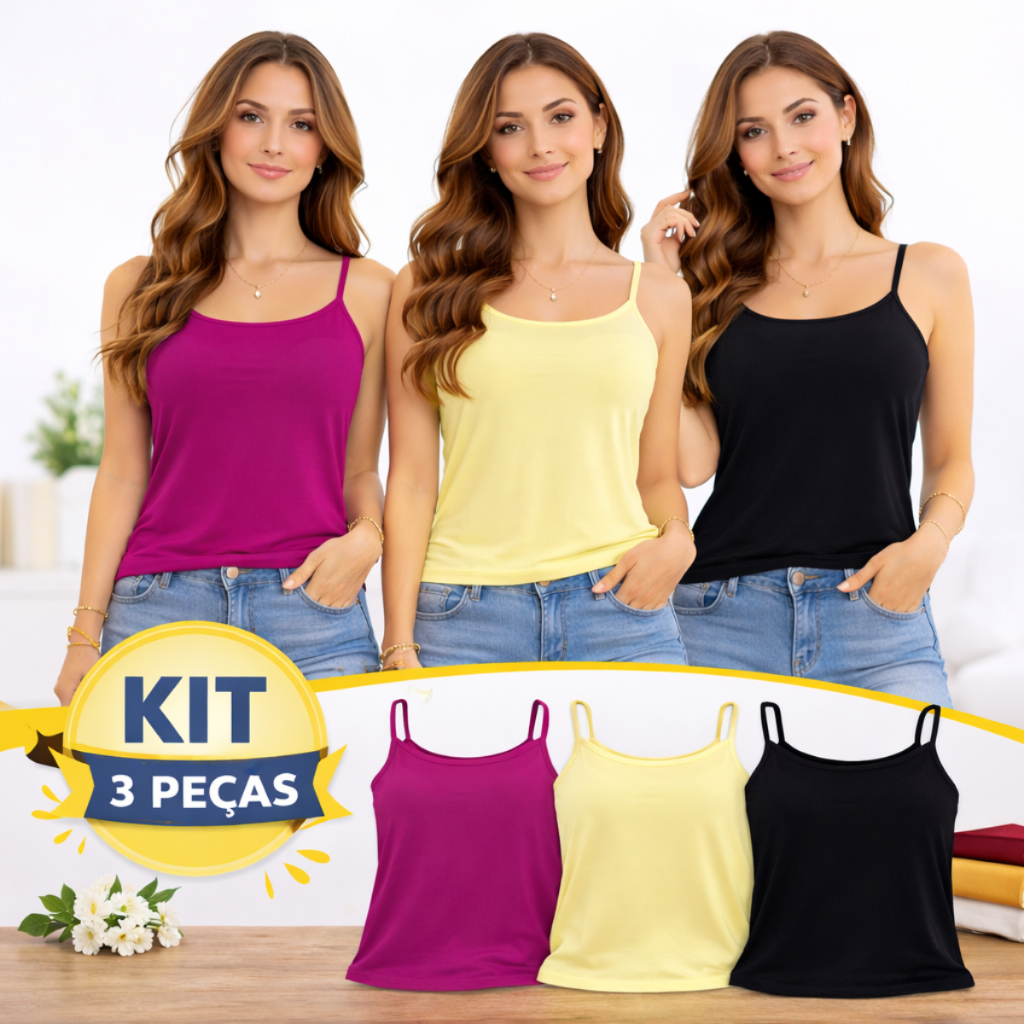 KIT 3 PEÇAS REGATA FEMININA ALÇA FINA - CORES SORTIDAS
