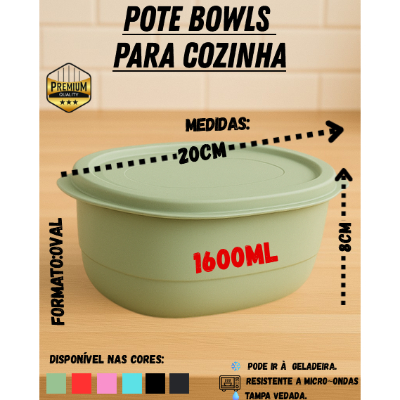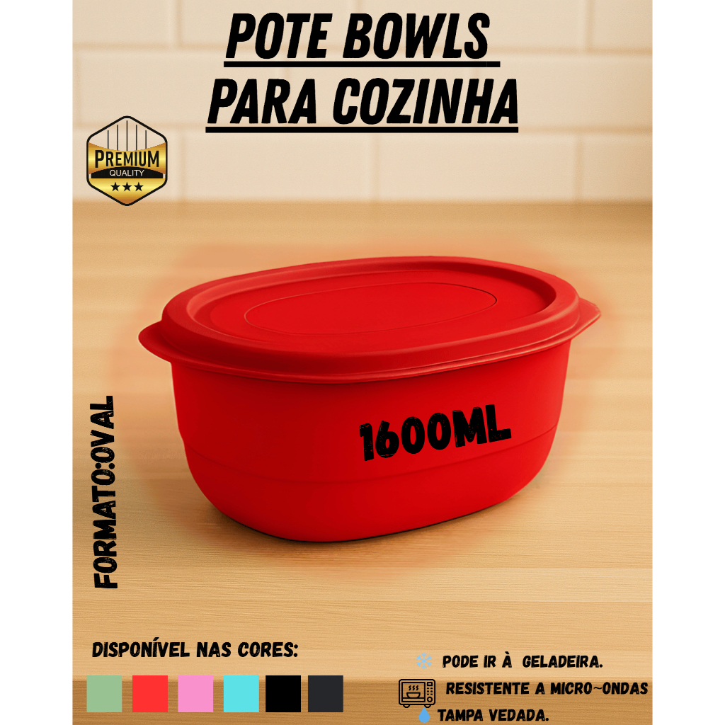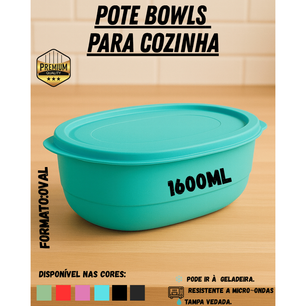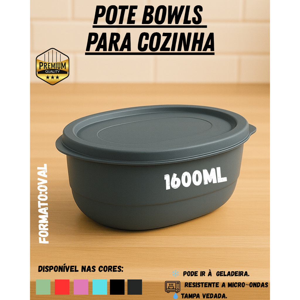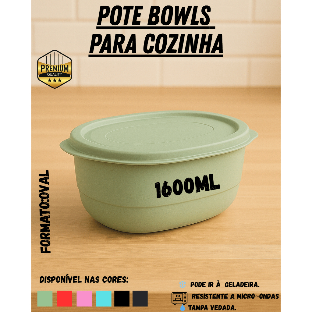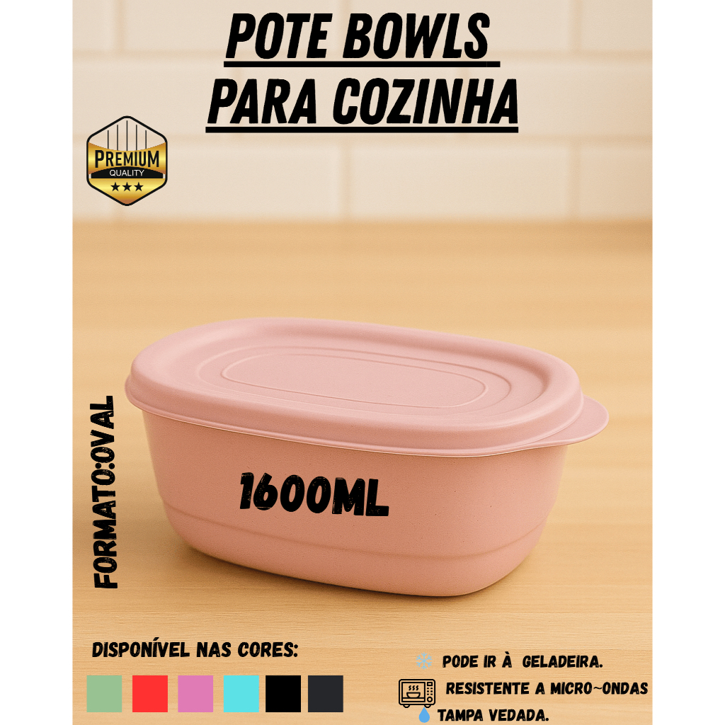 Kit Pote Plástico Oval 1600ml até 10 unidades – Verde, Verde Claro, Preto, Azul Petróleo, Rosa e Vermelho
