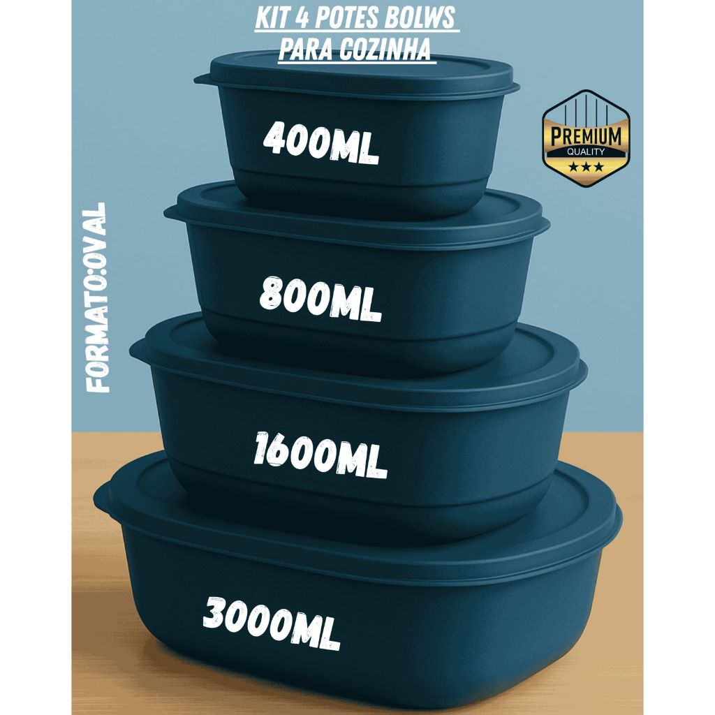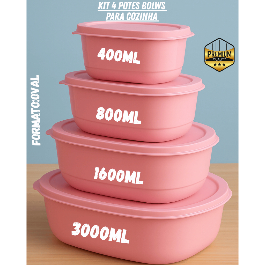 Kit Oval 4 Potes Plásticos com Tampa Multiuso- Armazenamento de alimentos e Marmitas