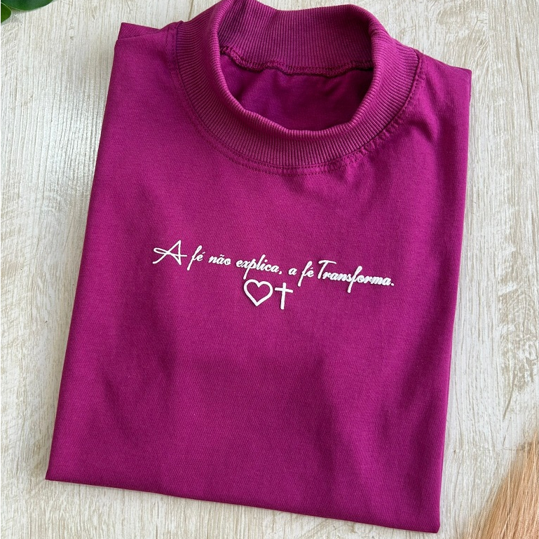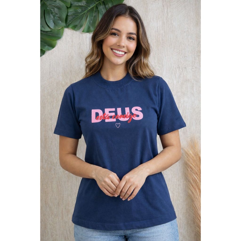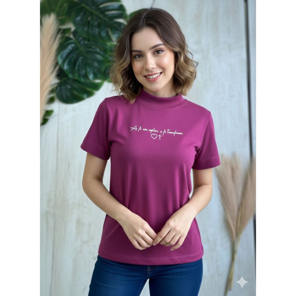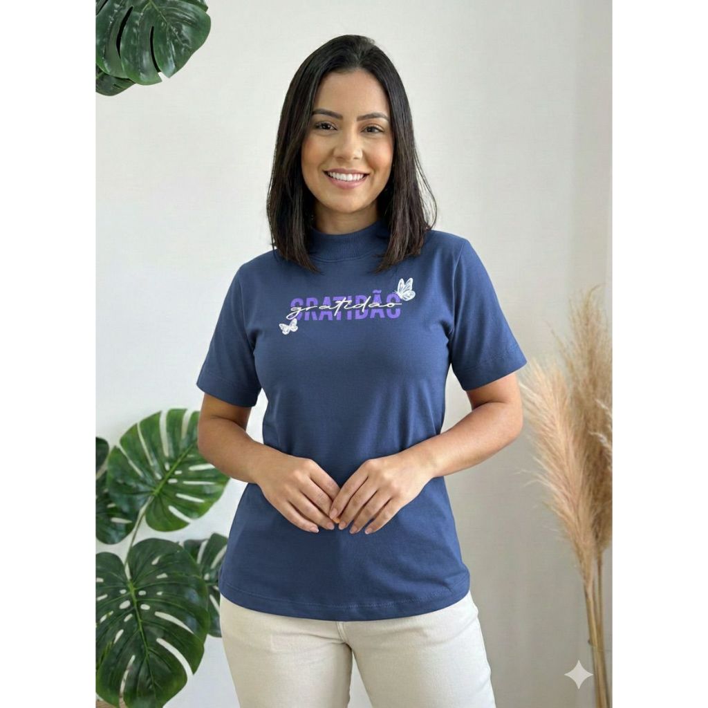 Blusa Feminina Gola Alta Elegante Algodão Premium Macia Estampada Tshirt Camiseta Básica Casual Moda Evangélica