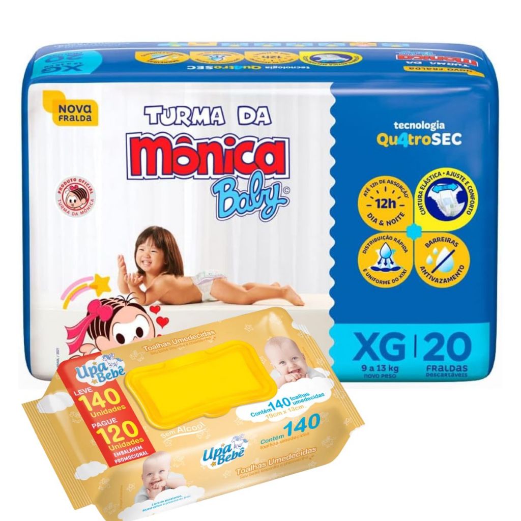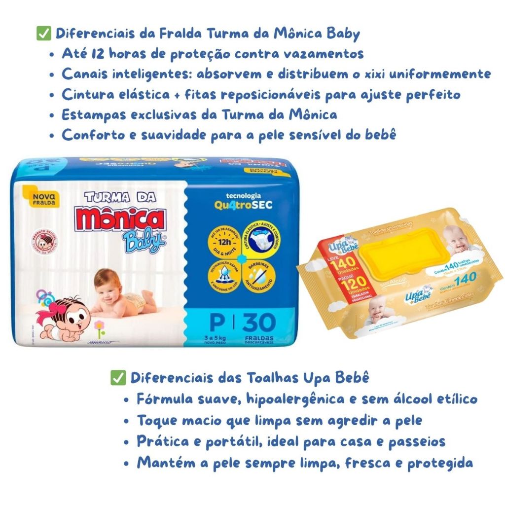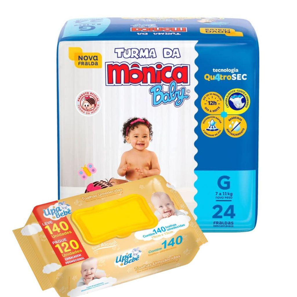 Kit Fralda Descartável Turma da Mônica Baby + Toalhas Umedecidas Upa Bebê – Cuidado do Bebê