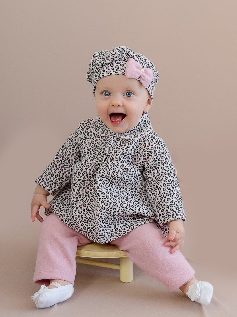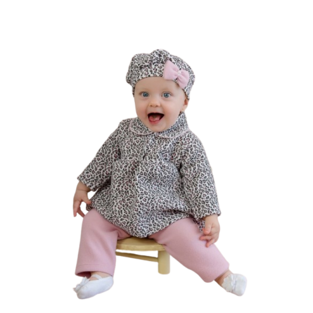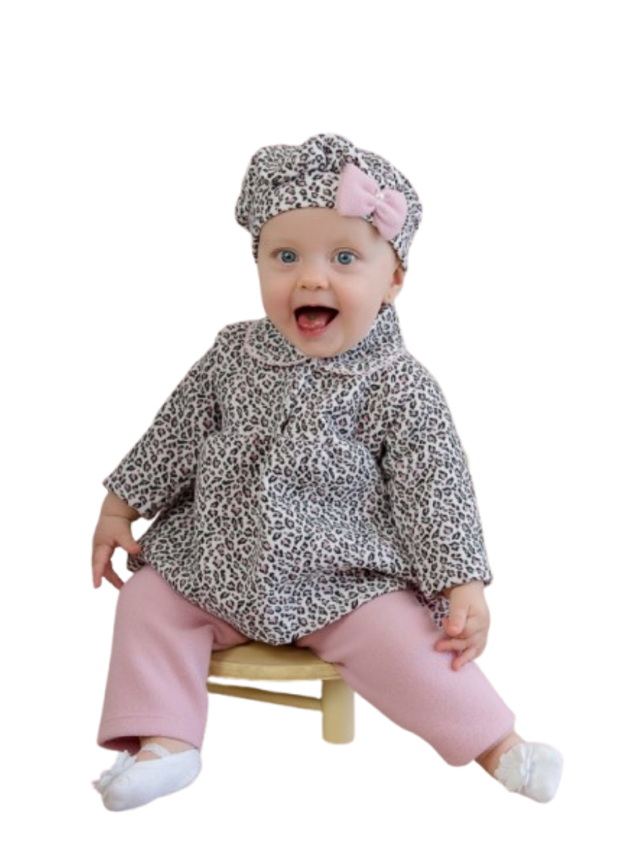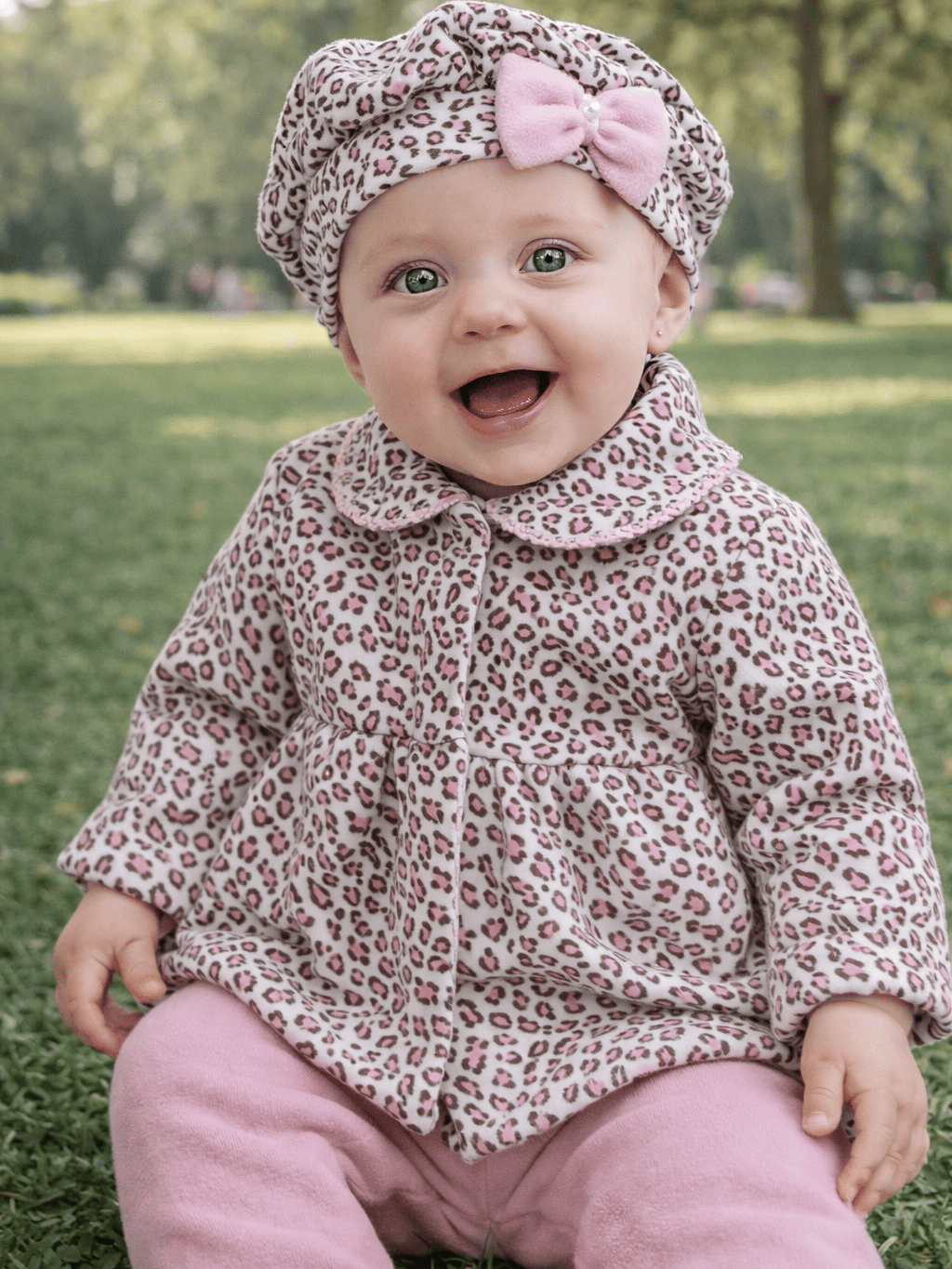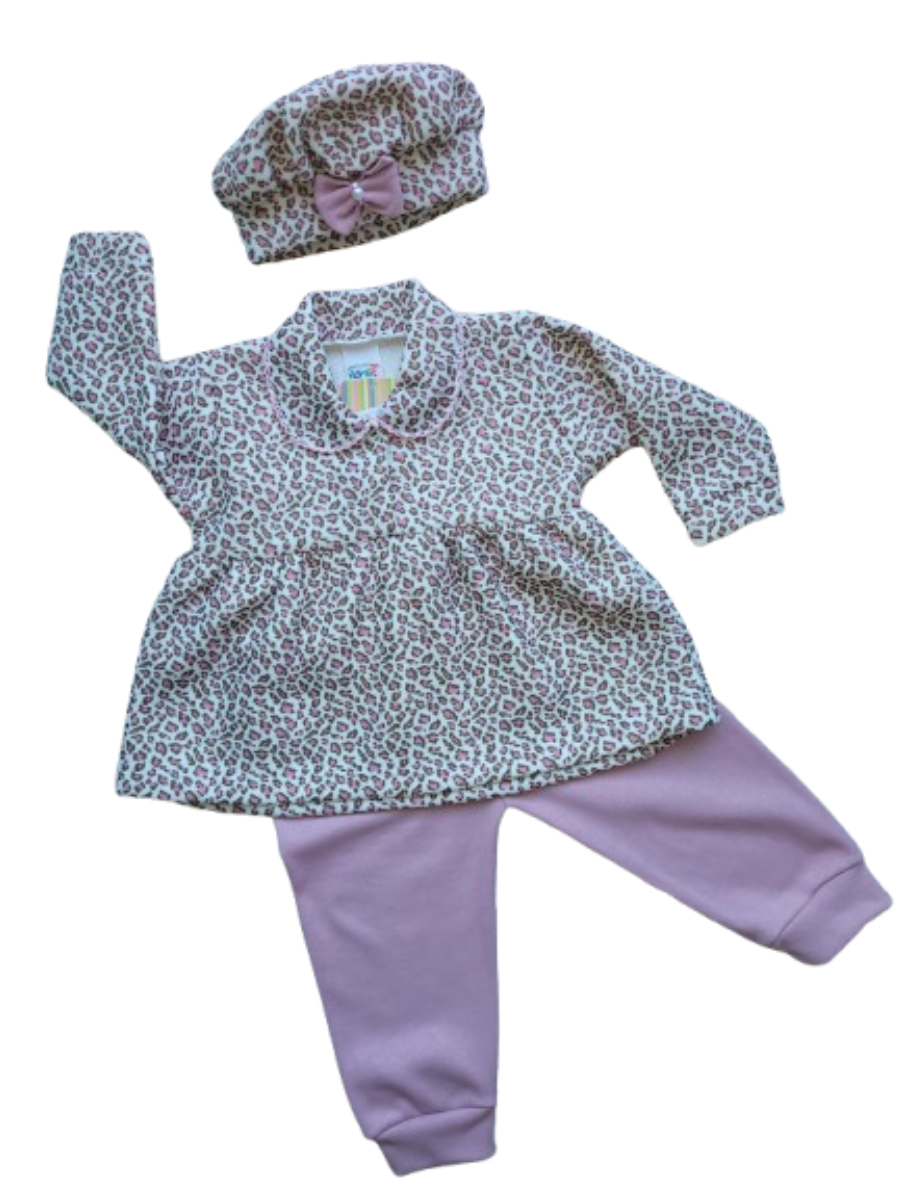 Conjunto Bebê Menina em Soft Estampa Oncinha Laço 3 Peças Casaco + Calça + Boina Inverno