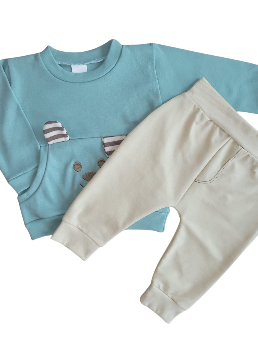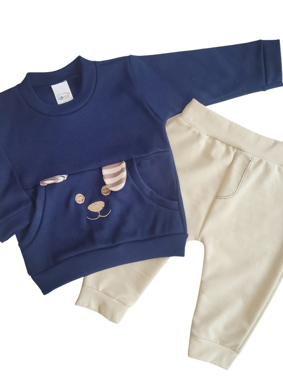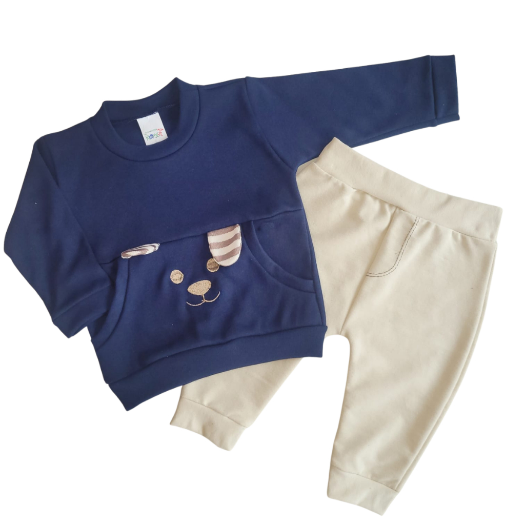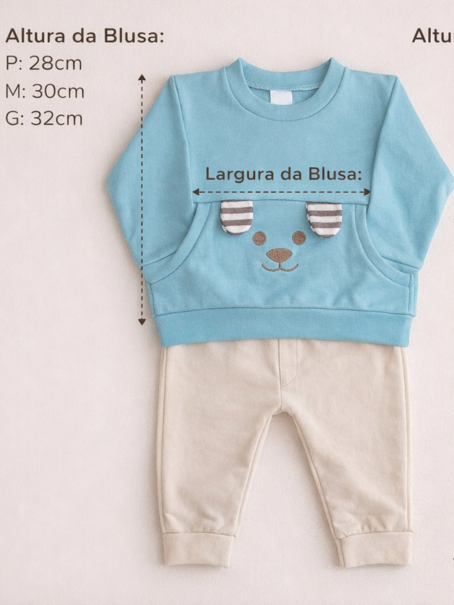Conjunto Bebê Menino Calça Sarja + Blusa Bordada Bolso Bicho Orelha 3D