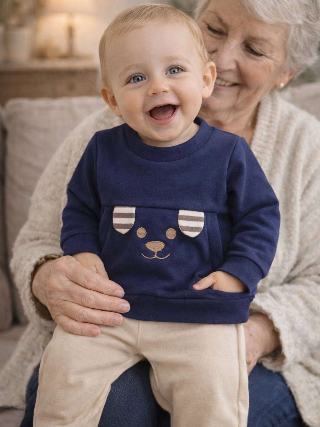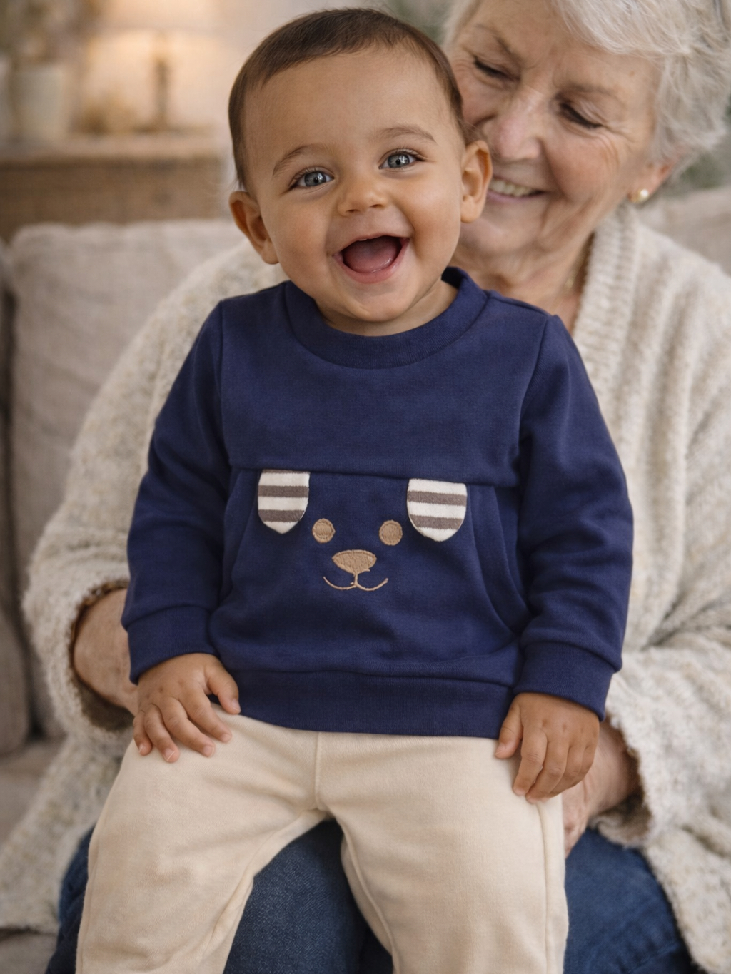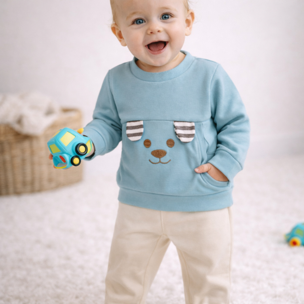 Conjunto Bebê Menino Calça Sarja + Blusa Bordada Bolso Bicho Orelha 3D