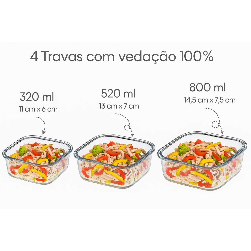 Kit 3 Potes De Vidro C / Tampa Hermética Quadrados 320ml/520ml/800ml