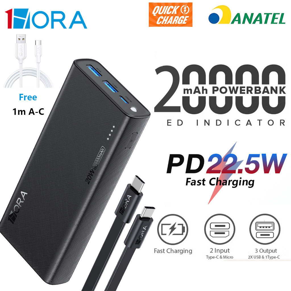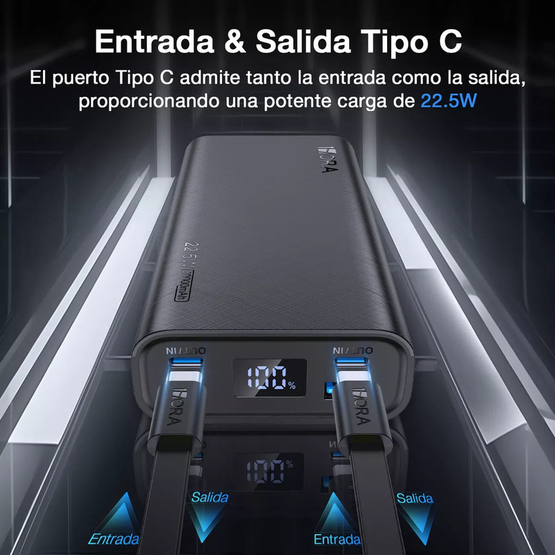 1HORA GAR158 Power Bank 20000 mah 2 Entradas Tipo C e 1 Entrada USB 22.5W Modelo Carga Rápida Portátil