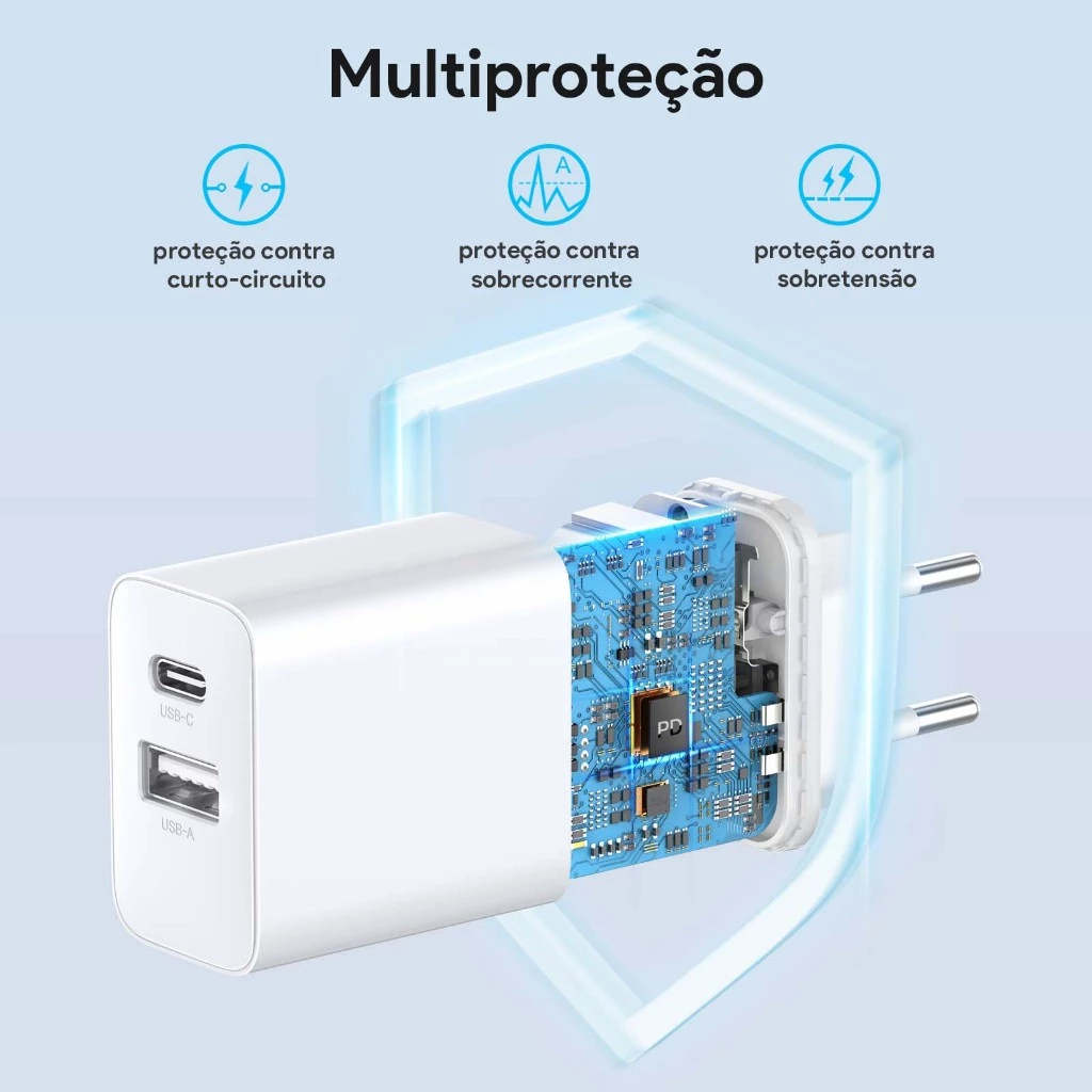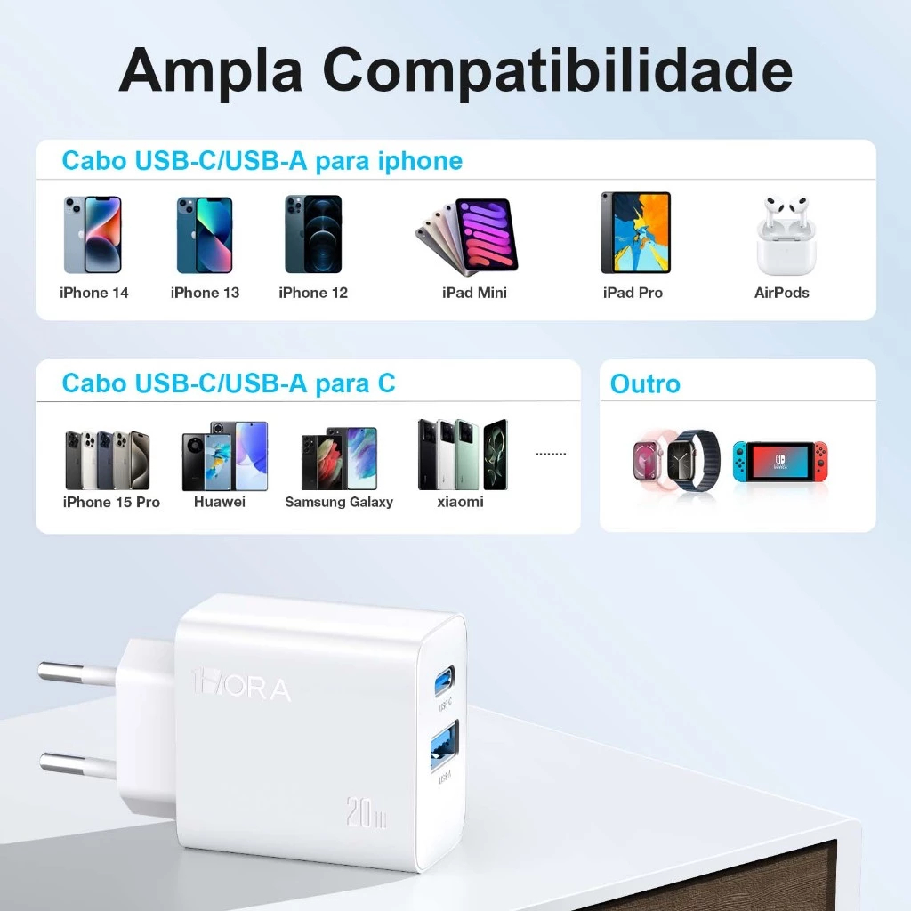 Carregador Rápido 1HORA GAR161 Pd 20w Duas Portas USB 18W + C 20W Branco + Cabo USB C 1 Metro Branco