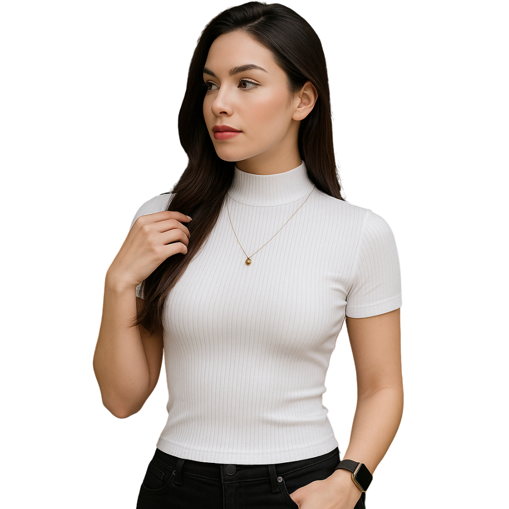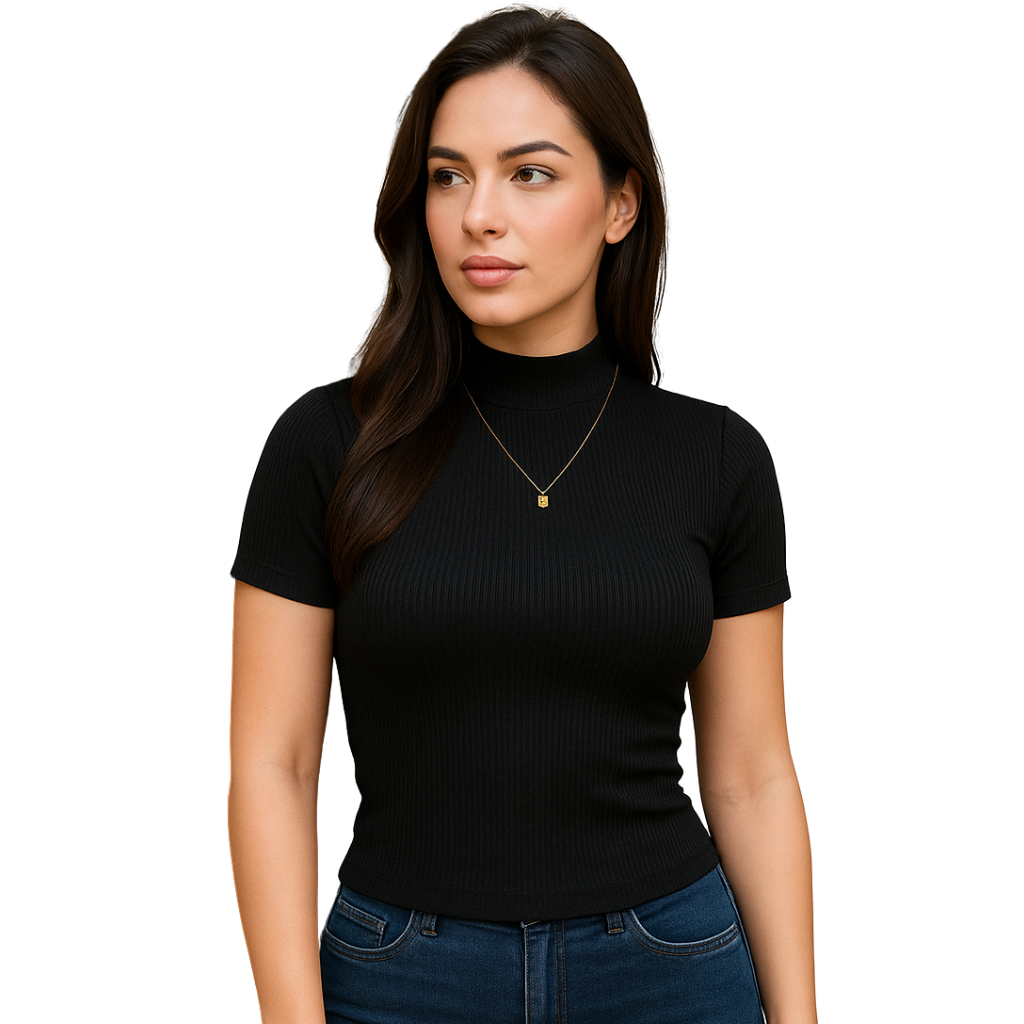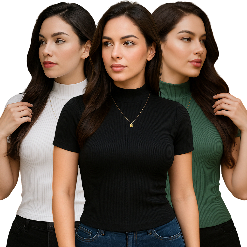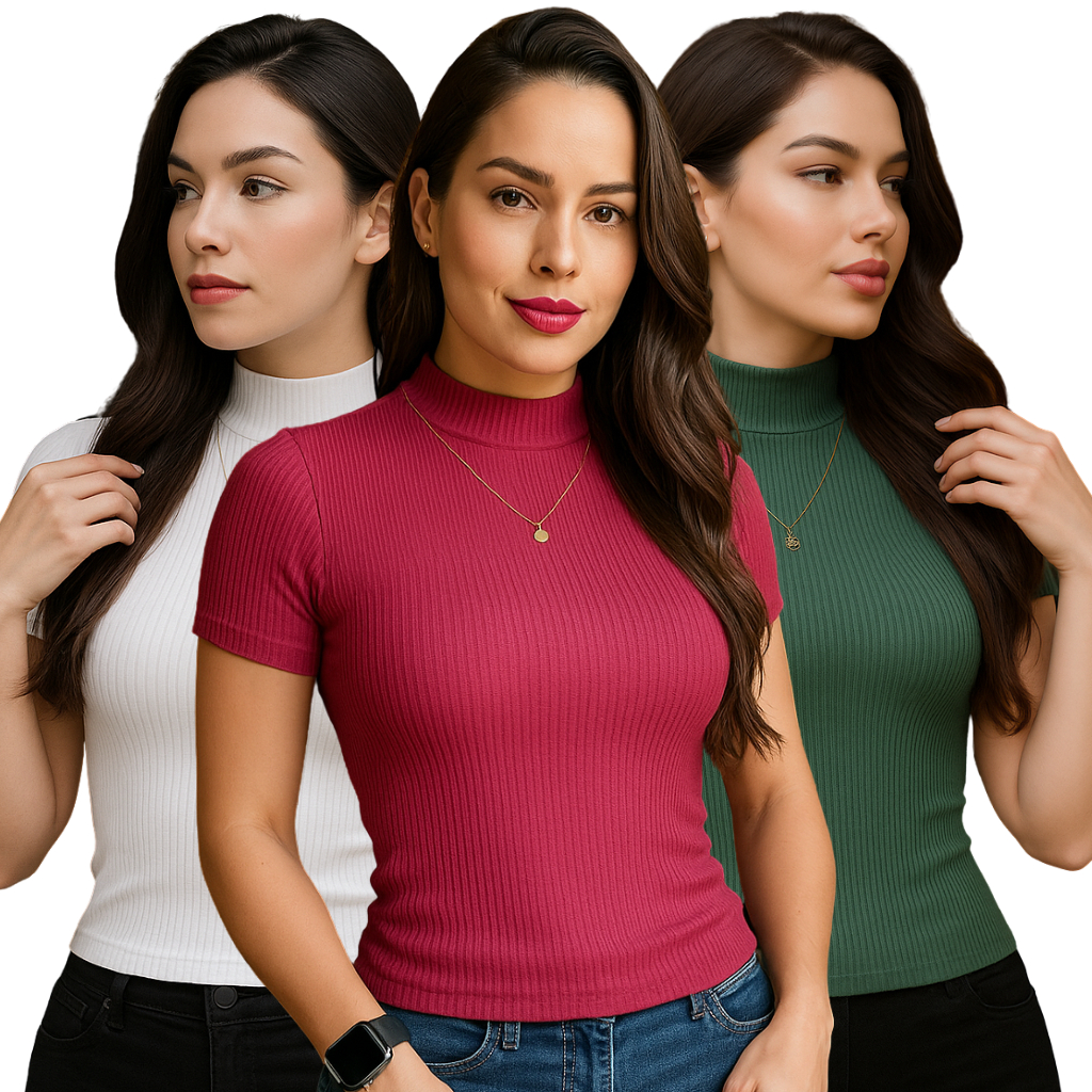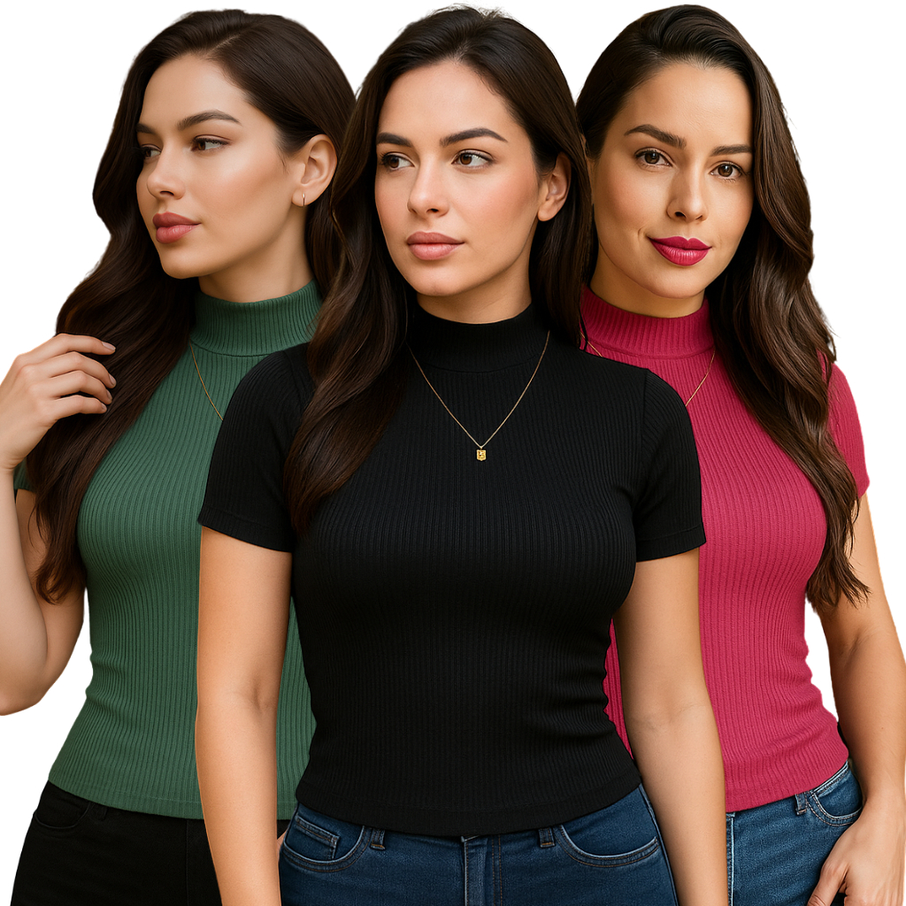Kit 3 Blusa Canelada Feminina Manga Curta Gola Alta