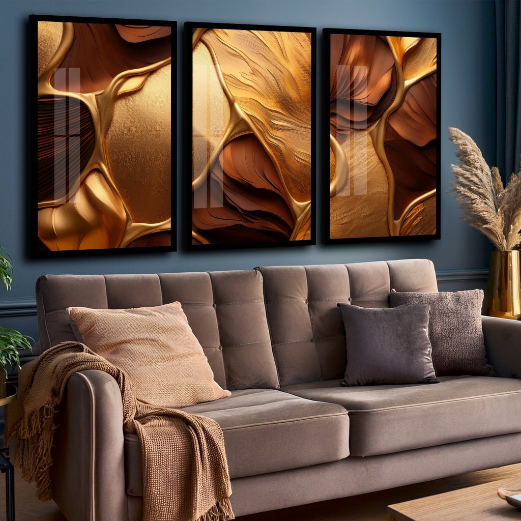 Quadro Decorativo Abstrato 3Peças Luxo Dourado e Marrom Sala de Estar MDF Parede Moderna Sofisticada