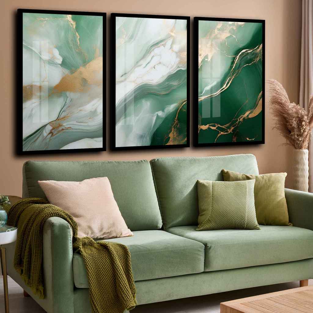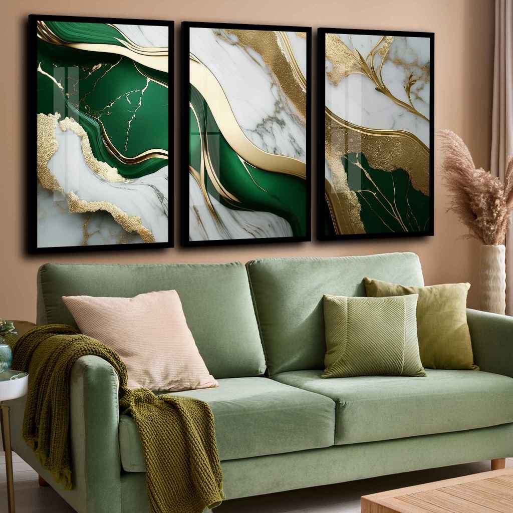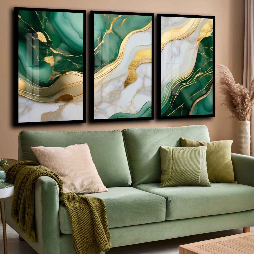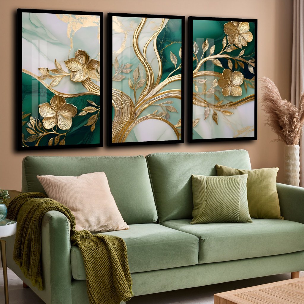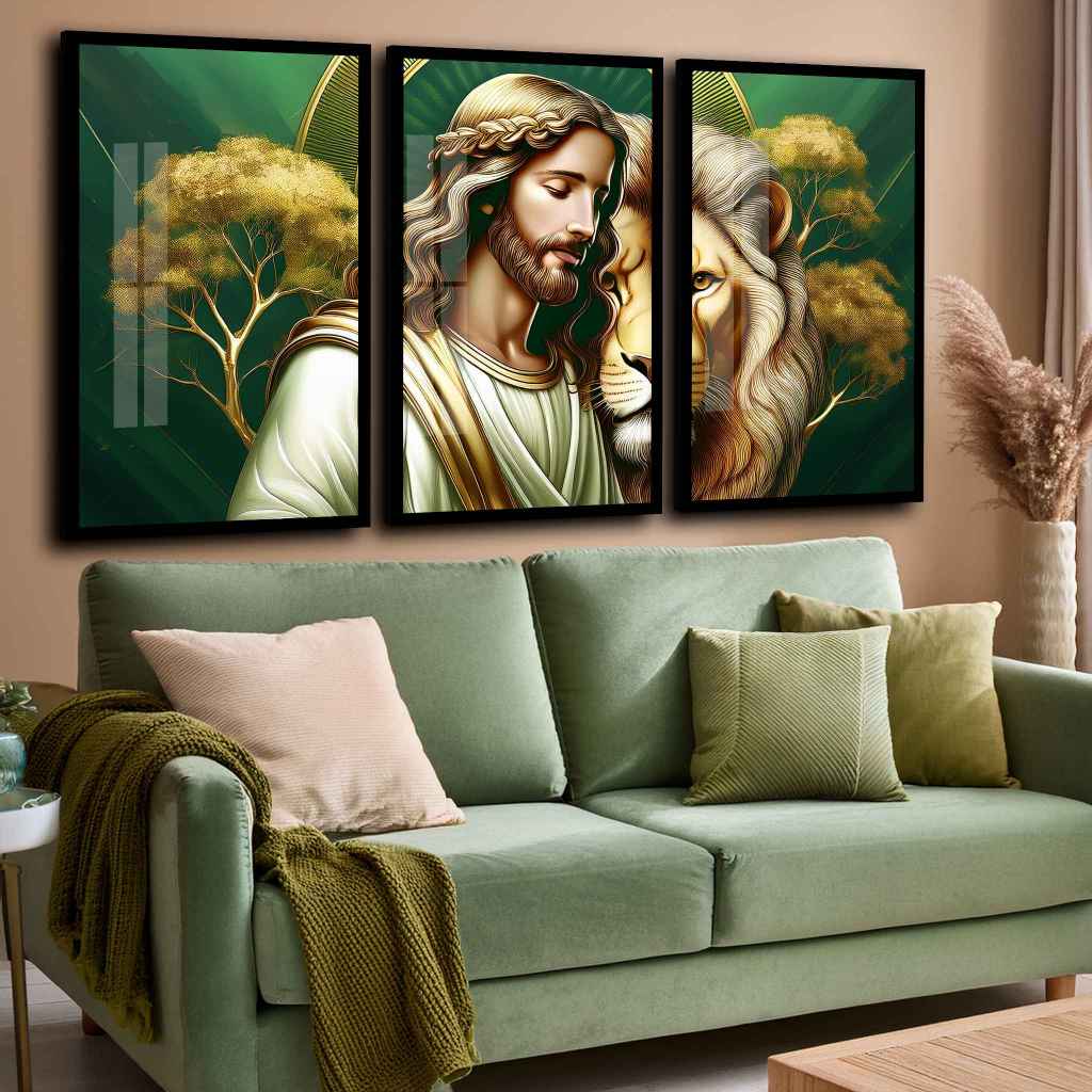 Quadro Decorativo Jesus e Leão Verde Dourado | Kit 3 Peças Sala Religioso Luxo