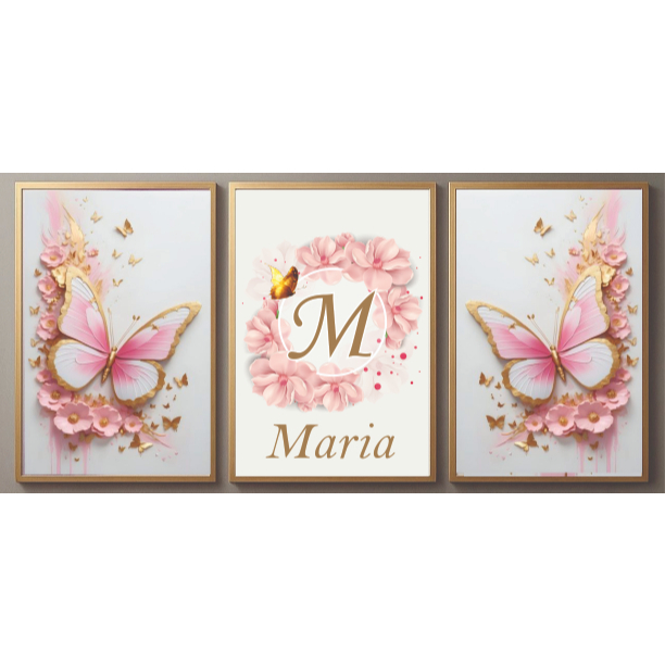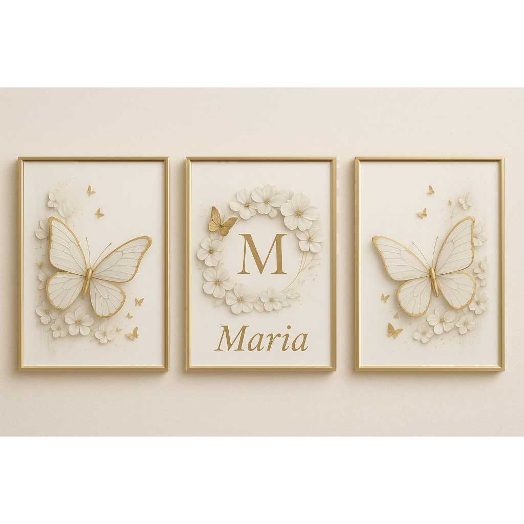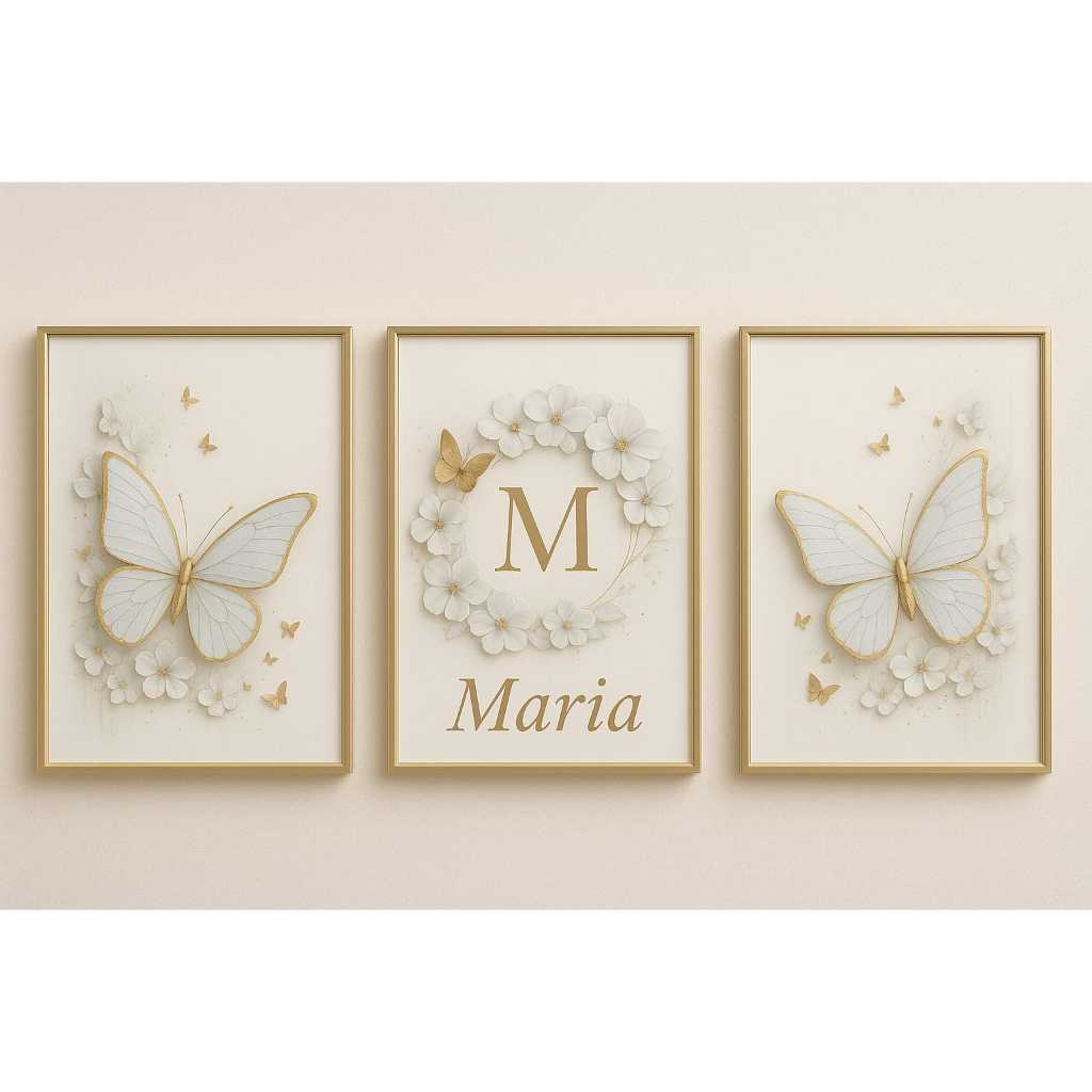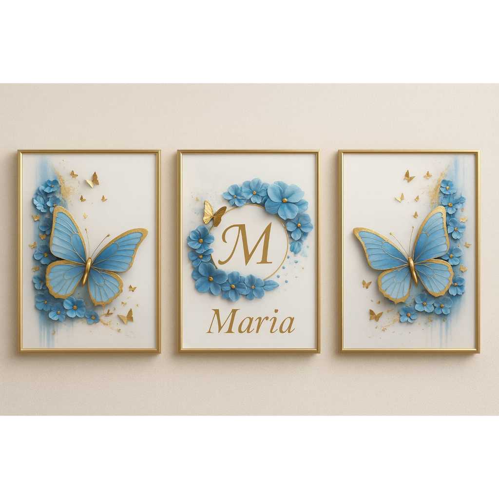 KIT - QUADROS DECORATIVO PERSONALIZADO Borboletas Com Dourado, Azuis e Brancas