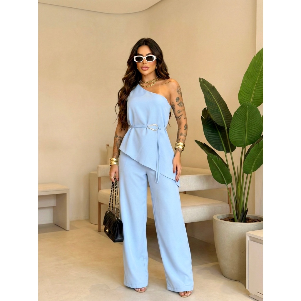 Conjunto Feminino Blusa Um Ombro Elegante Calça Pantalona Chique Com Cinto Fivela Dourado Nº1110-111610