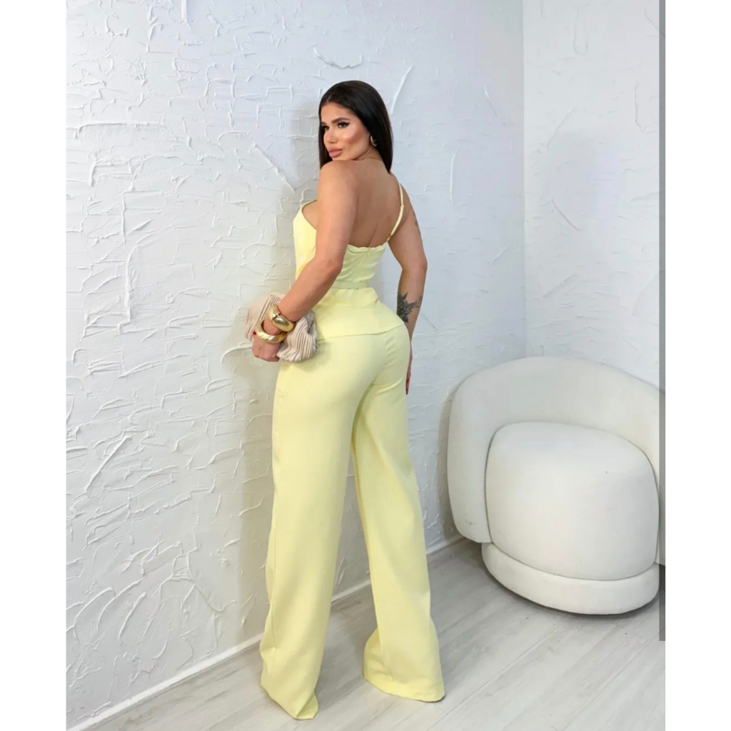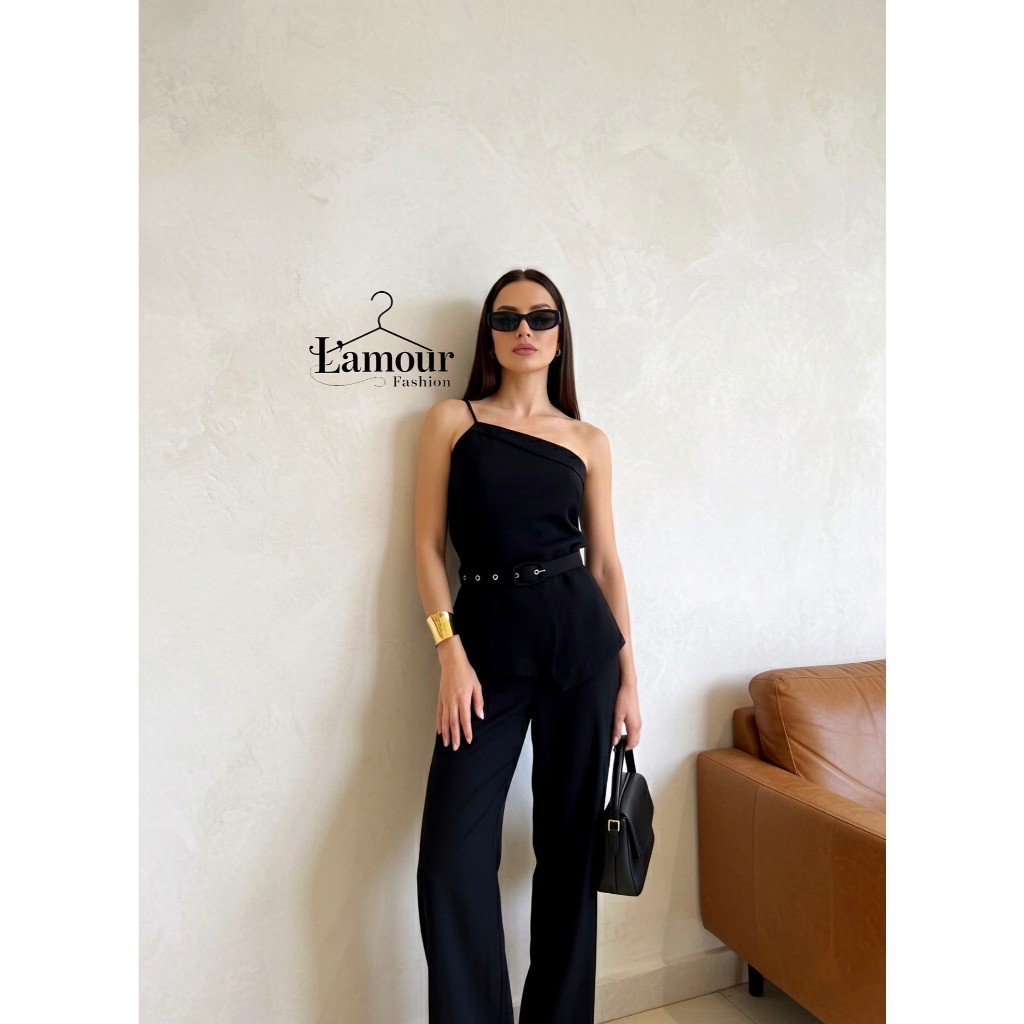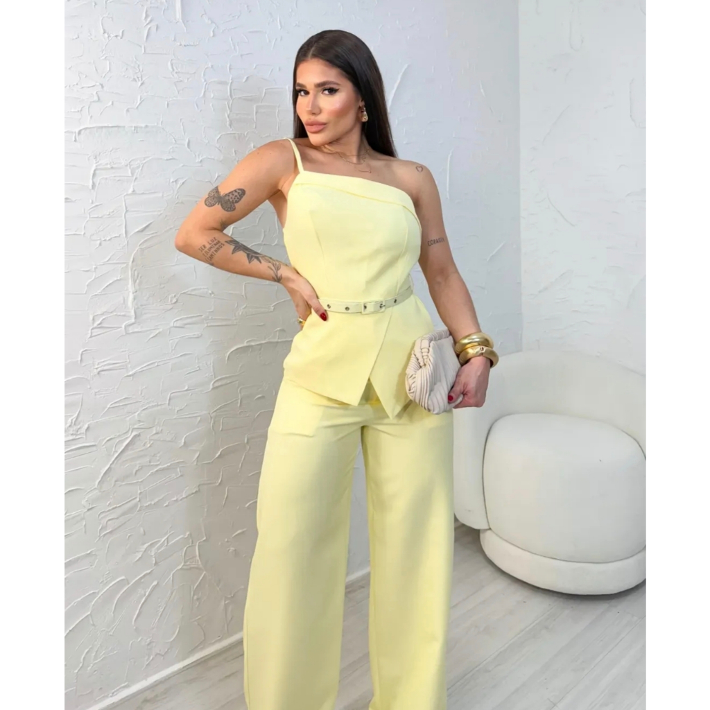 SUPER EM ALTA!!!Conjunto Elegante Feminino Calça Pantalona E Blusa Alça Nula Com Cinto Em Tecido Marrant Codigo 1113l