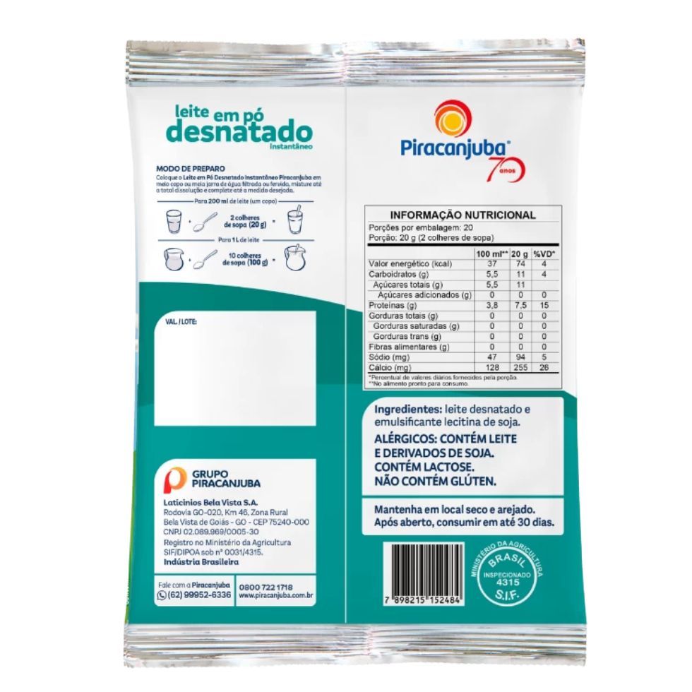 Kit 3 Leite em Pó Desnatado Instantâneo 400g Piracanjuba