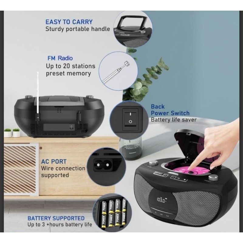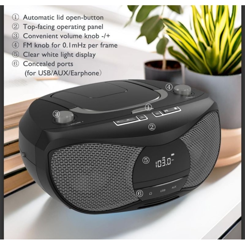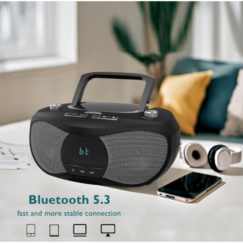 Radio Toca CD Lonpoo LP-D12 Bomboox Com Bluetooth / MP3 / FM / USB / 5W RMS / A Pilha (Nao Incluida) / 230V 50Hz - Preto