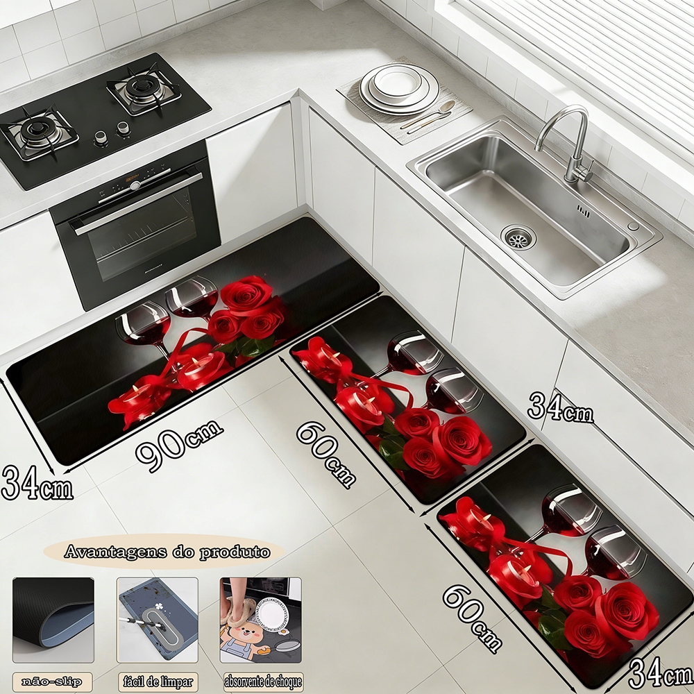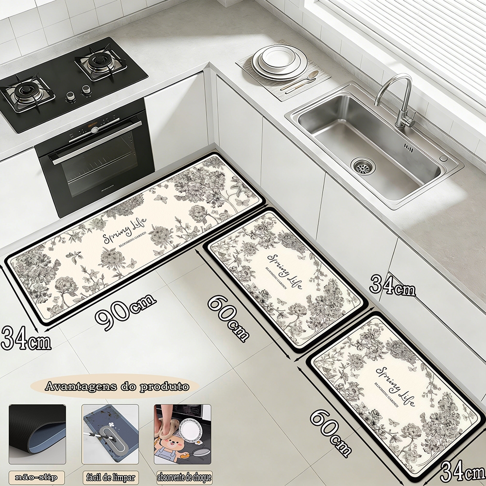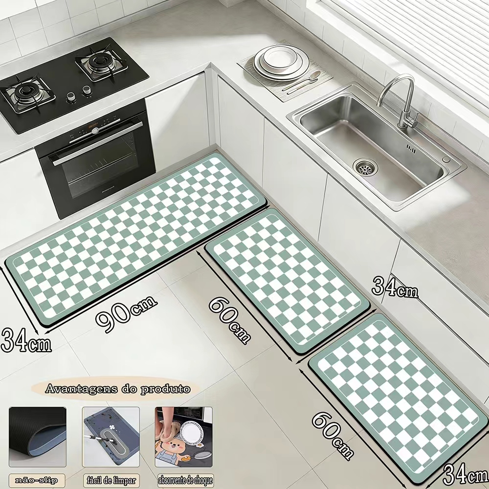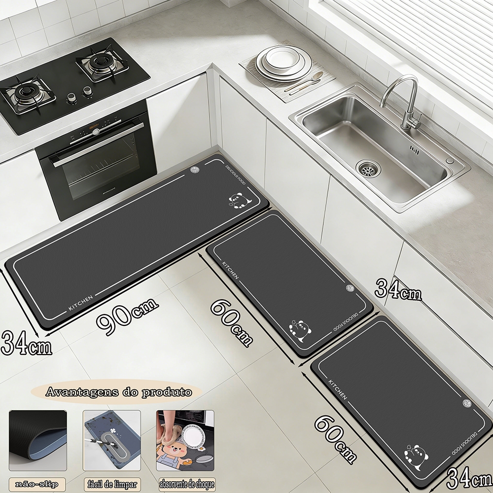 Kit 3 Tapetes de Cozinha - Borracha Antiderrapante, Super Absorvente e Secagem Rápida 90x34 cm, 60x34 cm