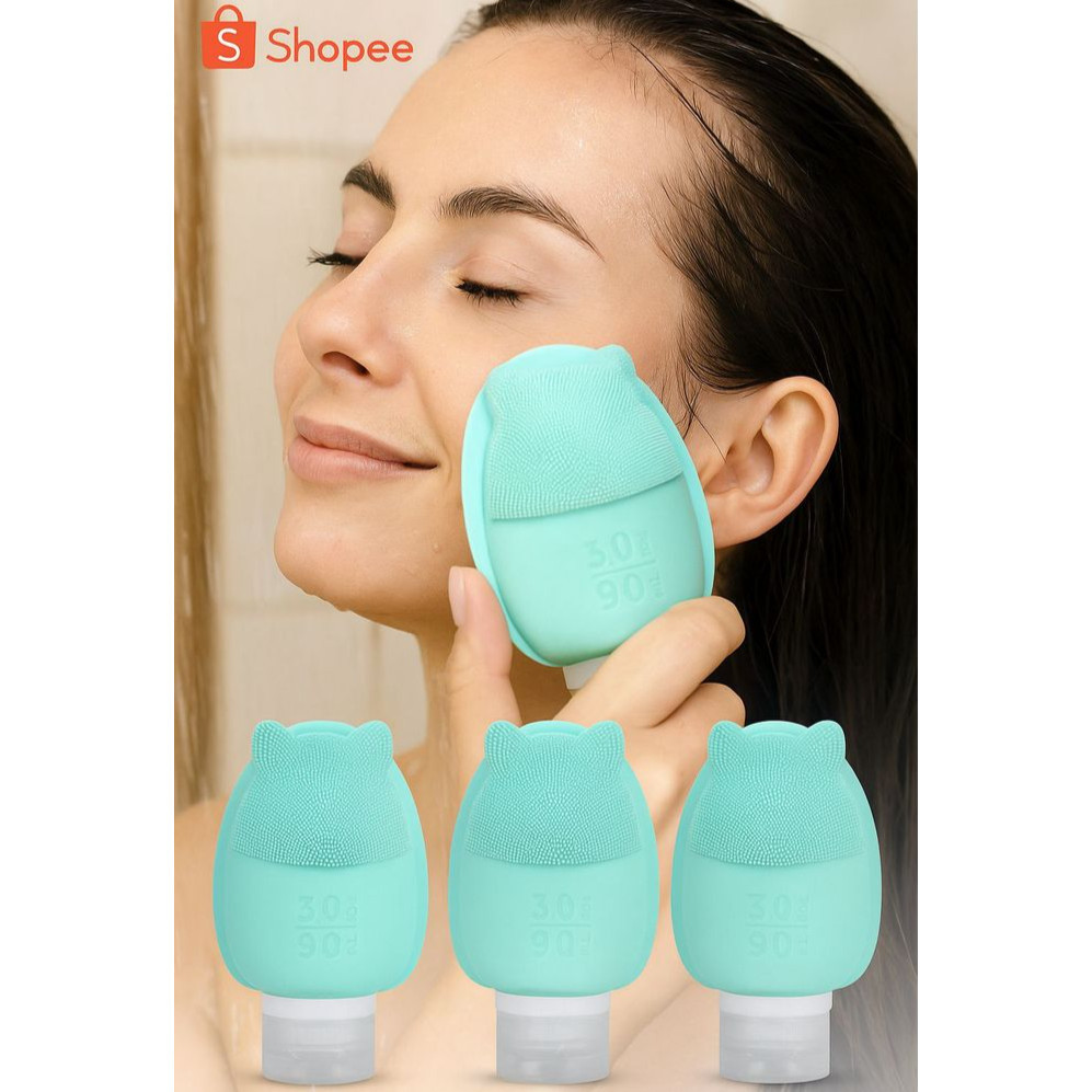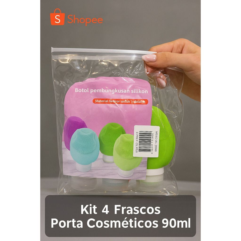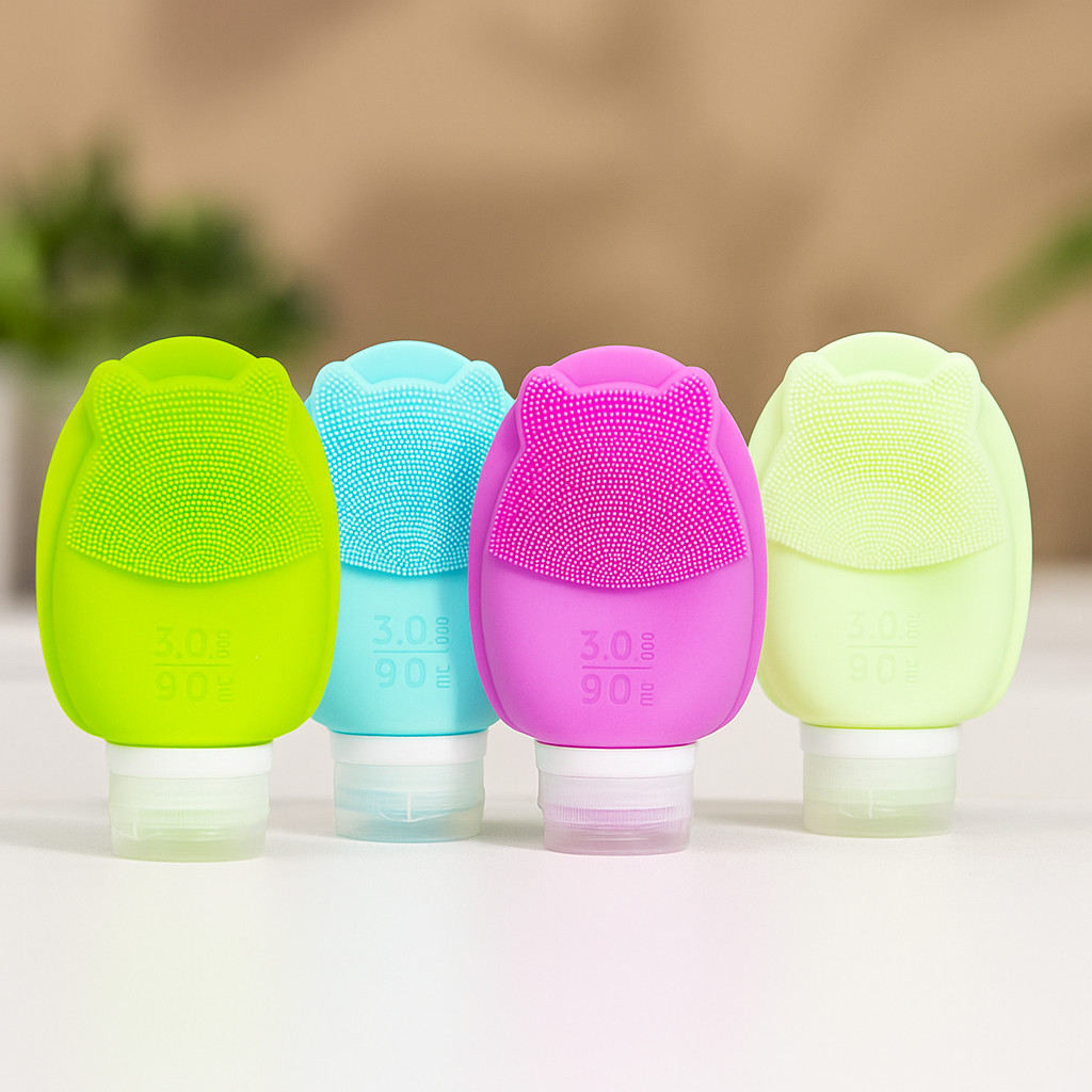 Kit 4 Frascos de Silicone 90ml para Viagem com Escova Facial – Recipiente Portátil para Shampoo, Creme, Loção e Sabonete