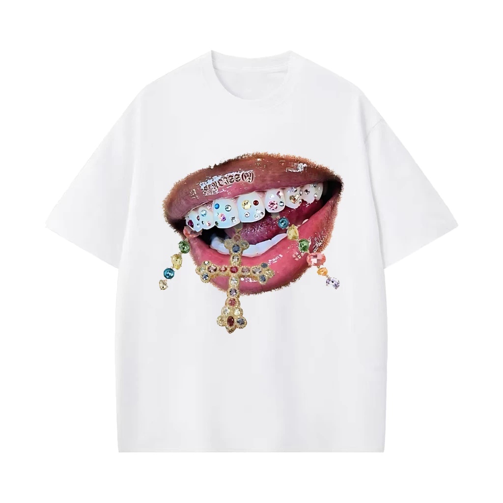T-shirt branca 100% algodão Timeless Art estampa boca Lábios com arte clássica e brilho estilo streetwear fashion