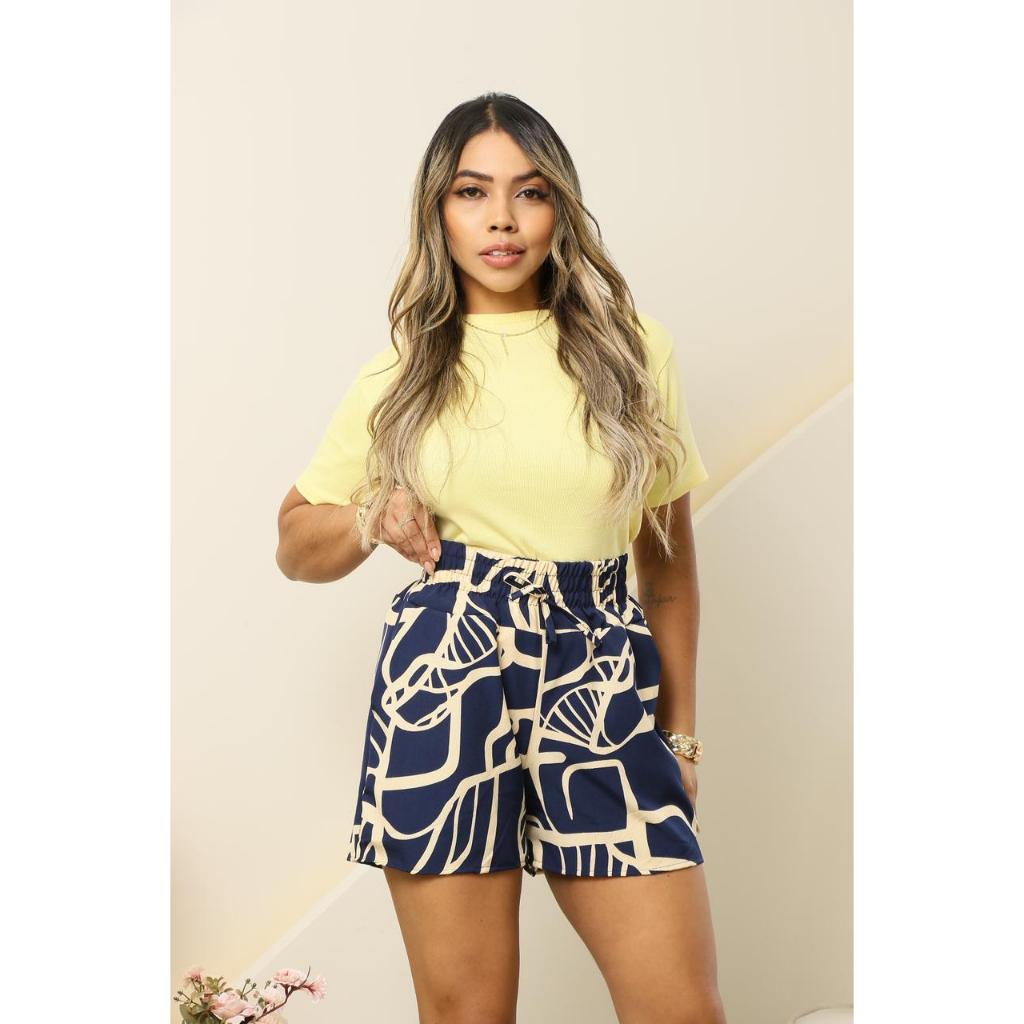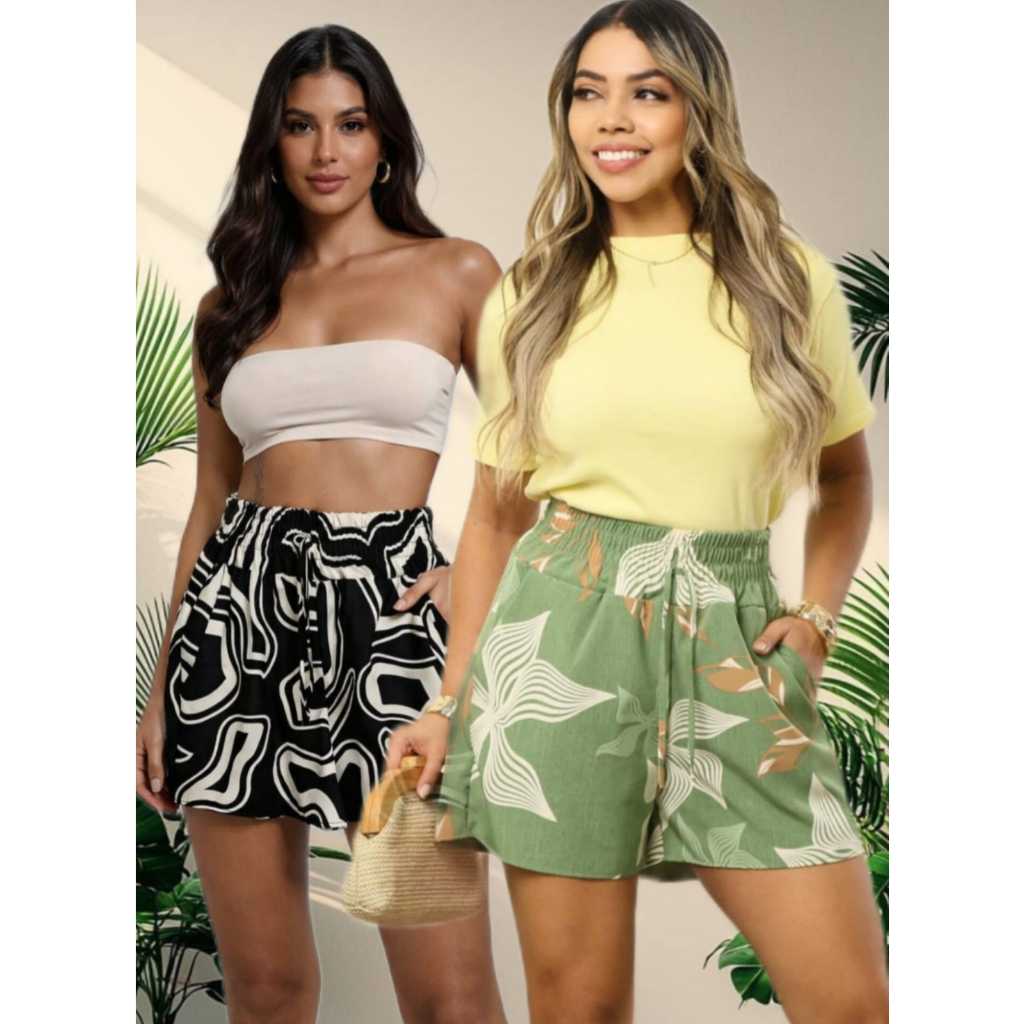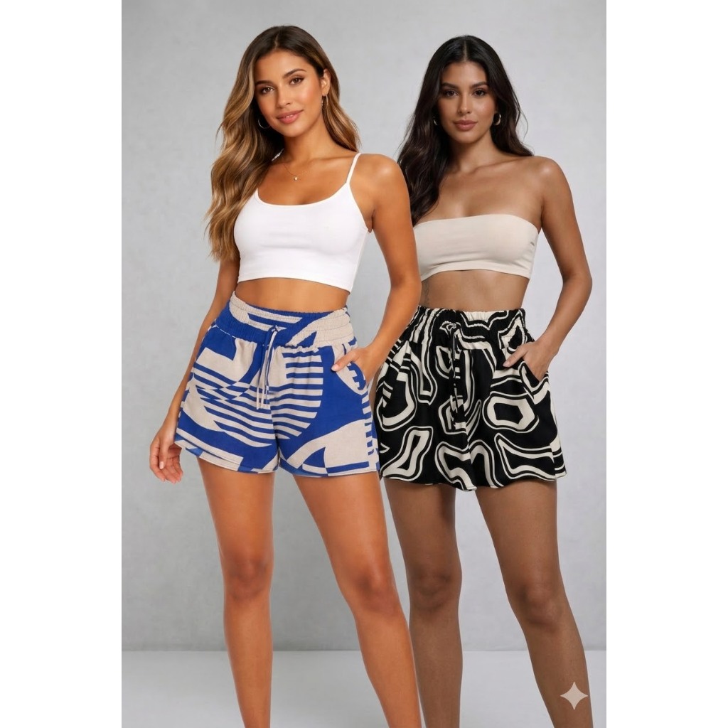 Short Feminino Estampadas Cintura Alta Com Elástico e bolso
