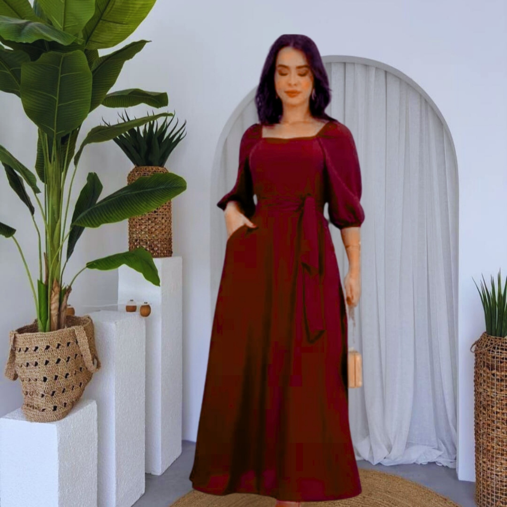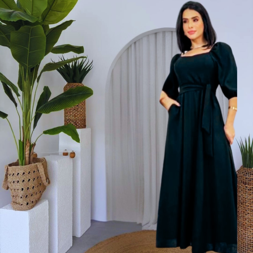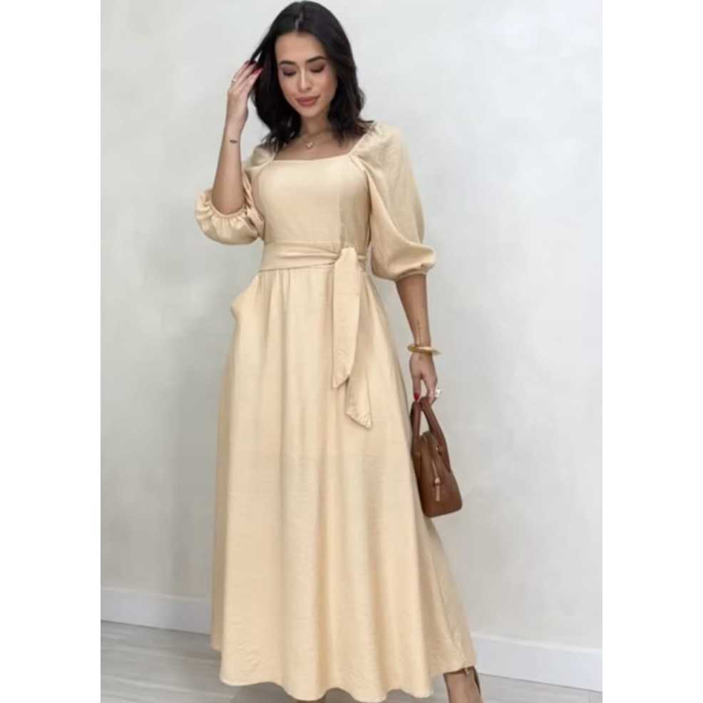 vestido mídi com bojo y mangas con elastico