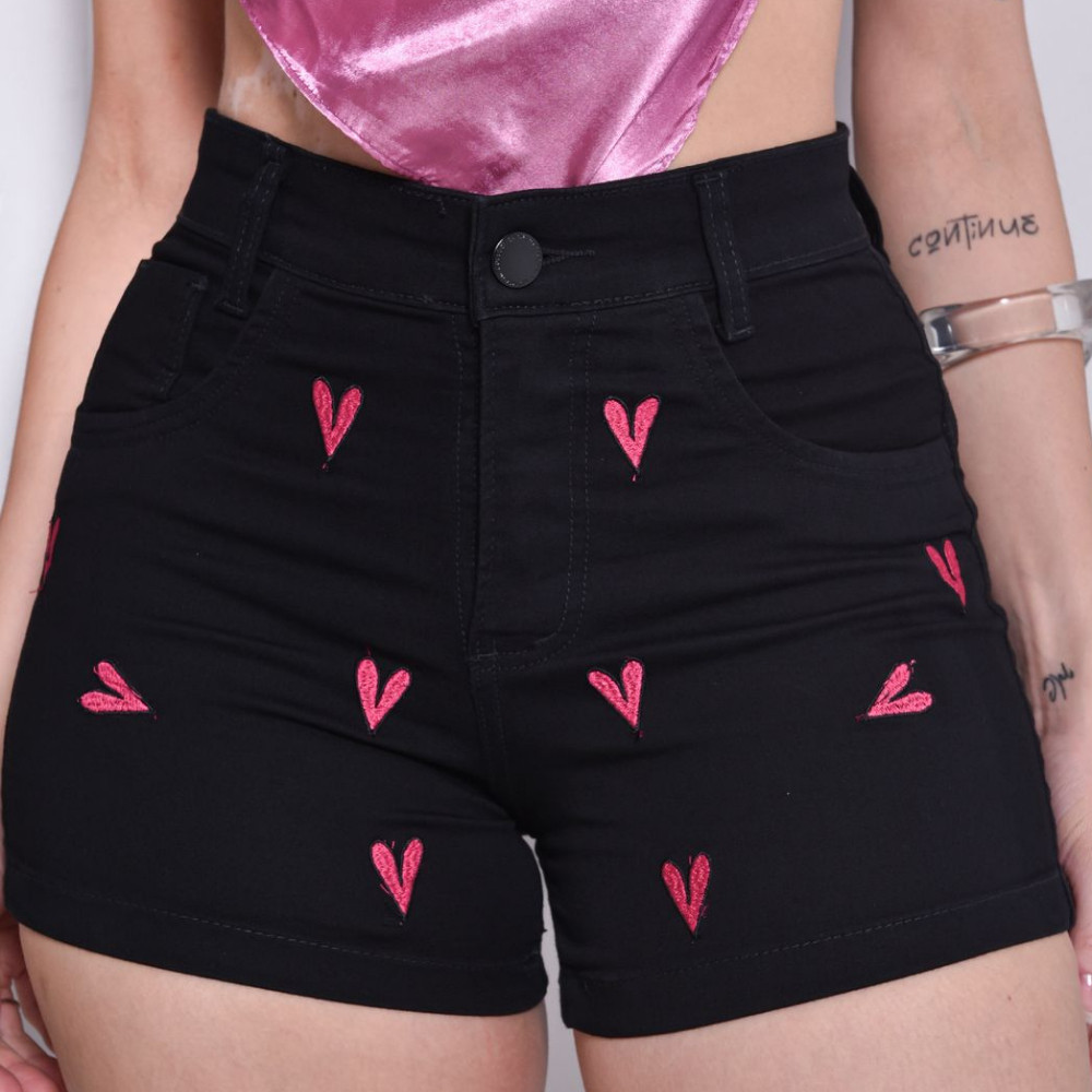 Short Jeans Preto Bordado feminino com lycra cintura alta cos alto confortavel elegante Moda Verão