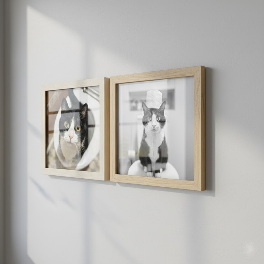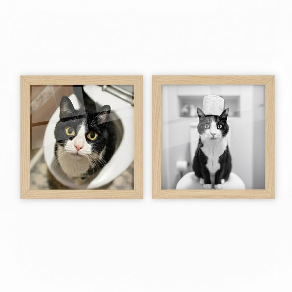 Kit 2 Quadros 18x18 Cm Banheiro Gato Moderno Preto e Branco