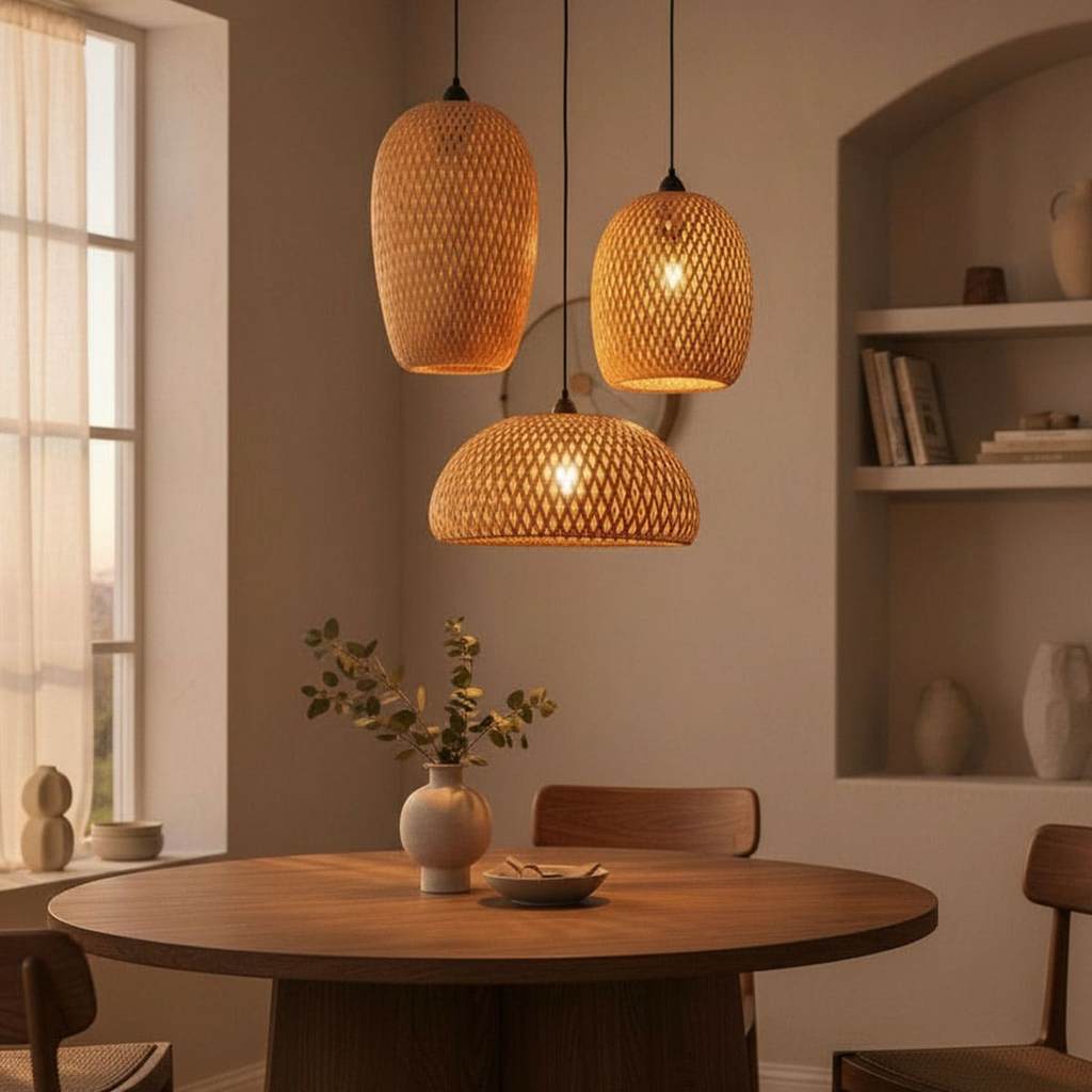 Conjunto Lustre Bambu Rattan 3un Pendente Luminária de Teto Lustre Artesanal Sala Cozinha Área Festa