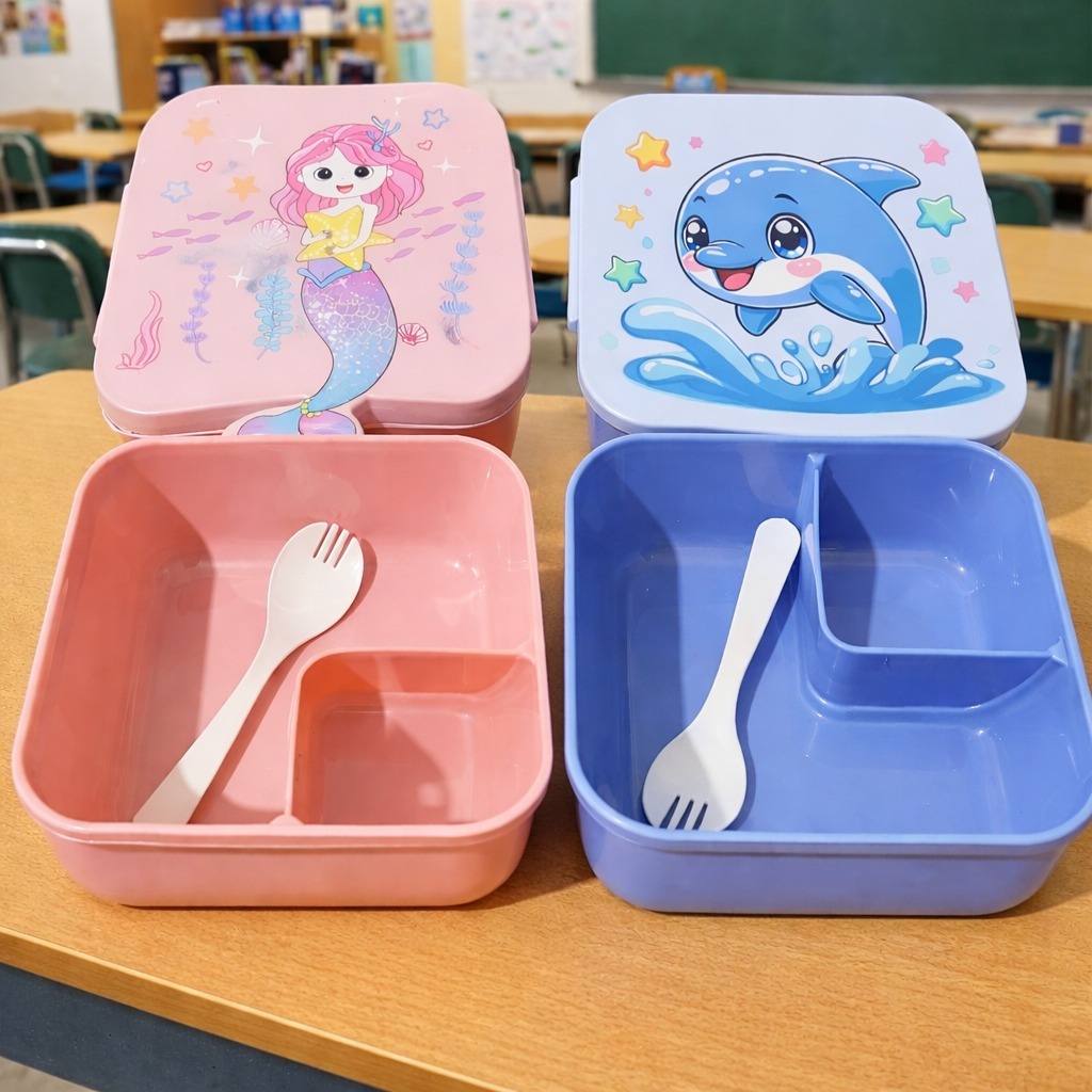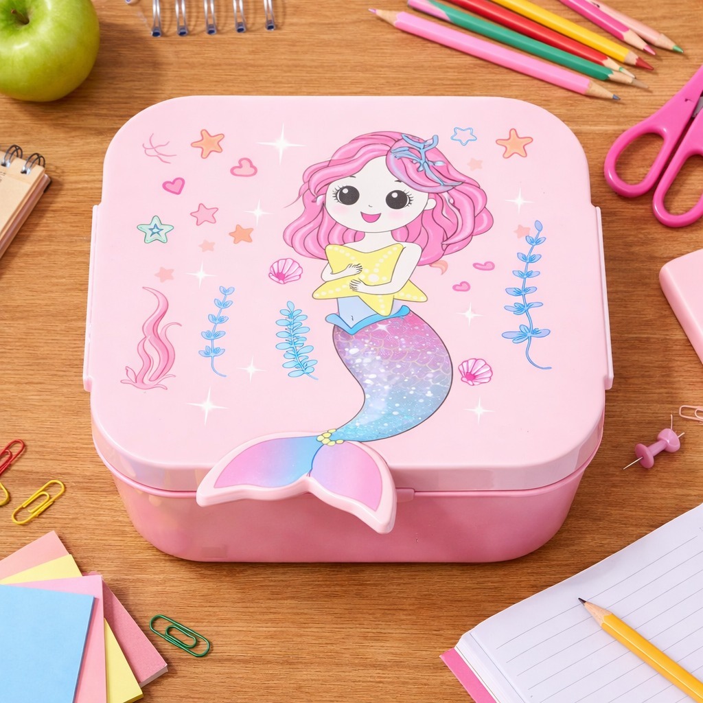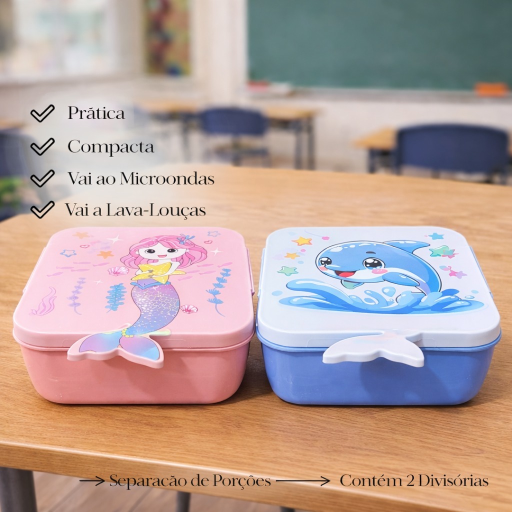 Marmita Infantil Escolar com Divisória e Colher Lancheira Kids Sereia Golfinho BPA Free Rosa Azul