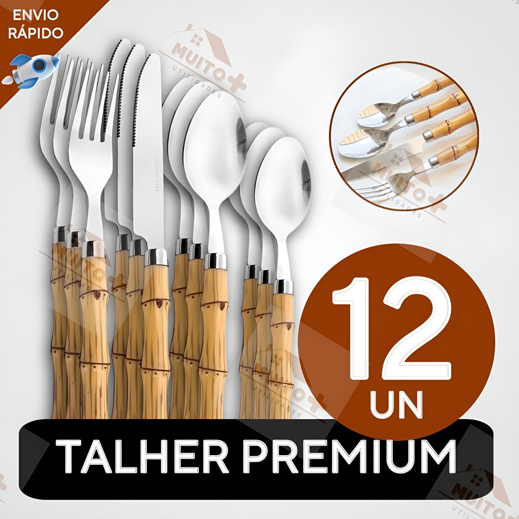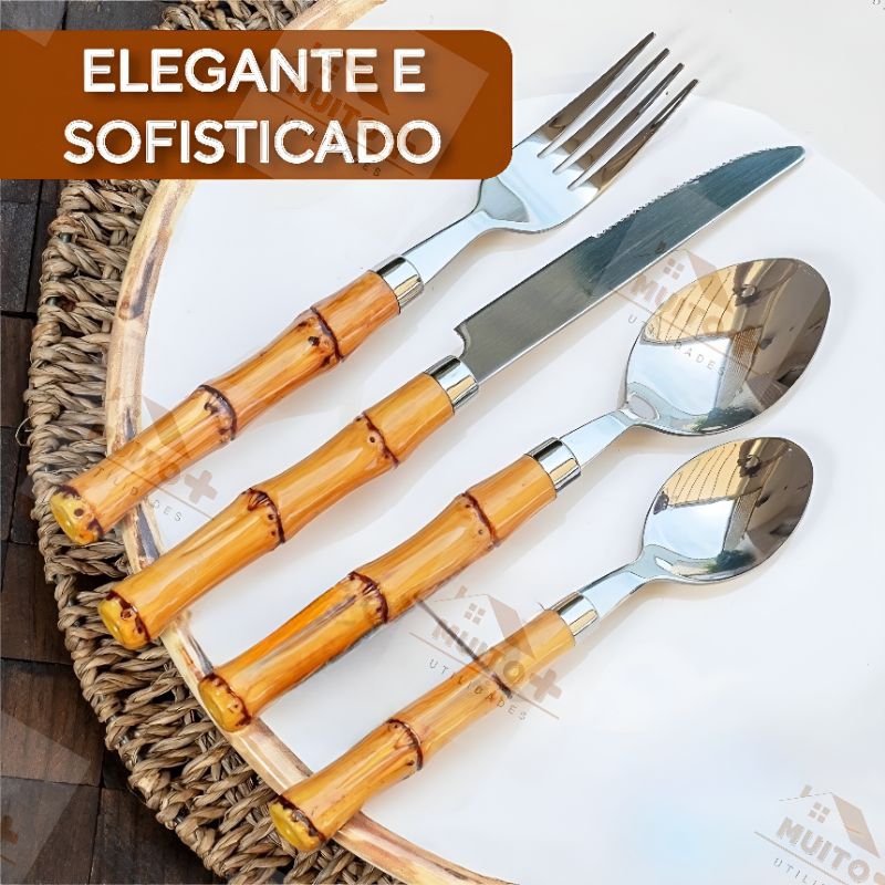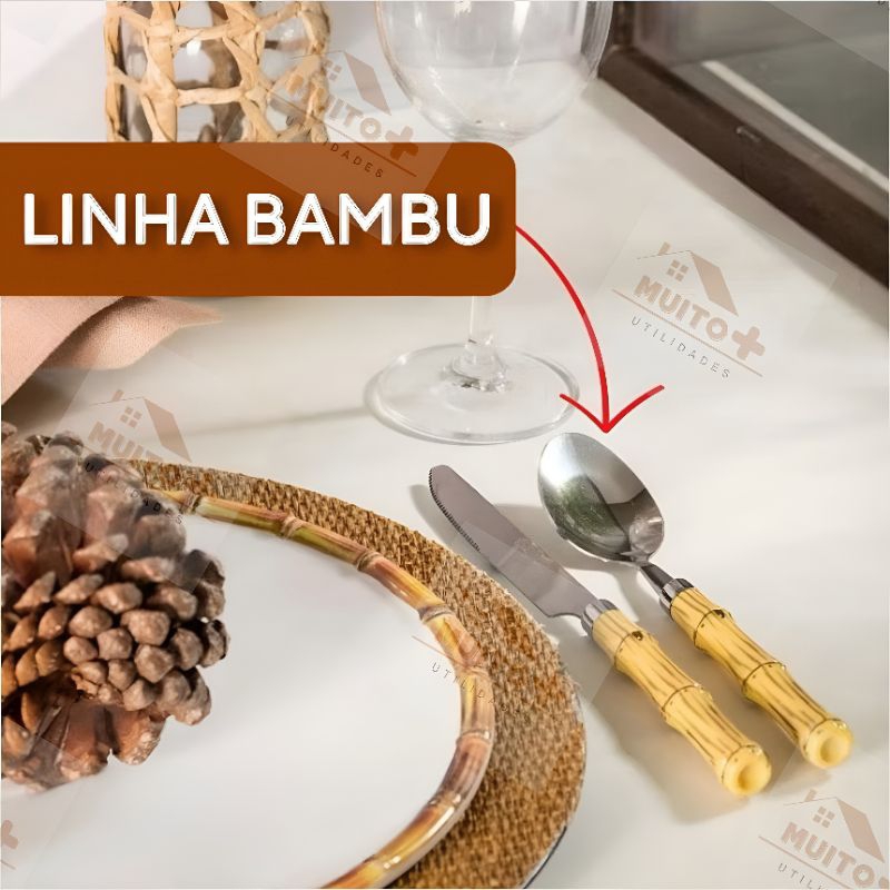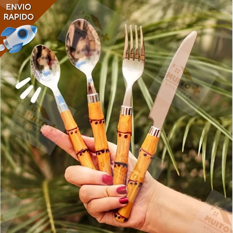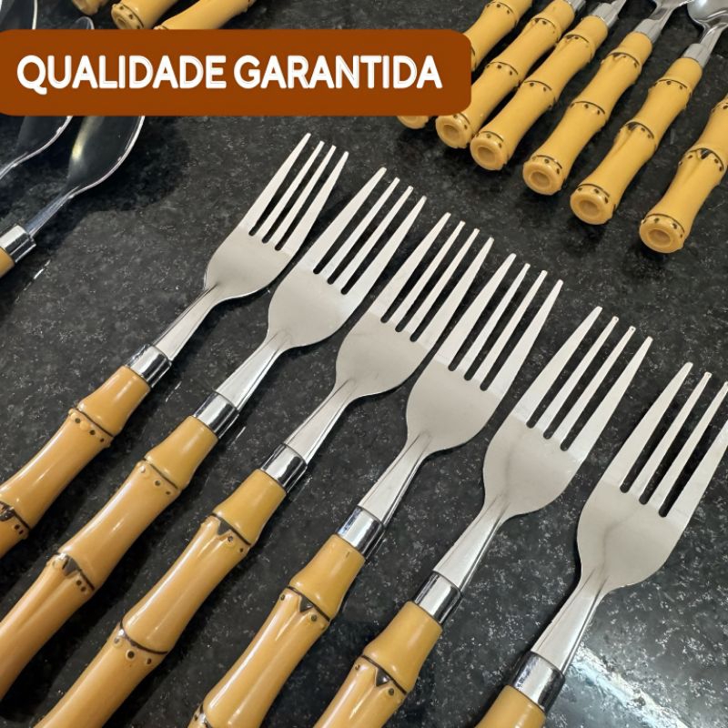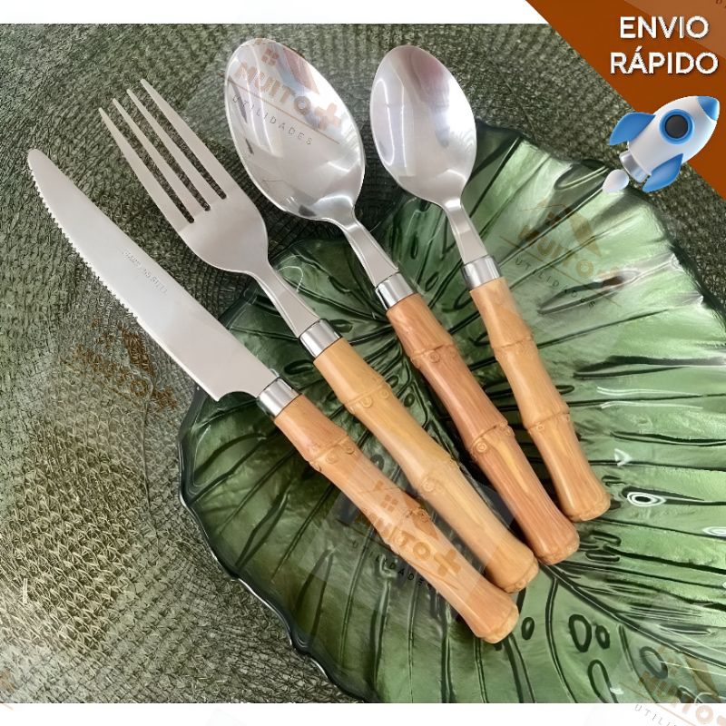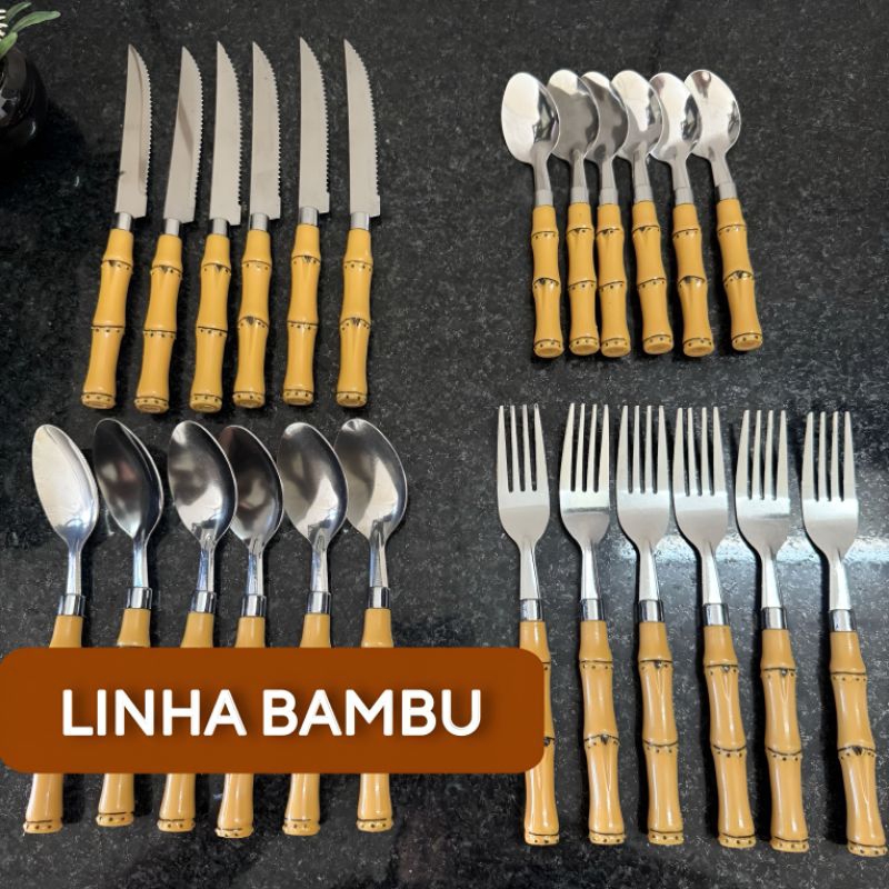 Jogo de Talheres 24 Peças Facas Garfos Colher e Colheres de Sobremesa Em Aço Inox de Cabo Plástico Bambu
