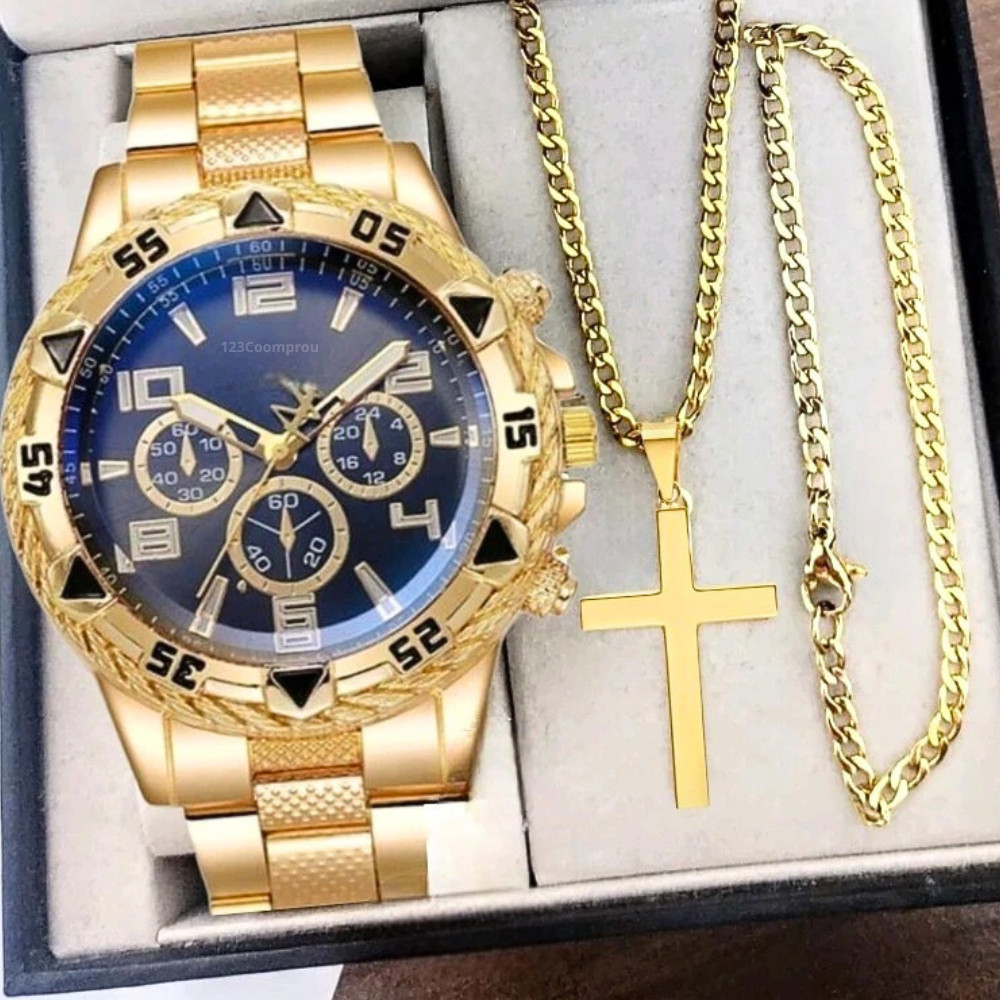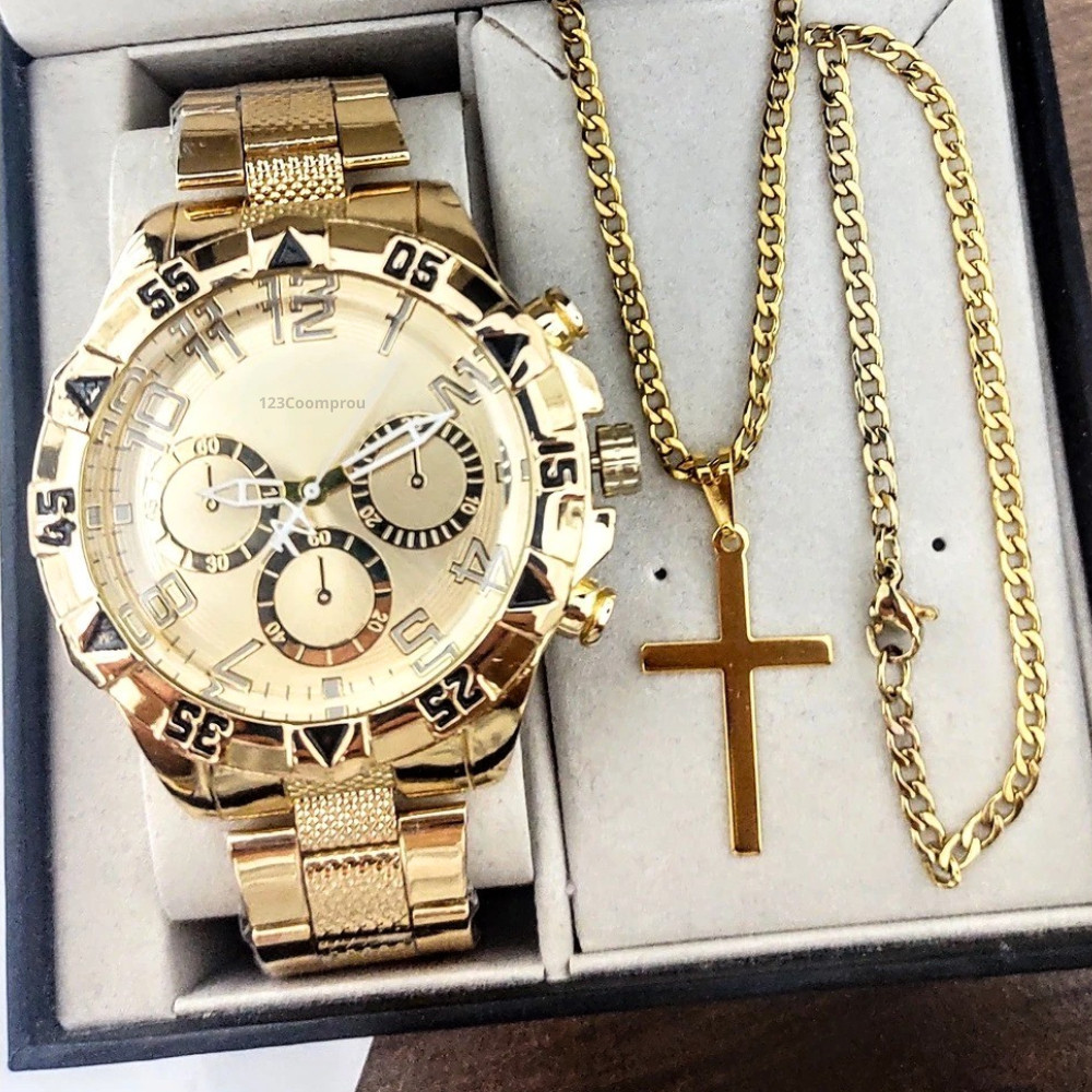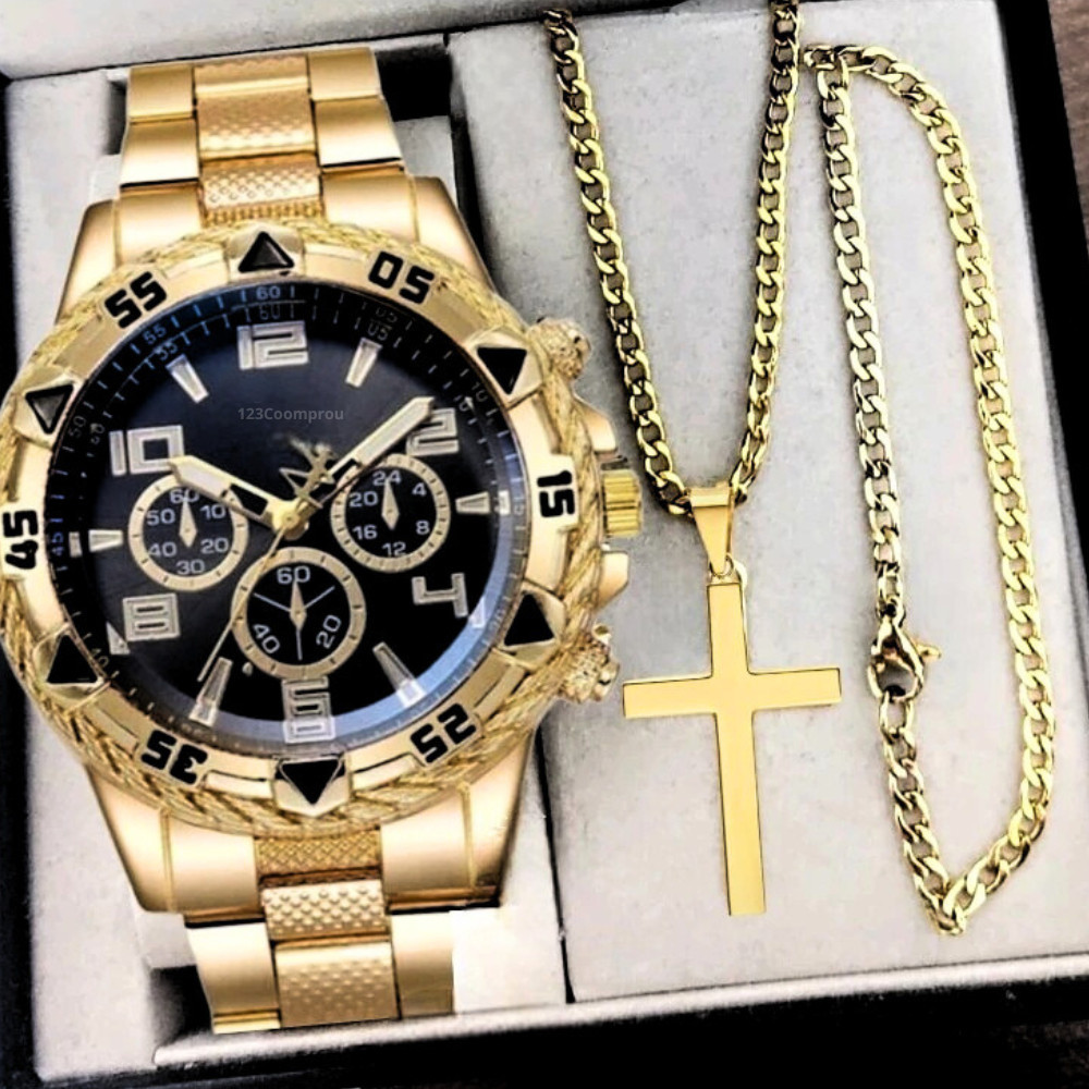 Kit Relógio Masculino Aço Inox Resistente a Água Com Corrente Cruz e Pulseira Presente Dia Dos Pais