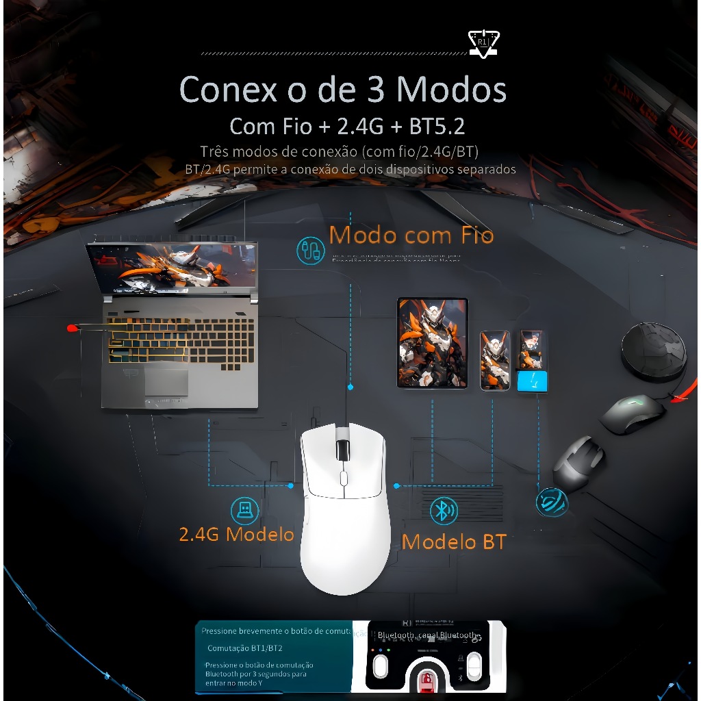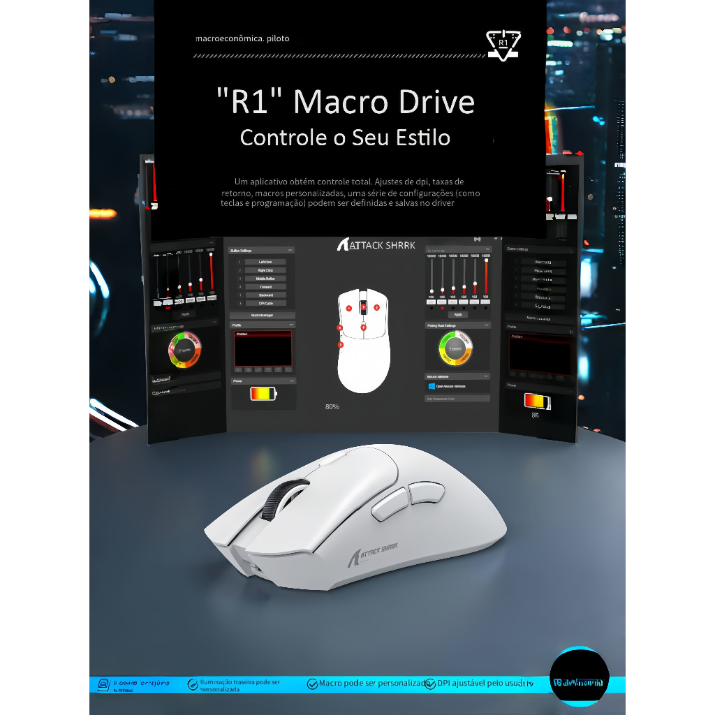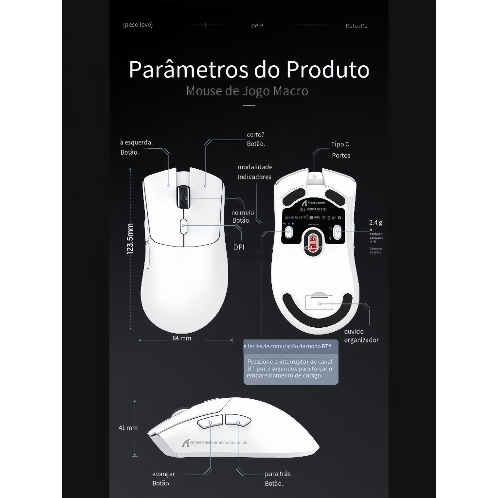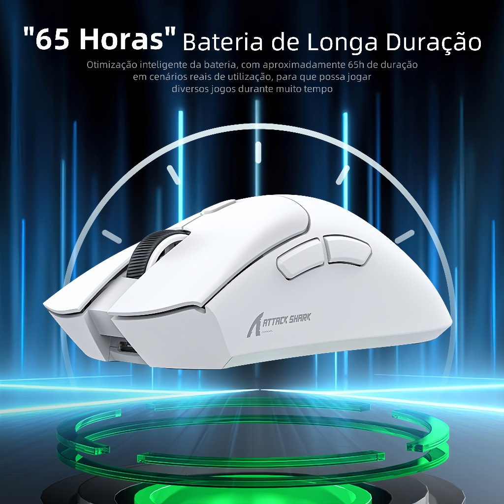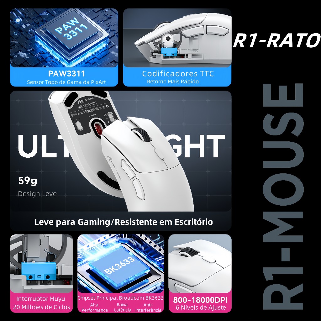 Attack Shark R1: Rato 59g Tri-Mode BT5.2/2.4G/USB-C, Sensor PAW3311 18K DPI/400IPS/40G, 65H Bateria